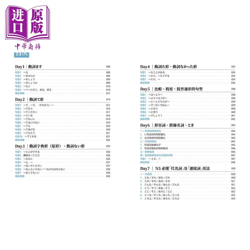 主题式组成,按部就班,一个月就能熟悉N5考试重点的34个句型、7组代名词、5组连接词、49个副词、15个助词、26个数量词,考前冲刺没问题。