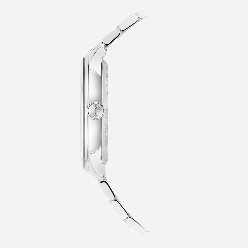 镜面 材质 | 双面镀防眩目涂层蓝宝石玻璃 | 表盘 | 丝光打磨不锈钢表壳 银色表盘 日期显示 优质威塞尔顿钻石时标 透底 |