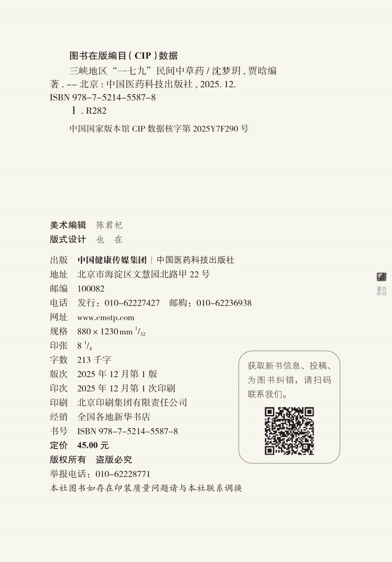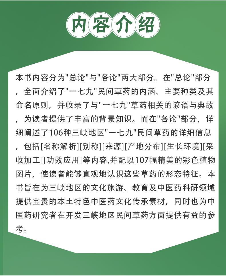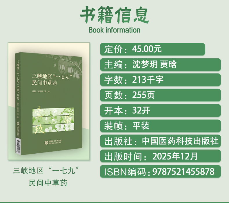 三峡地区“一七九”民间中草药 沈梦玥 贾晗 主编 详细阐述了106种三峡地区“一七九”民间草药的详细信息 中国医药科技出版社