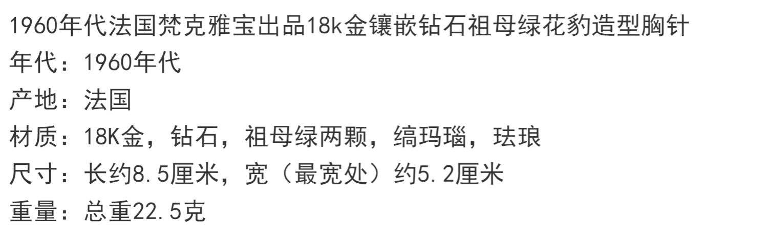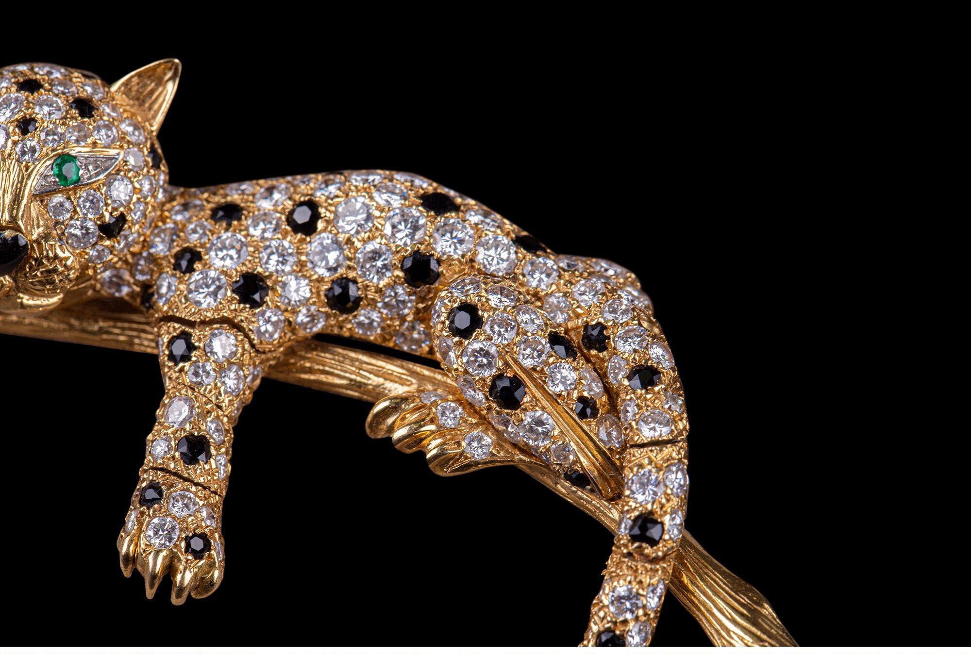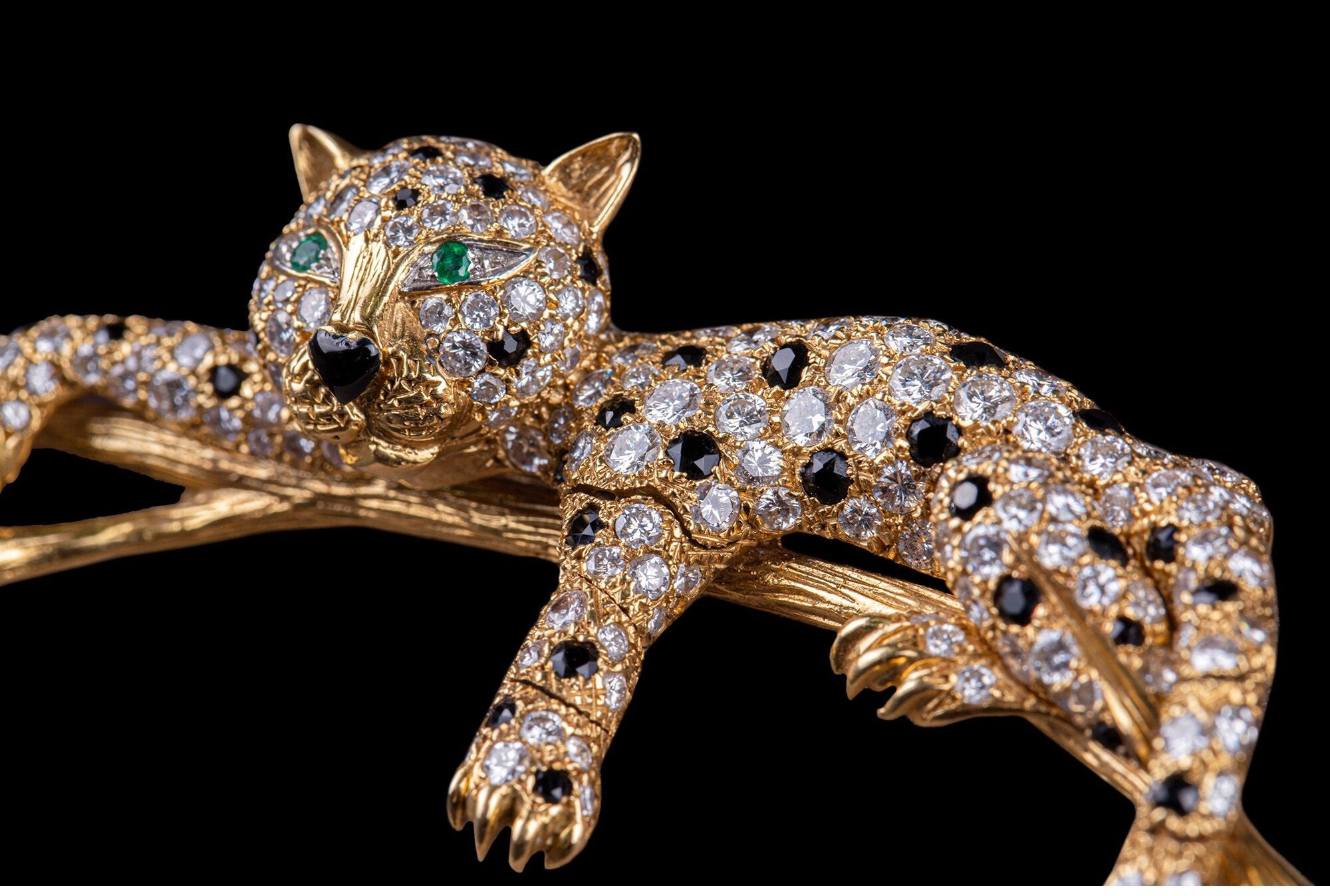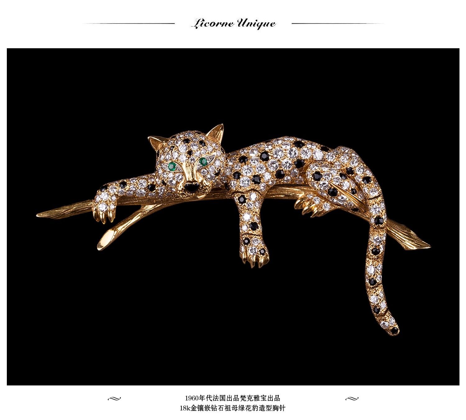 独角鹿西洋古董珠宝首饰法国18K金镶嵌钻石祖母绿花豹造型胸针