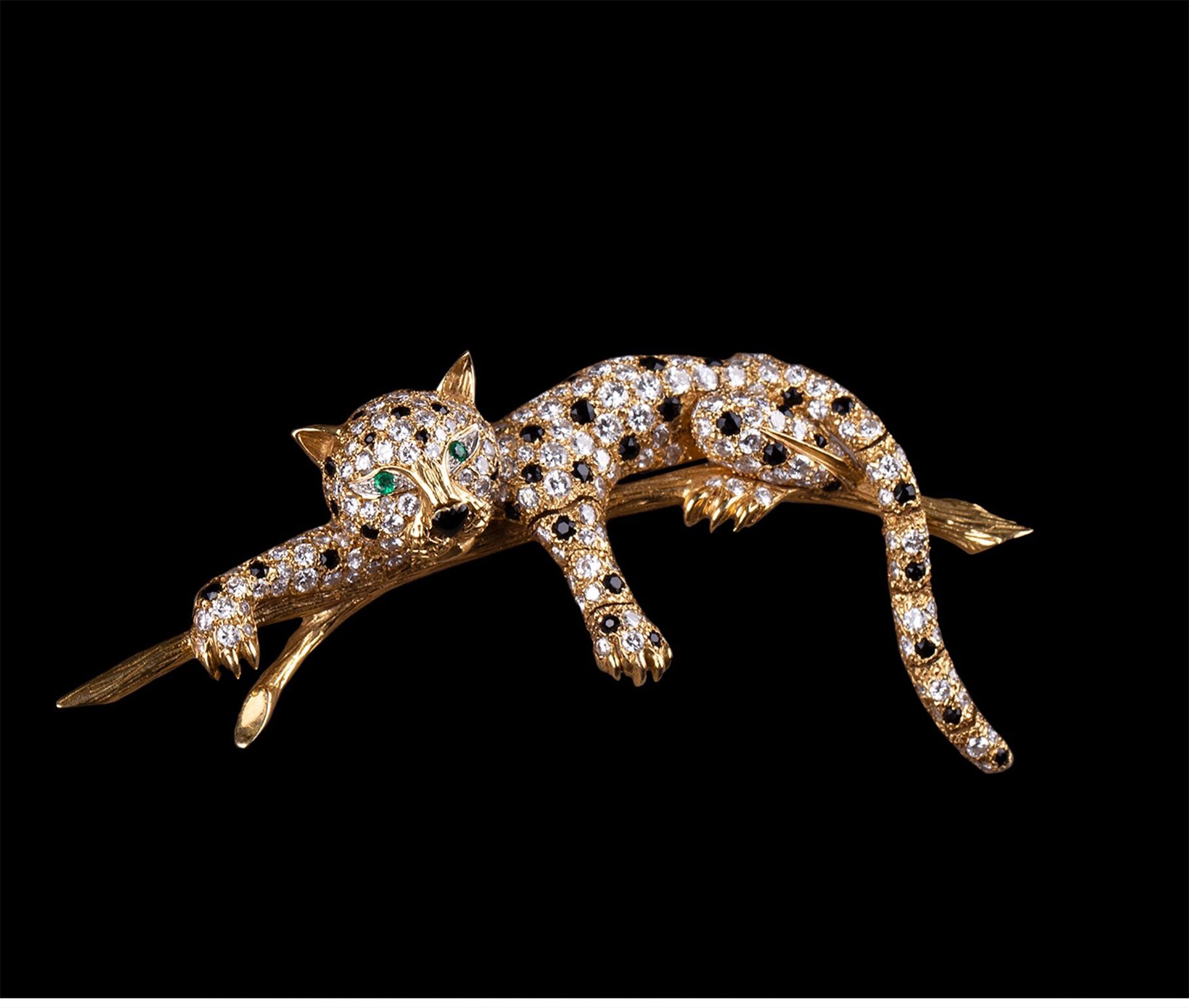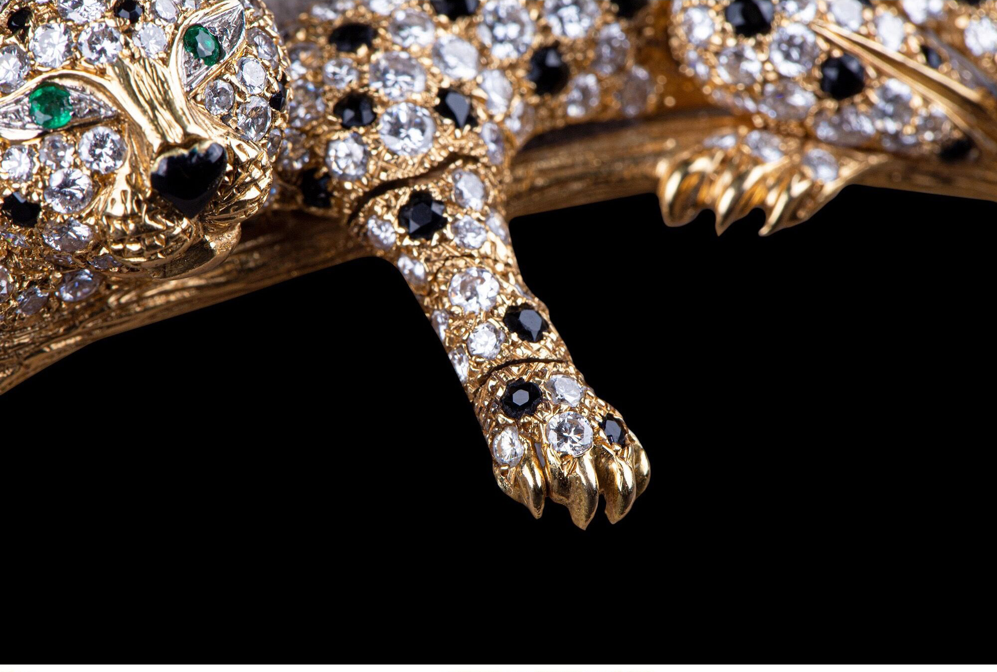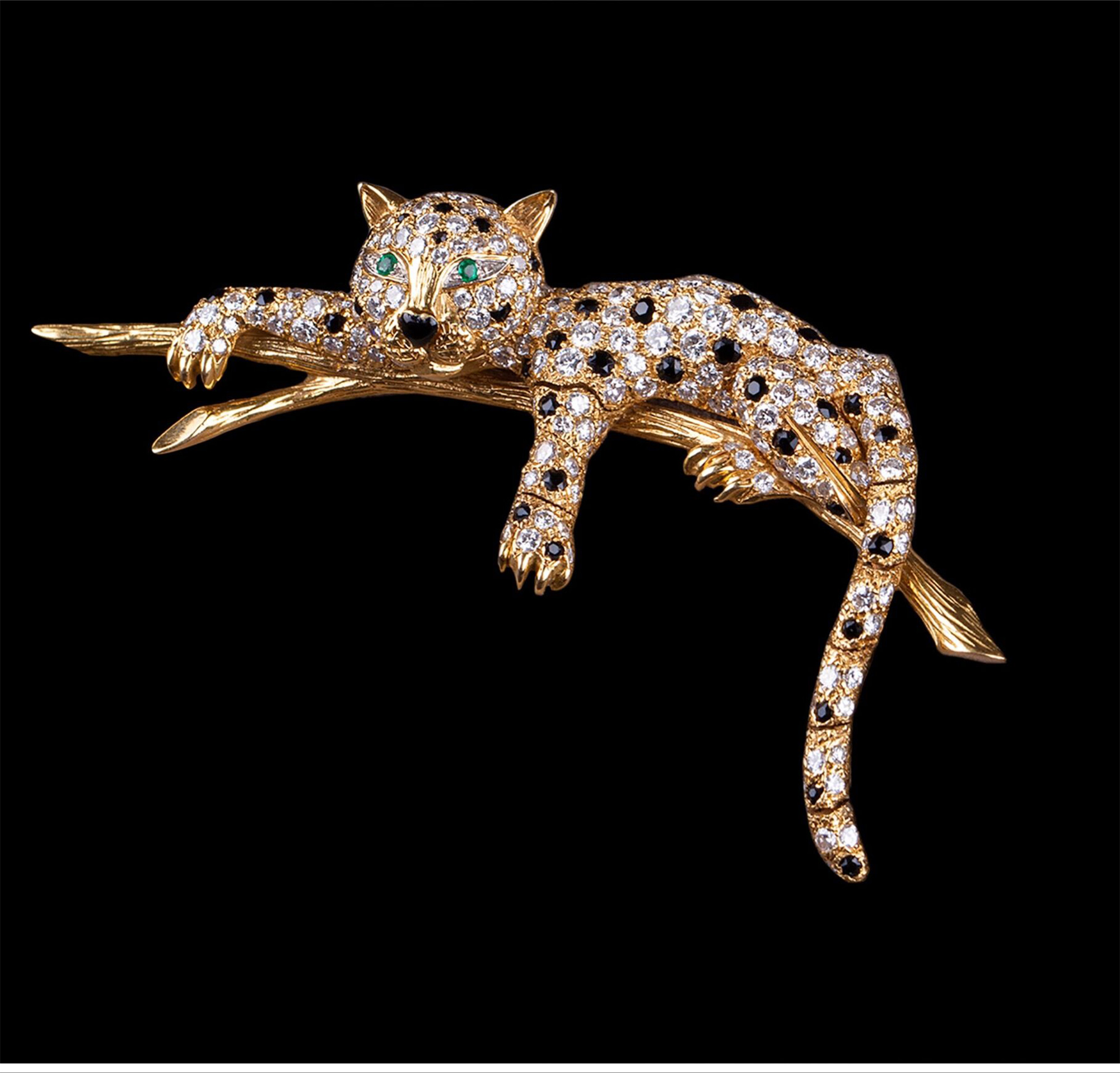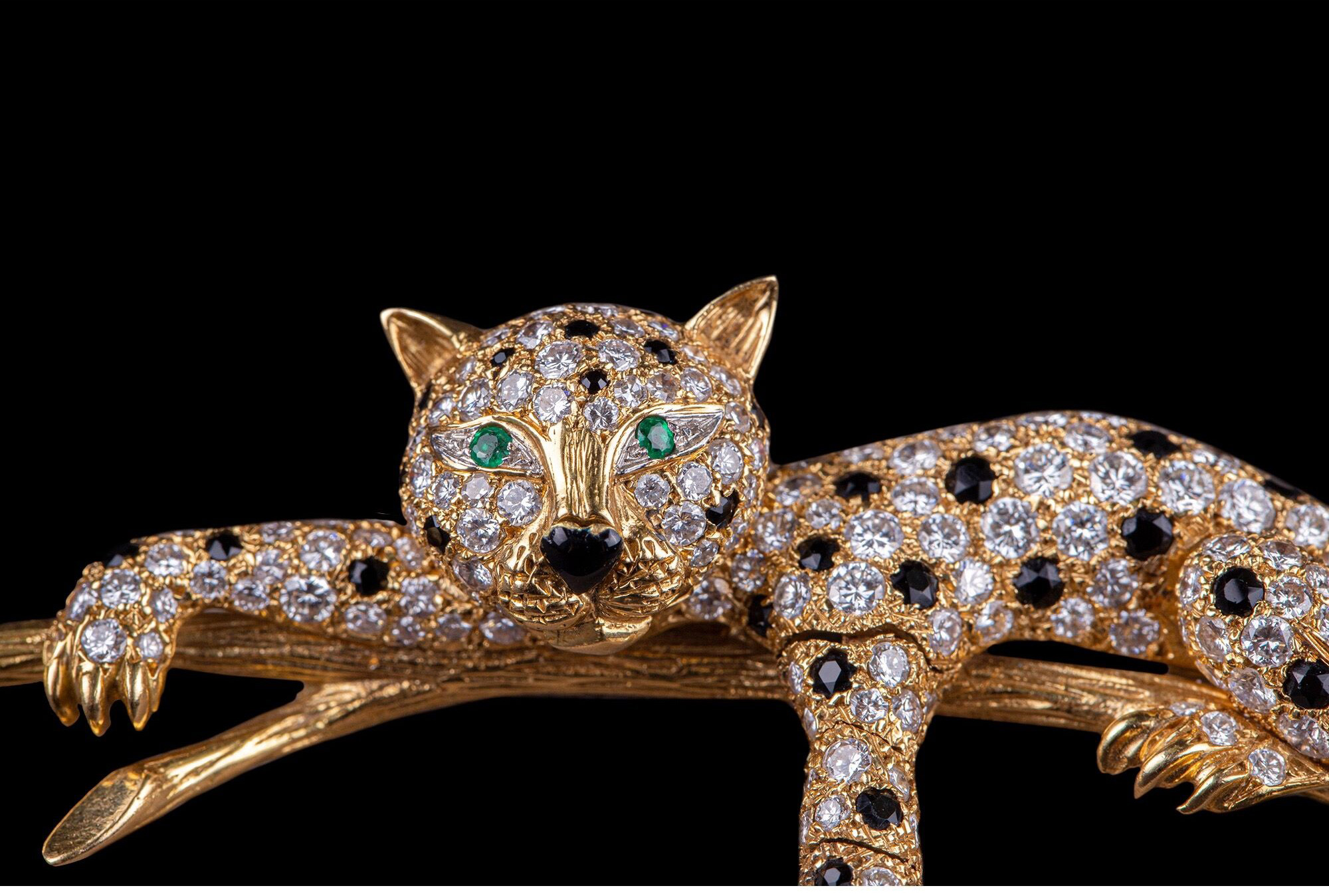 独角鹿西洋古董珠宝首饰法国18K金镶嵌钻石祖母绿花豹造型胸针