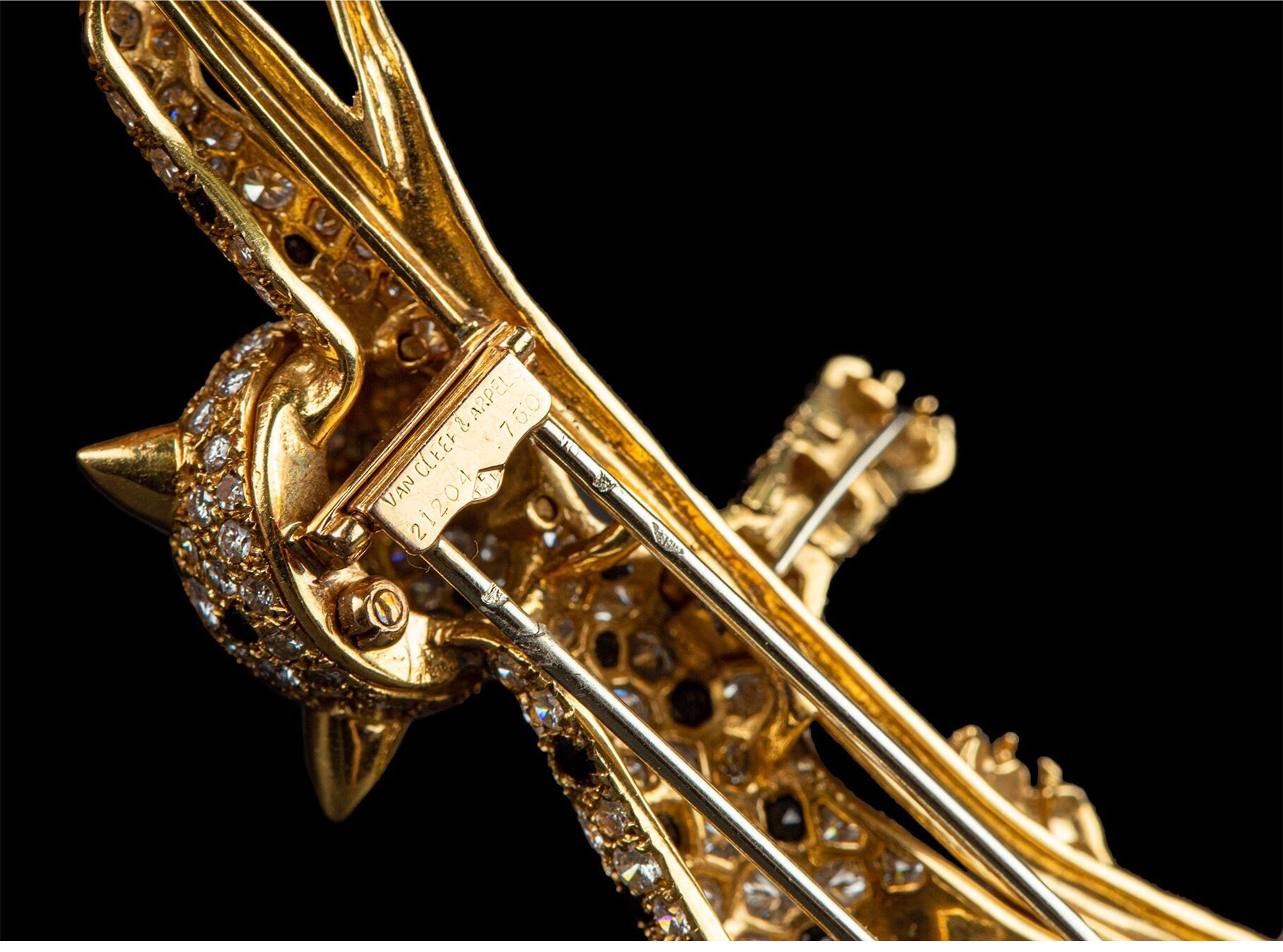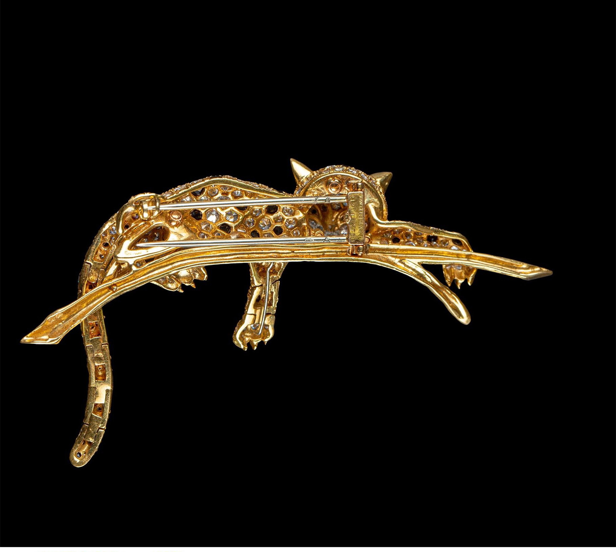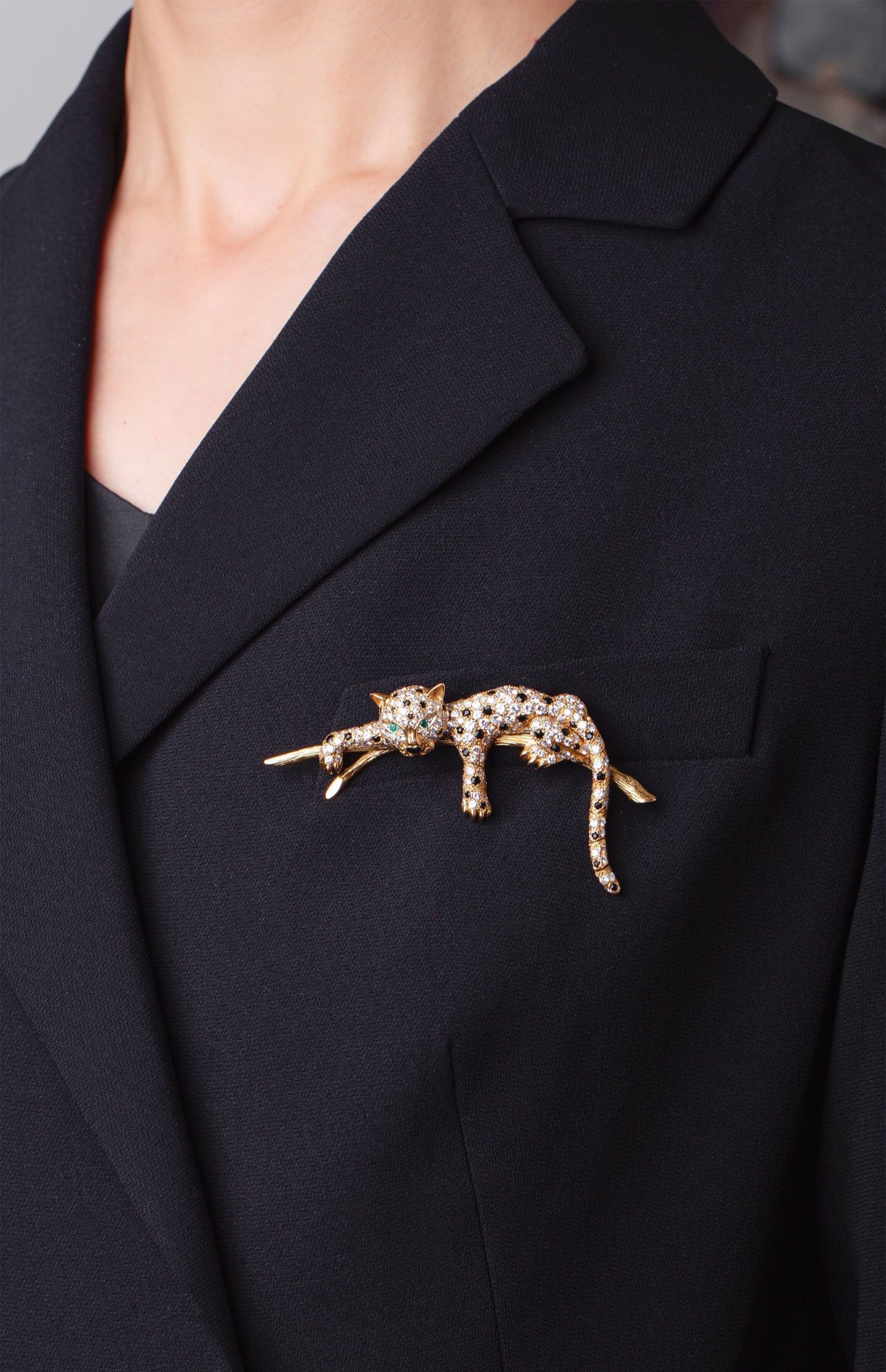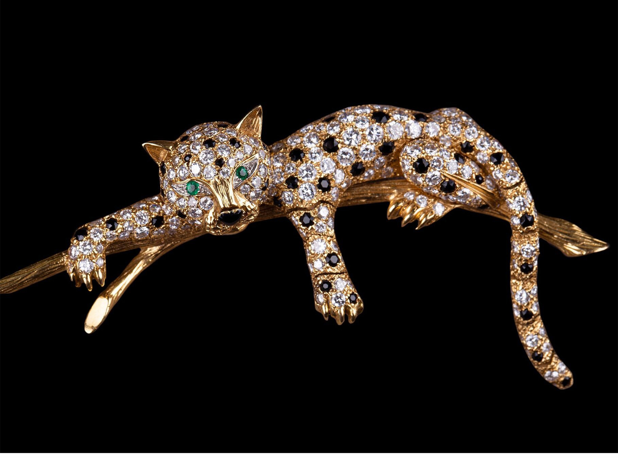 独角鹿西洋古董珠宝首饰法国18K金镶嵌钻石祖母绿花豹造型胸针