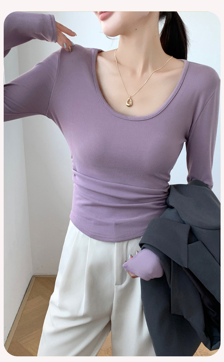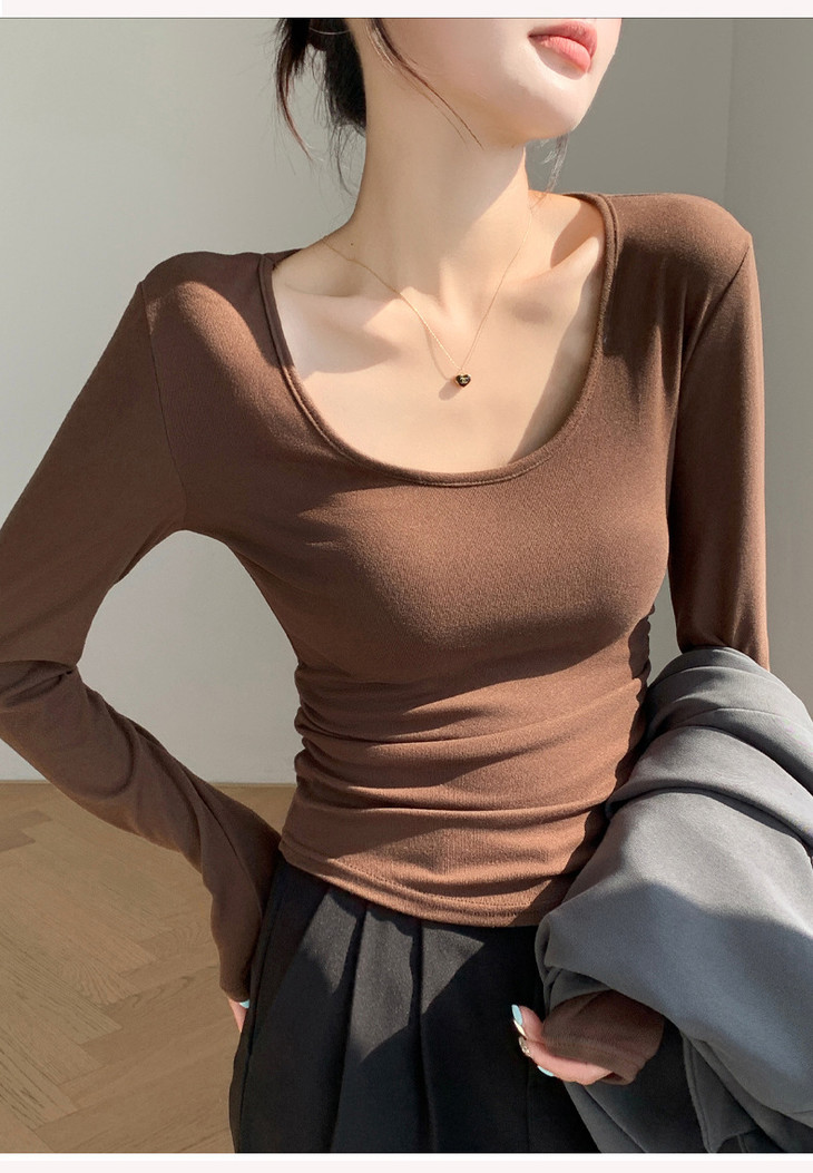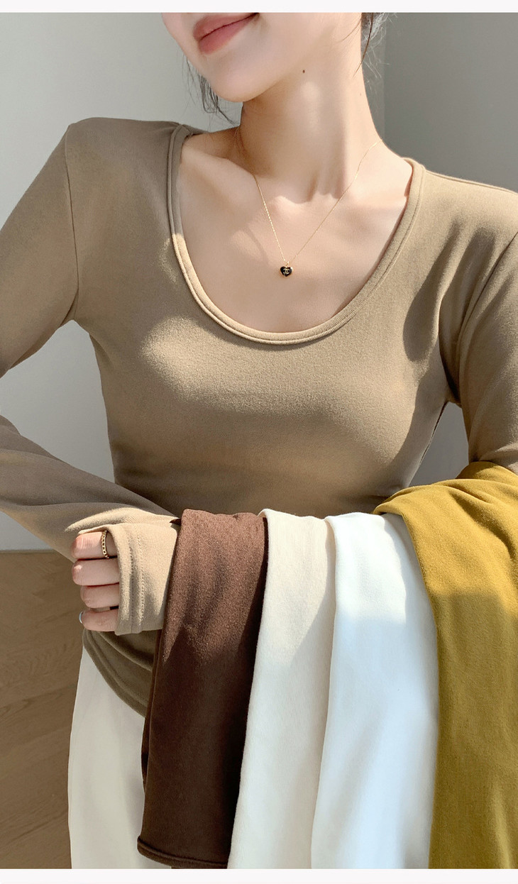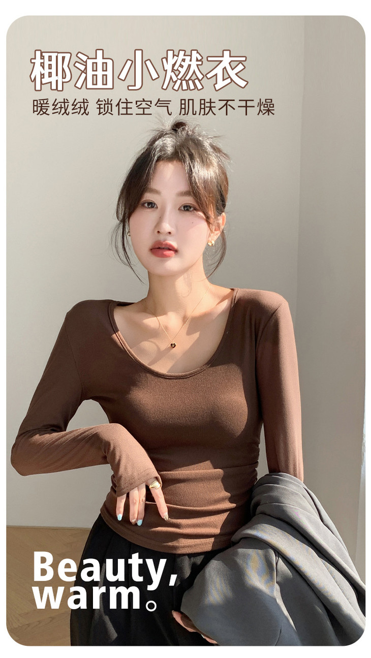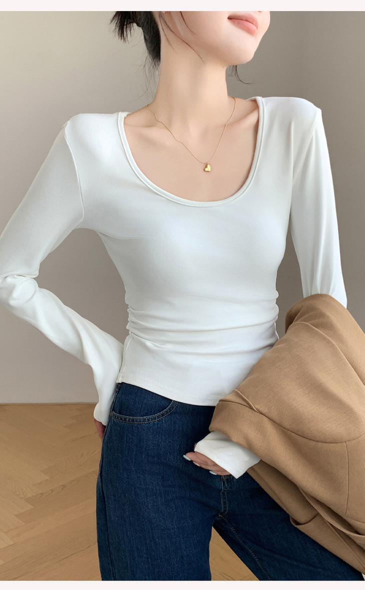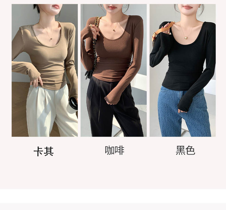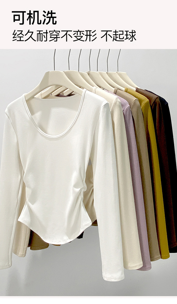 买1送1 椰绒大U领打底衫春秋磨毛内搭t桖长袖收腰修身遮肉褶皱上衣