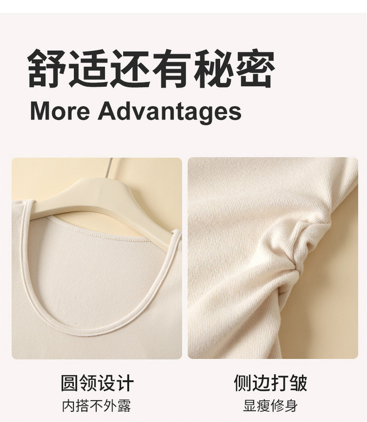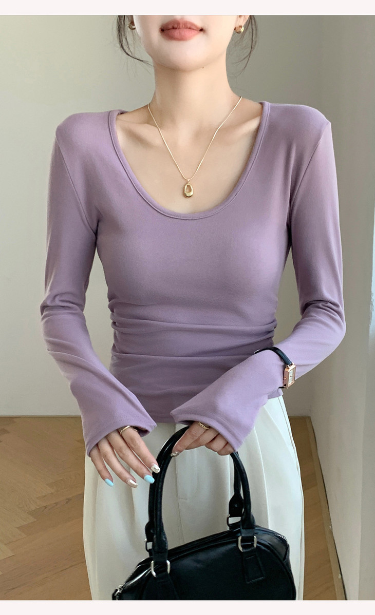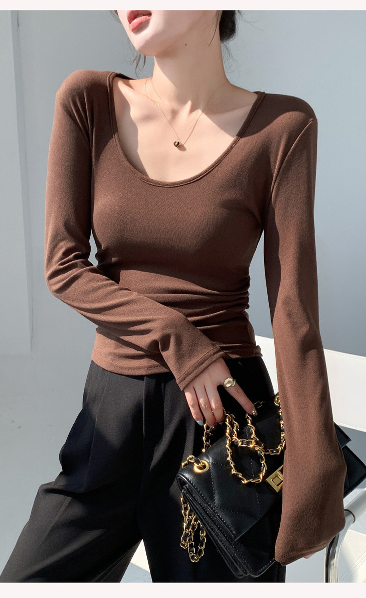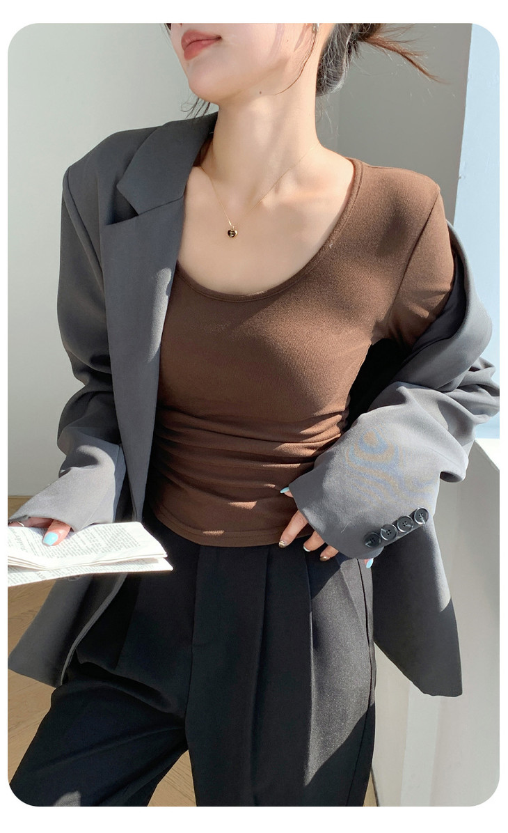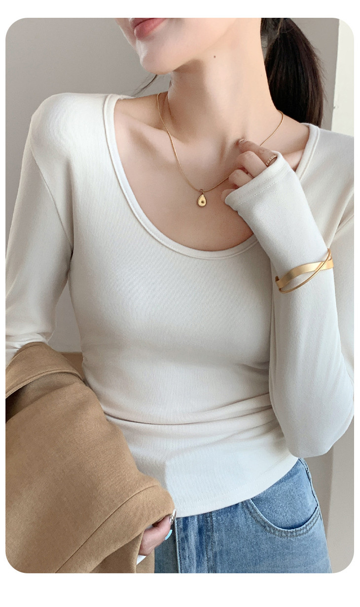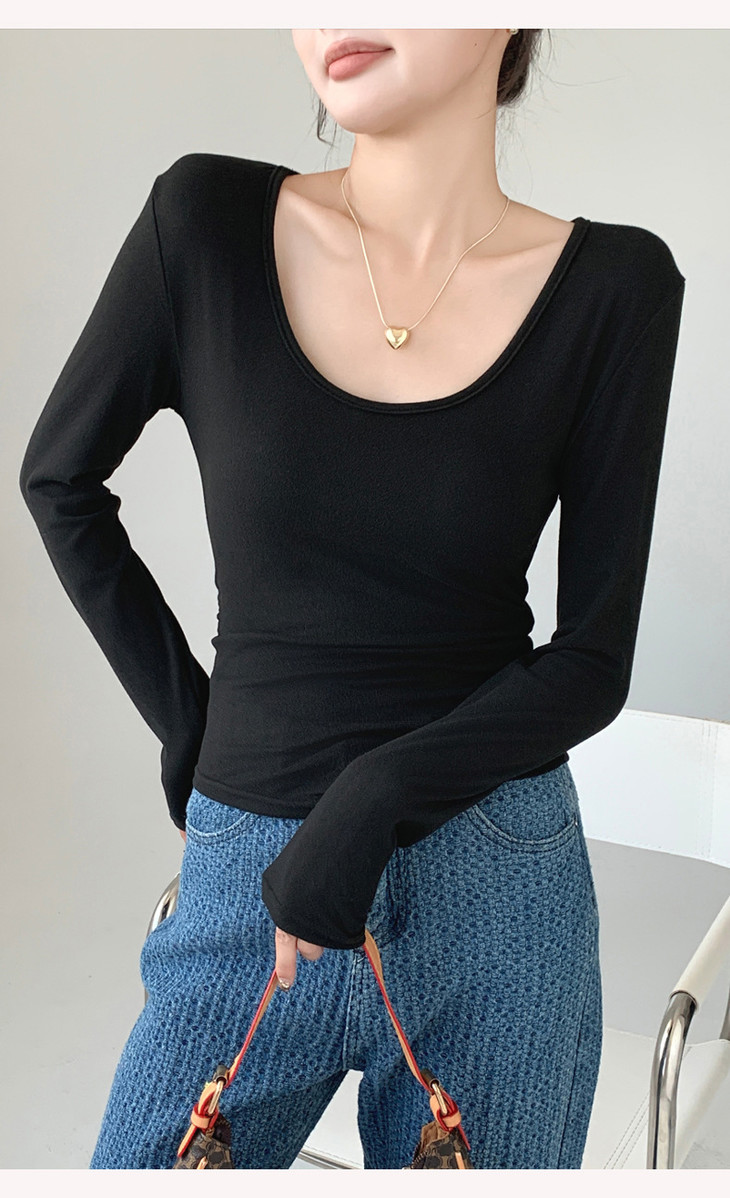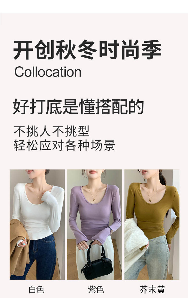 买1送1 椰绒大U领打底衫春秋磨毛内搭t桖长袖收腰修身遮肉褶皱上衣