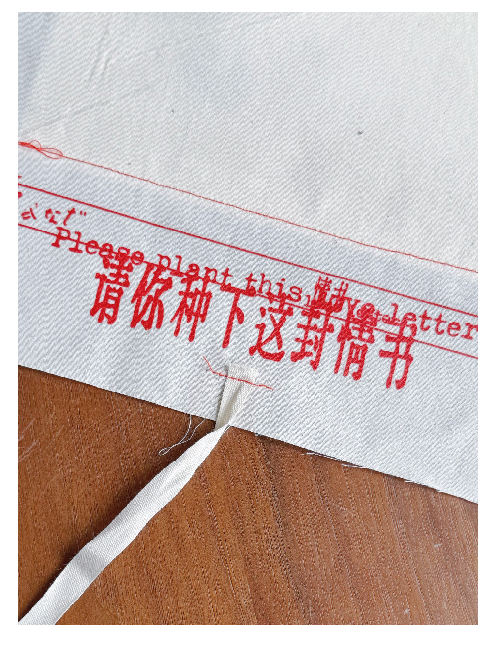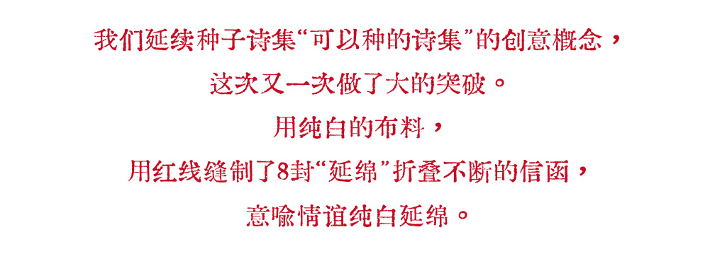 用纯白的布料,用红线缝制了8封“延绵”折叠不断的信函,意喻情谊纯白延绵。