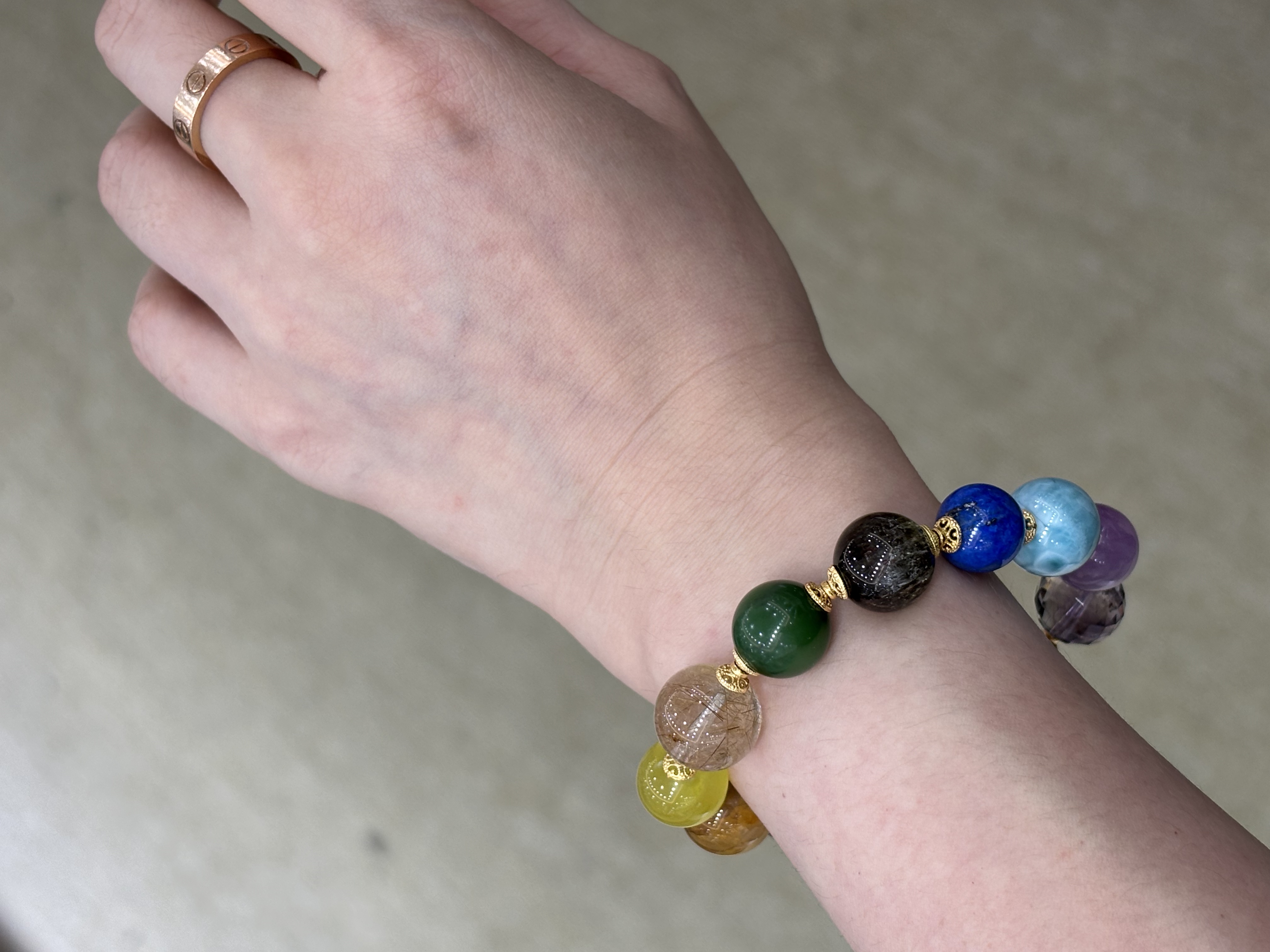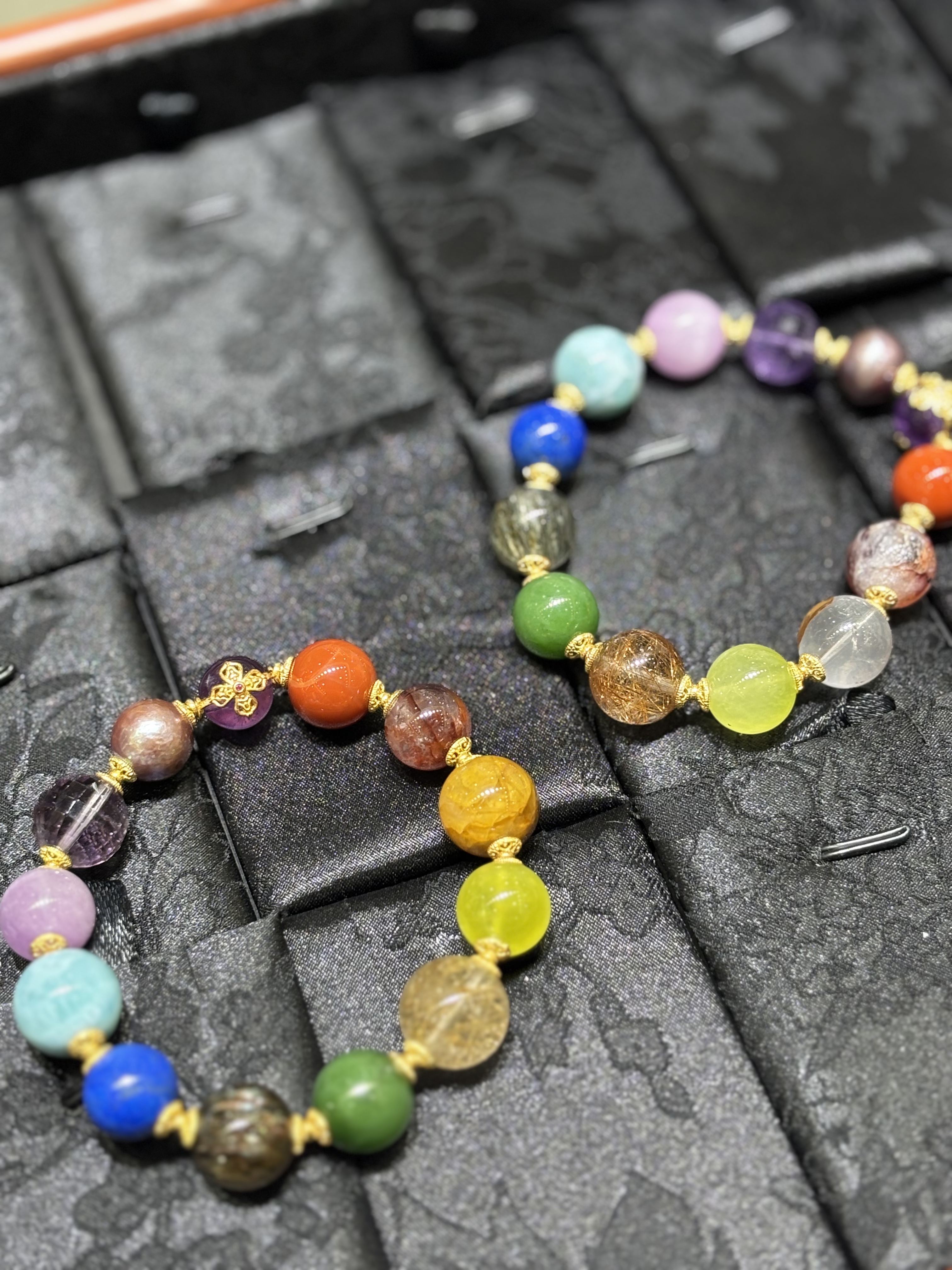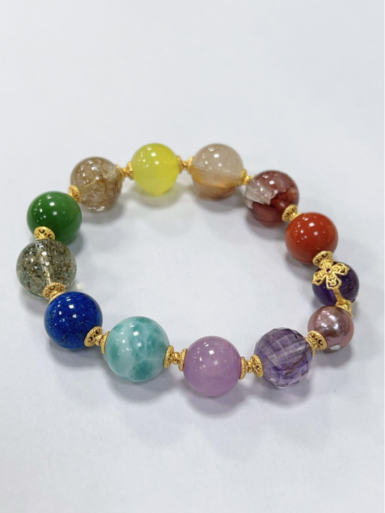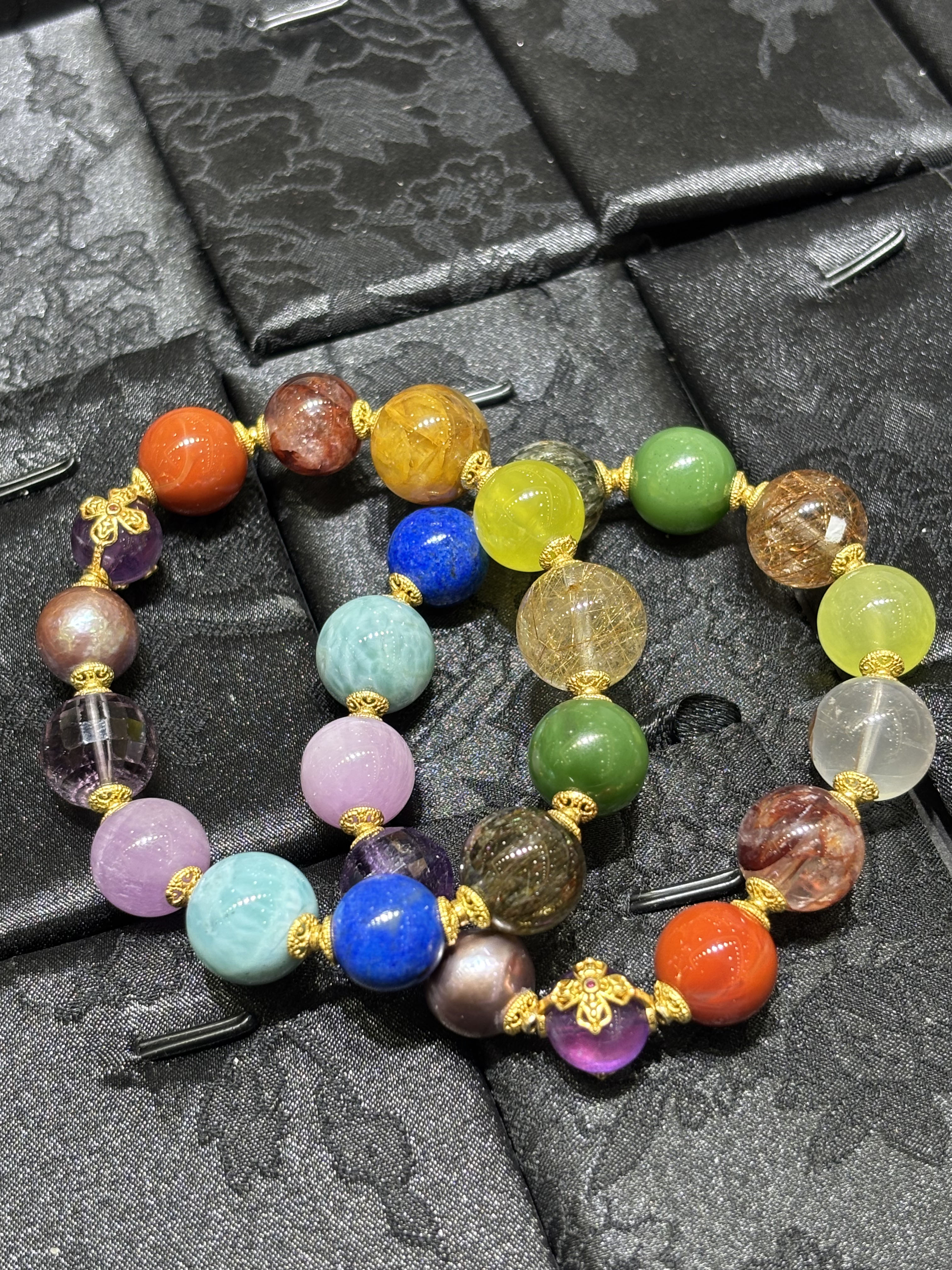 朱雀红胶花、南红、紫水晶金刚杵、爱迪生紫珍、紫水晶、紫锂辉、海纹石、青金石、绿超、猫眼碧玉、铜发晶、金葡萄石、金狮黄胶花,约11mm