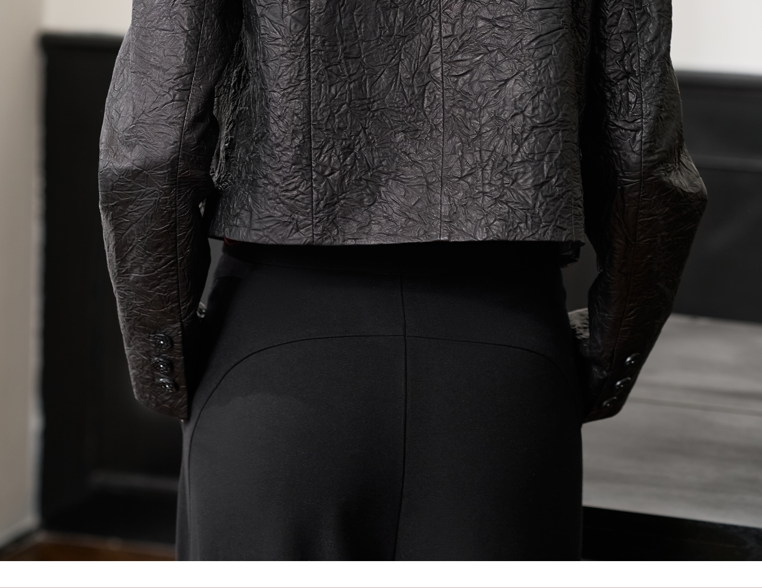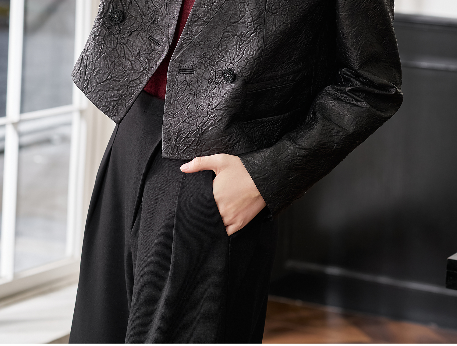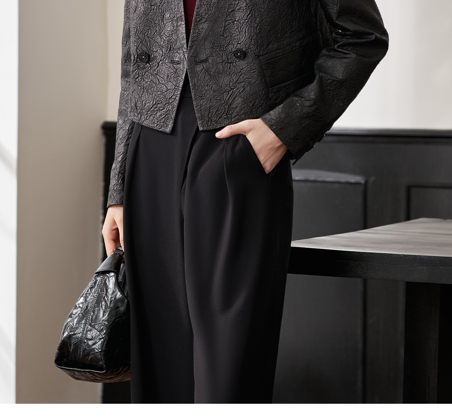 剩S/L 米思阳2026春季新款真皮绵羊皮轻奢褶皱设计感短外套复古气质皮衣外搭上衣女4376