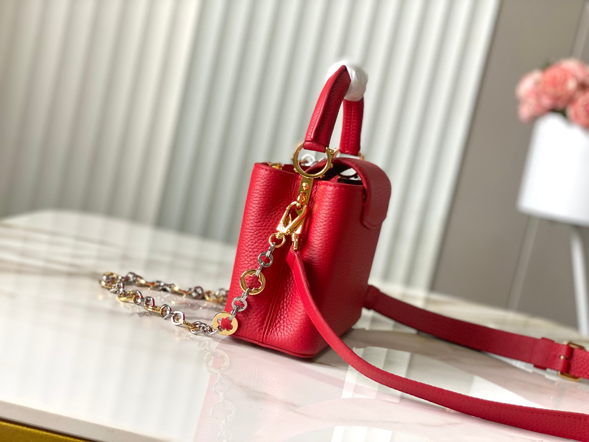 秋冬特惠💰1650 渠道级LV 新品 te级LV 动态芯片 M12936/M48865红色圆花环扣款 本款Capucines 手袋取材柔韧Taurillon 牛皮革 以珠宝风格双镀链条和 Monogram花卉元素点明Chain On You系列身份 翻盖可置于内外两侧 充裕构型和多重内袋方便收纳日常所需 圆润LV字母再添匠心细节 Size: 21 * 14 * 8 cm
