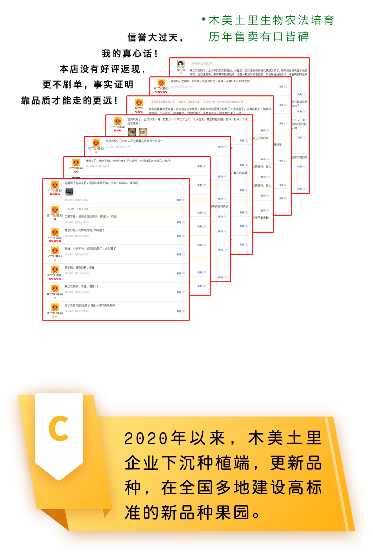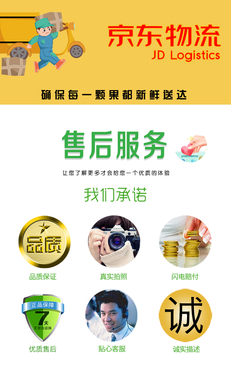 2.产品损坏的需在到货24小时内拍照联系客服处理,包装+快递面单+坏果一起拍照,没按售后要求的不予售后处理,逾期将无法赔偿。3.因果子品相不好、不新鲜、口感不甜等个人主观感官的无法赔偿;4.生鲜果蔬在运输途中会有水分蒸发,重量误差在100g左右的不在赔付范围内哦!5.因收货地址不详、有误、电话打不通等原因造成送货延迟以至于商品腐坏的无法赔付。