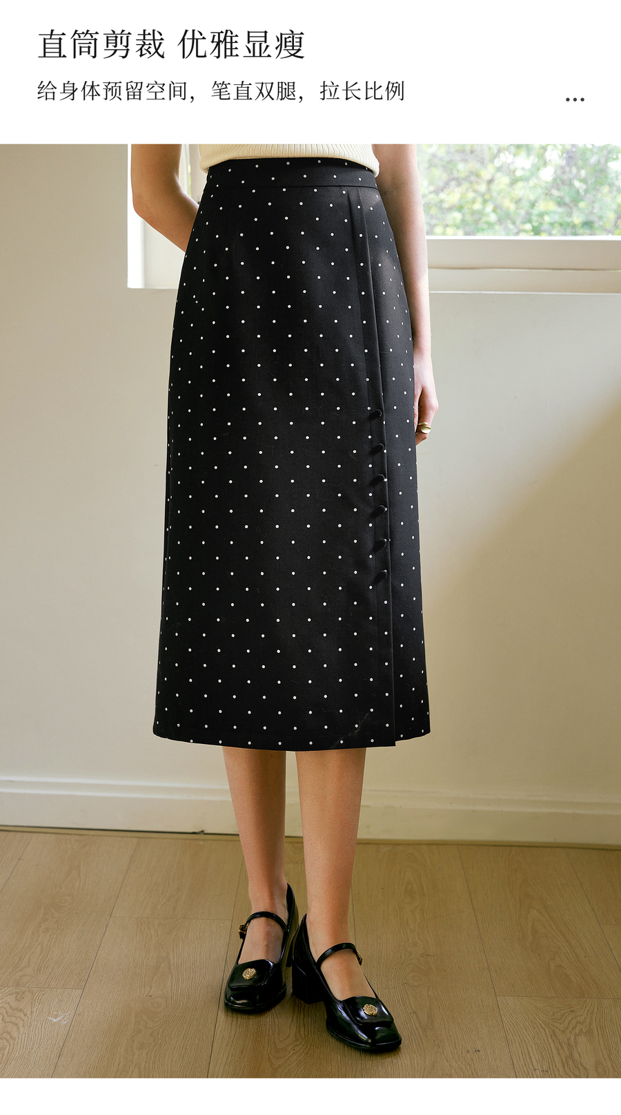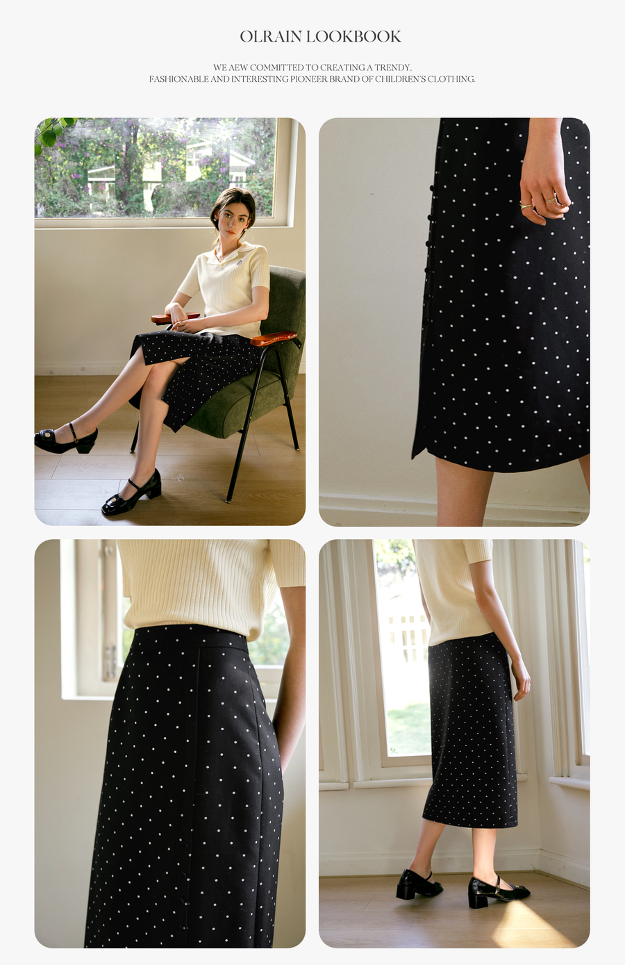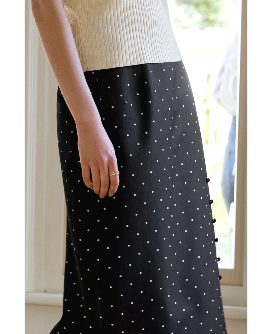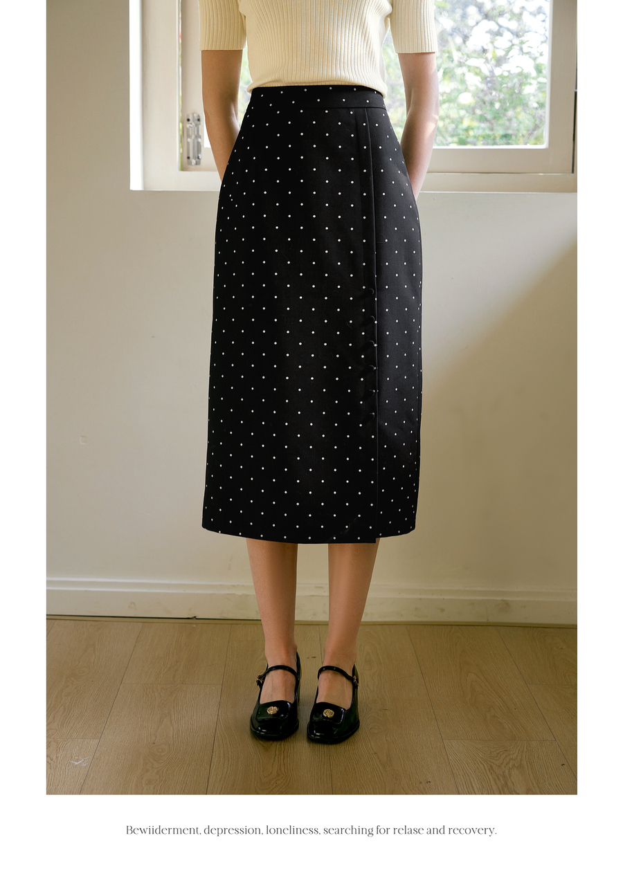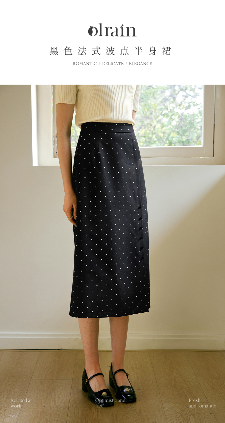 OLrain欧芮儿2025春季新款法式复古波点开叉纽扣高腰中长半身裙女