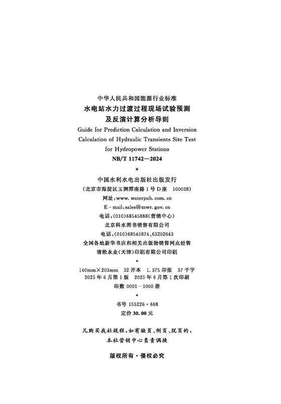 图书名称:水电站水力过渡过程现场试验预测及反演计算分析导则(NB/T 11742—2024)