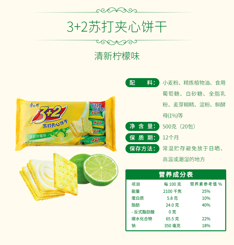康师傅 3+2苏打夹心饼干蛋糕营养早餐办公室休闲零食小吃清新柠檬500g