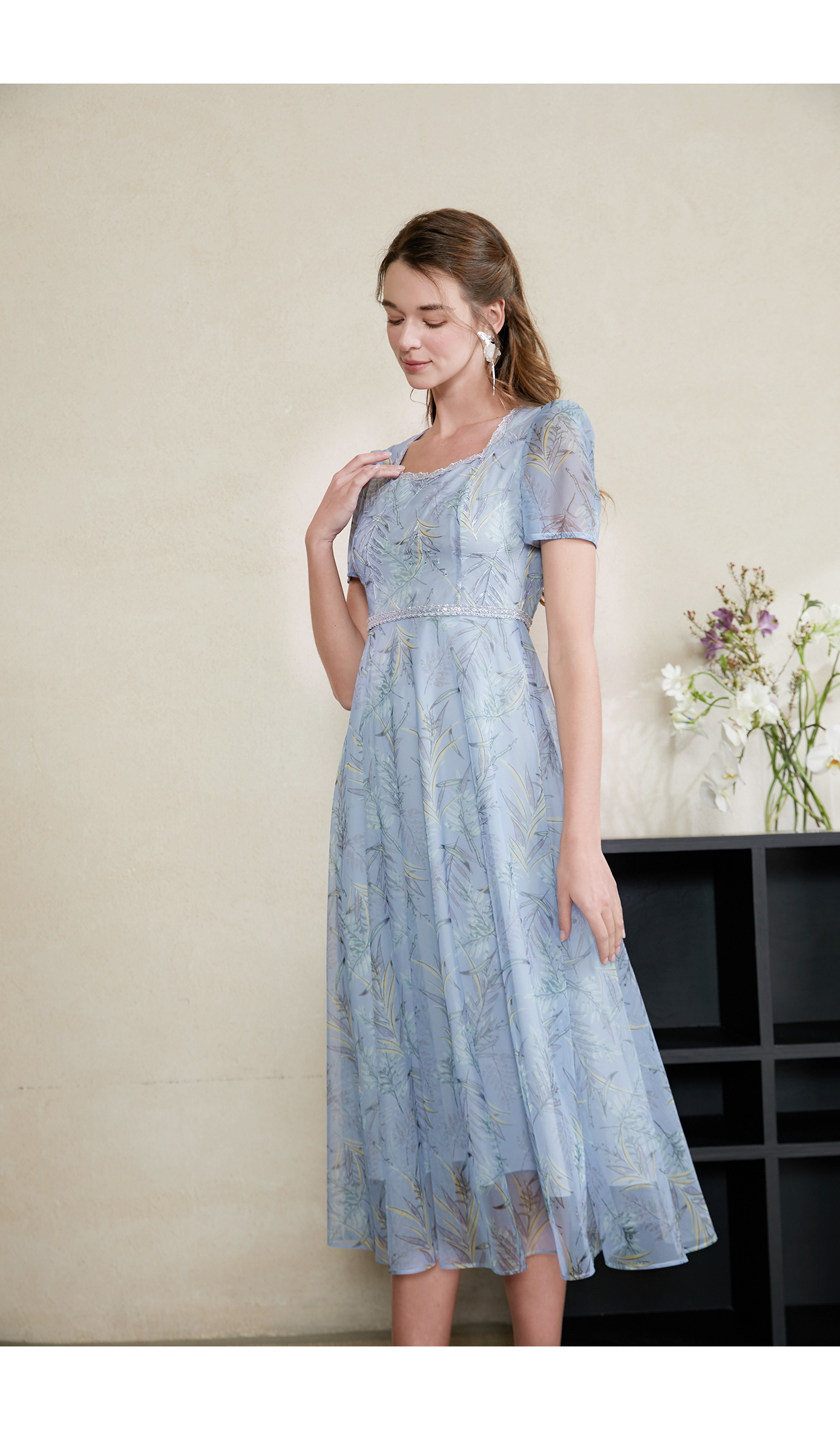 司歌雪纺碎花收腰连衣裙短袖A911082X