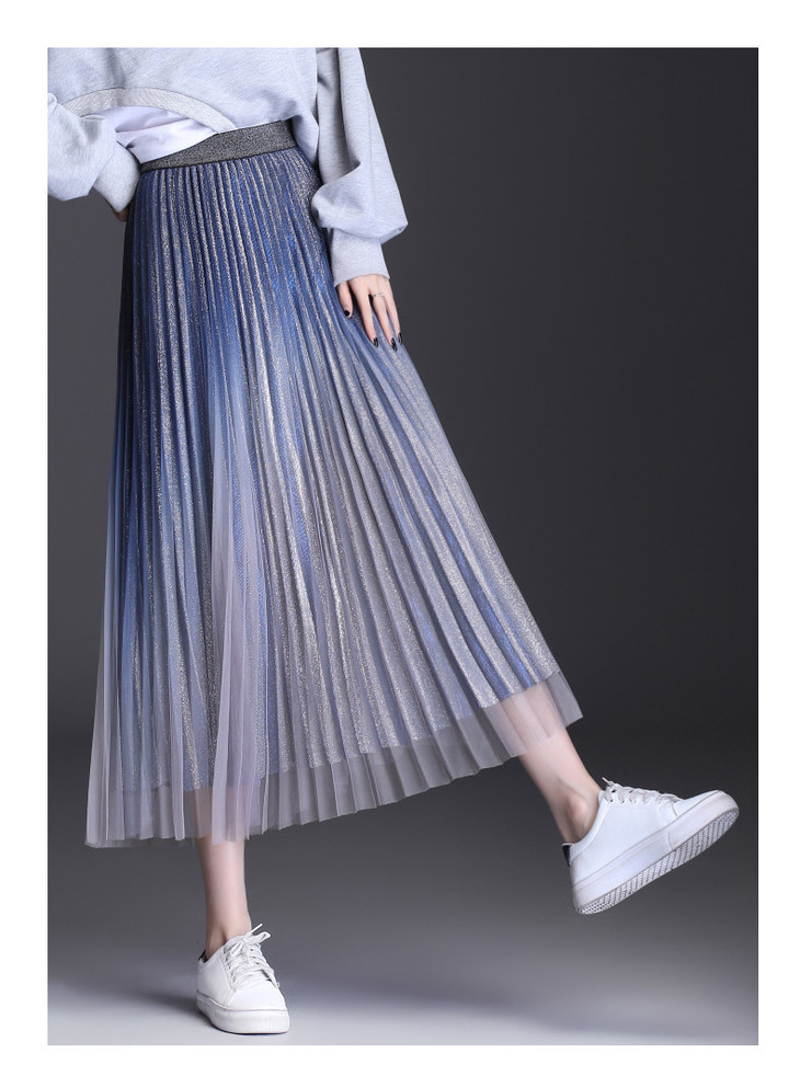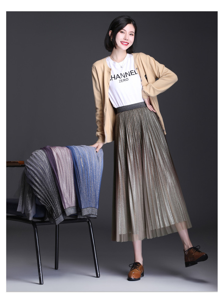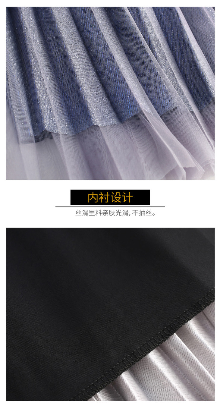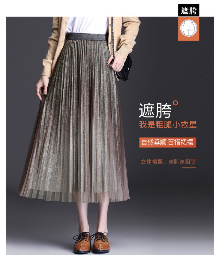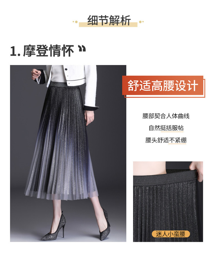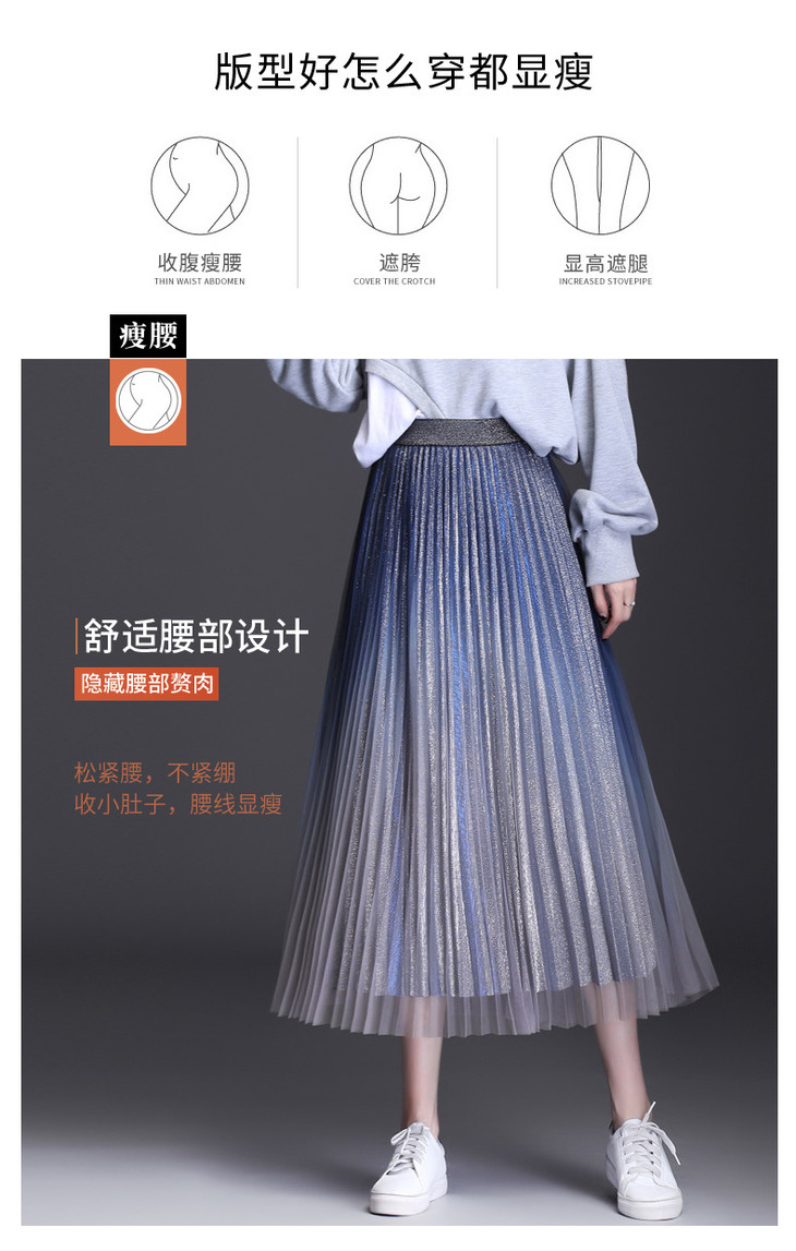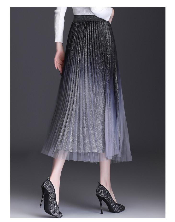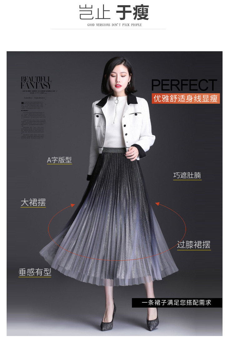 时尚渐变色亮丝网纱百褶裙,修身显瘦A字大裙摆长裙春秋半身裙TY-2106