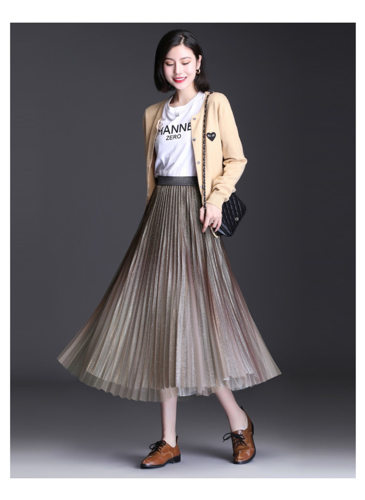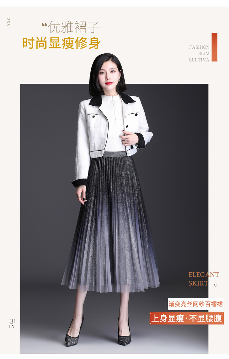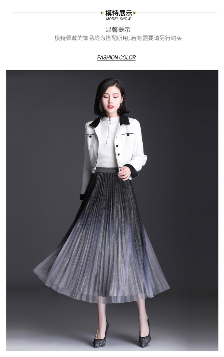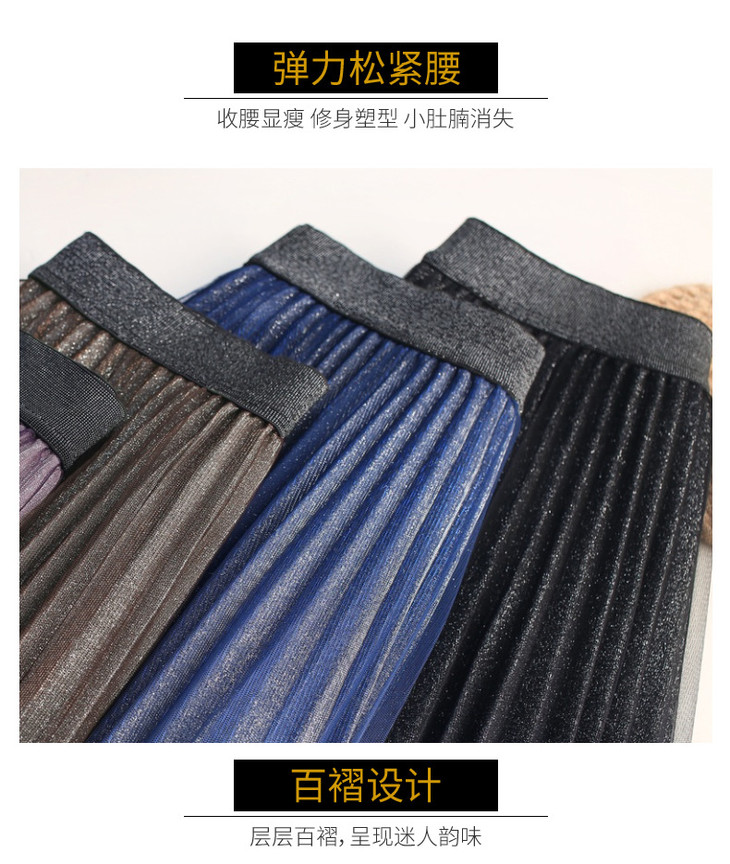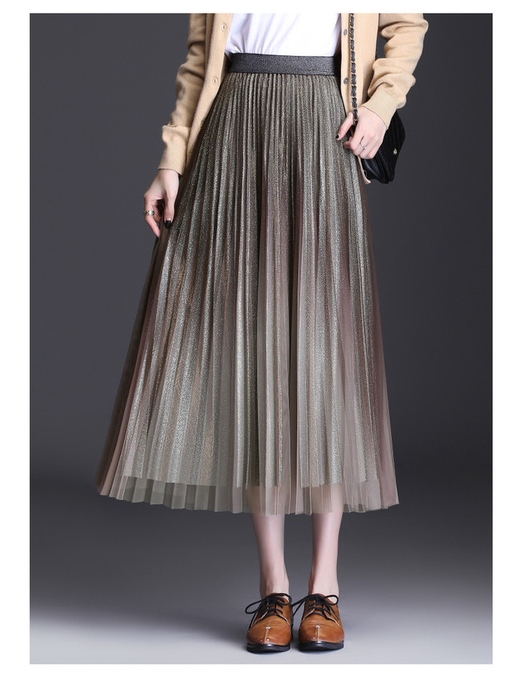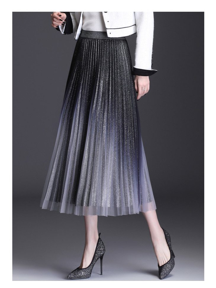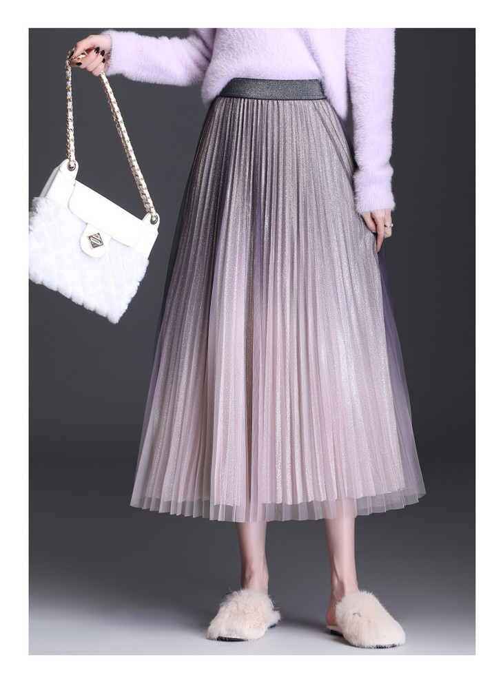 时尚渐变色亮丝网纱百褶裙,修身显瘦A字大裙摆长裙春秋半身裙TY-2106