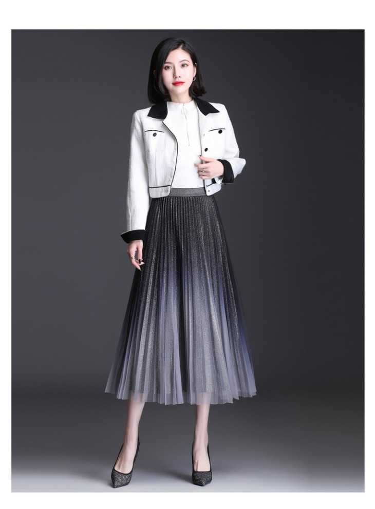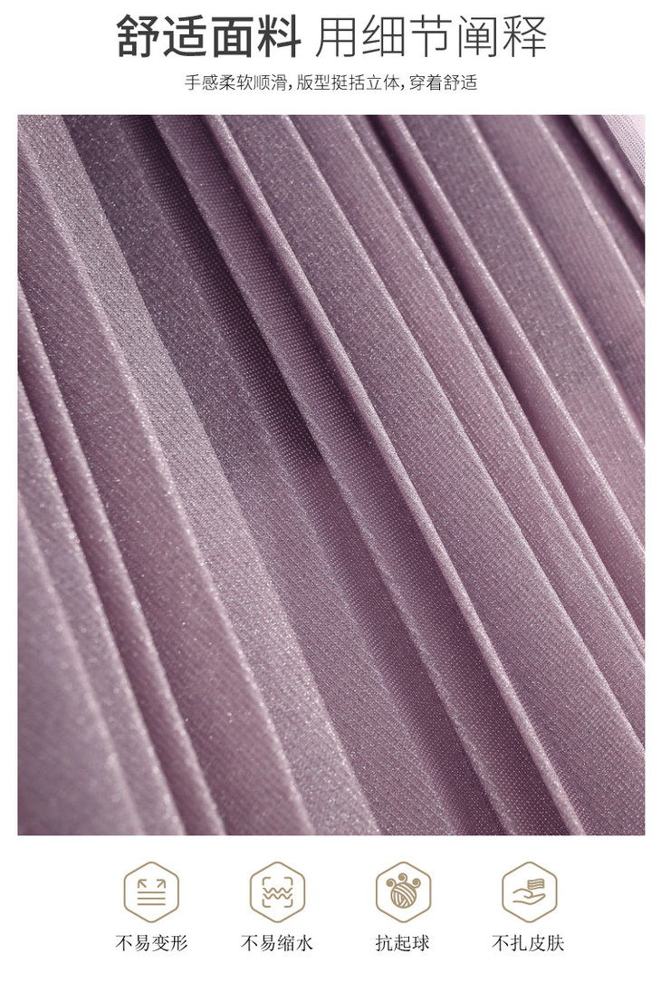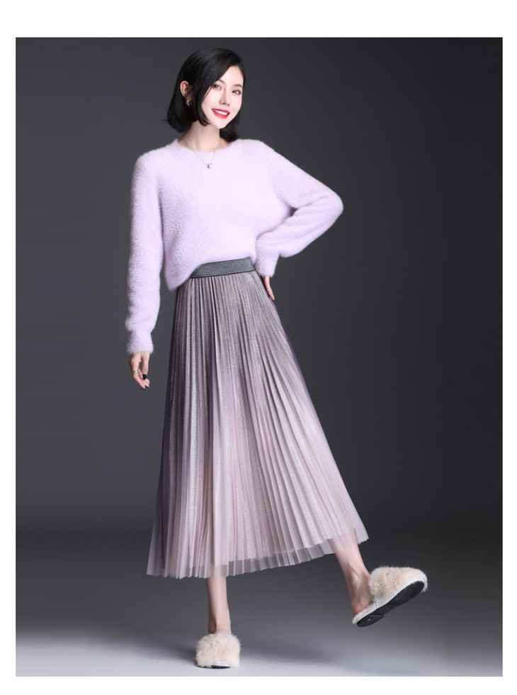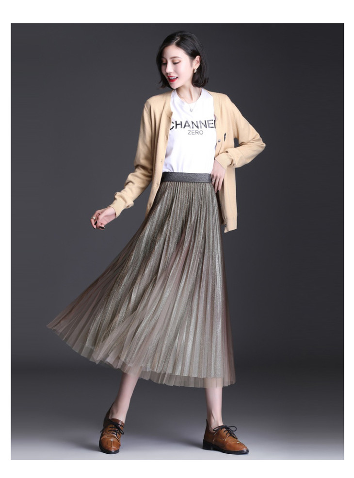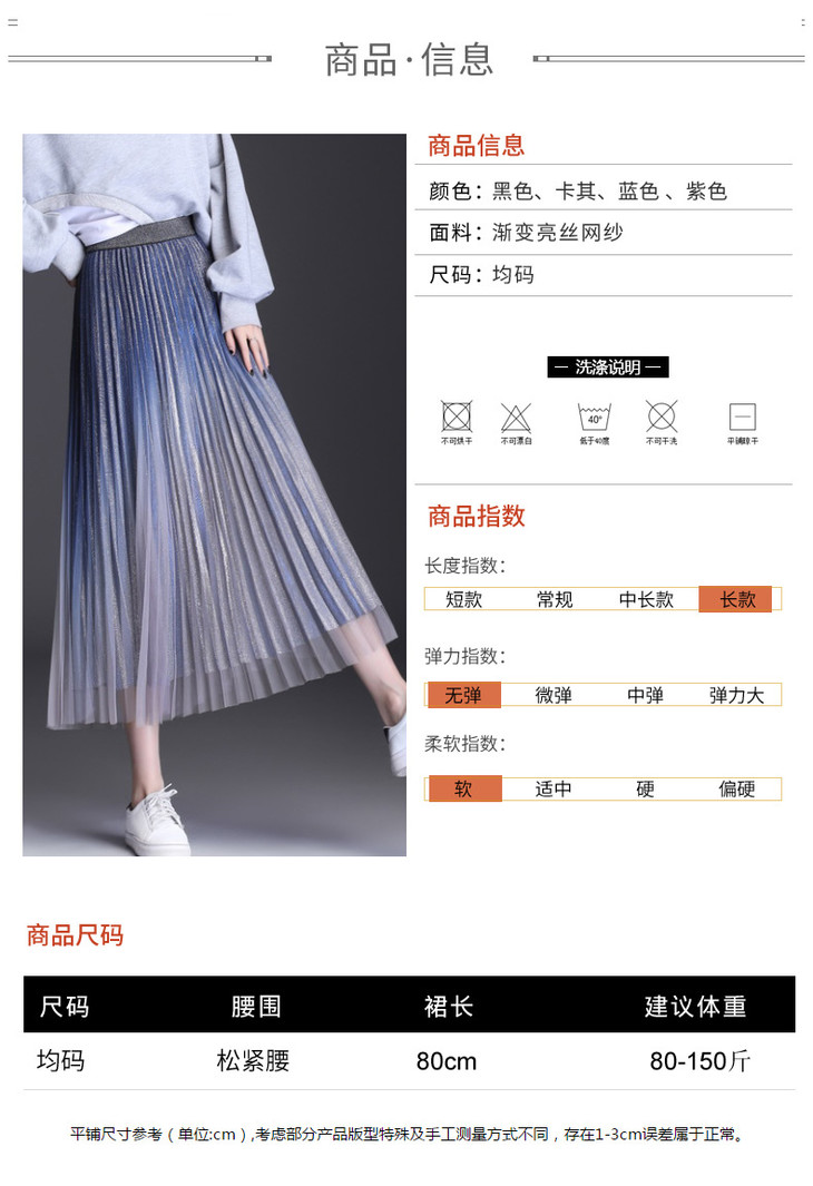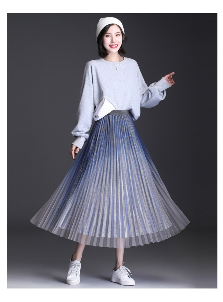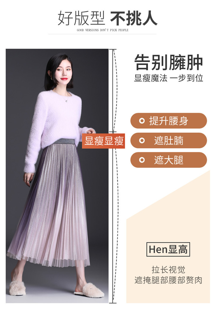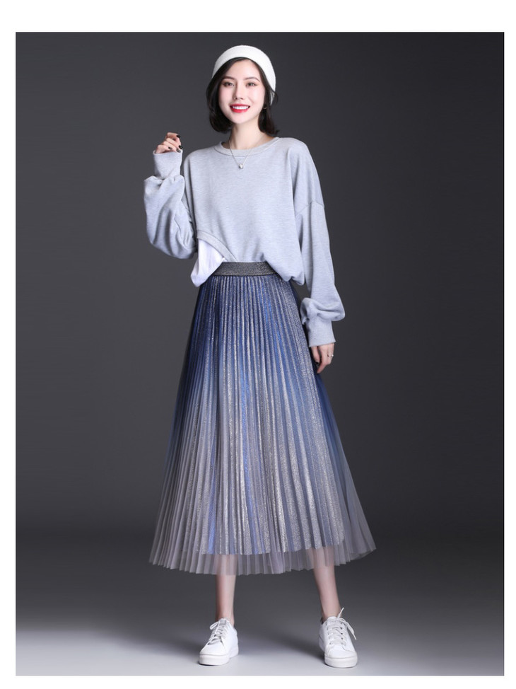 时尚渐变色亮丝网纱百褶裙,修身显瘦A字大裙摆长裙春秋半身裙TY-2106