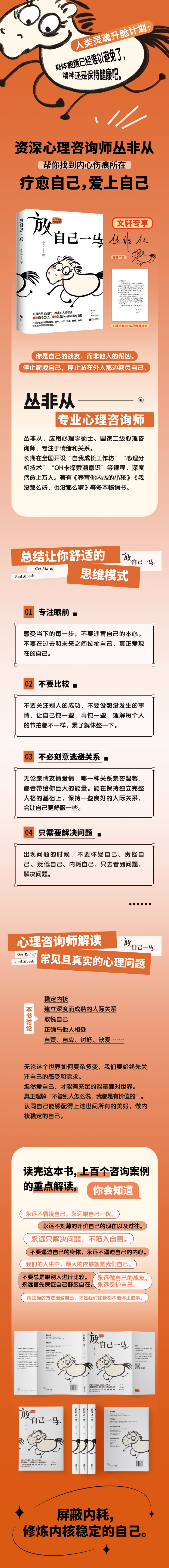 本书是心理自助类成长书。玻璃心、讨好型人格、缺乏安全感、社交恐惧、害怕吵架、不敢拒绝等,这是大多数人会在生活中被长期困扰的问题,并因此大量消耗心理资源,让自己长期处在疲惫中。心理咨询师丛非从运用自己的十几年心理学专业训练,在这本书中,针对当下年轻人会关心的这些问题,列举解决方式和办法,并且告诉读者:没有人生而完美,坦然面对自己的不完美,才能不压抑、不内耗、不自惩、不自责、不自卑。轻松自在地做自己,才是我们一生要做的事。