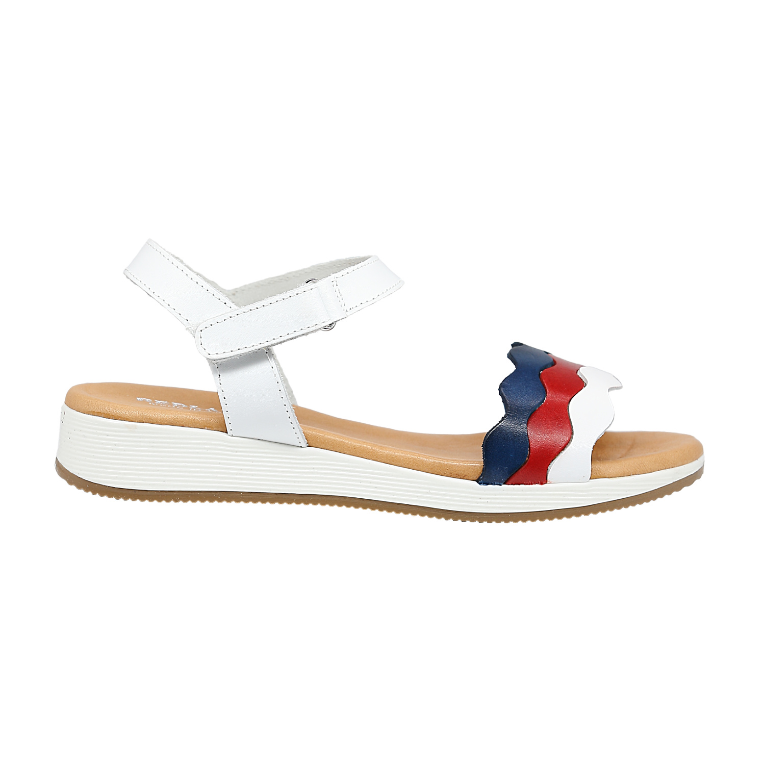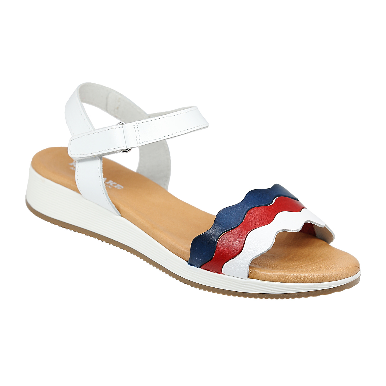 这绝对是一款超级美丽又舒适的女士凉鞋,前面波浪形的彩色皮带,红白蓝的搭配,简直是夏天的完美颜色!不论是搭配裙子还是裤装,都能让你瞬间变身街头时尚达人哦!