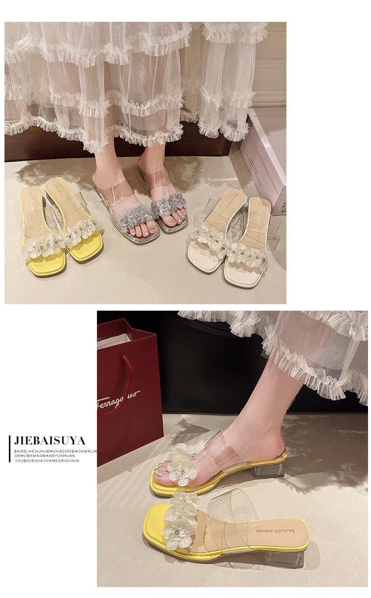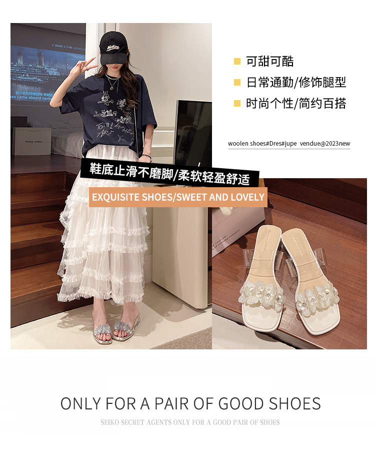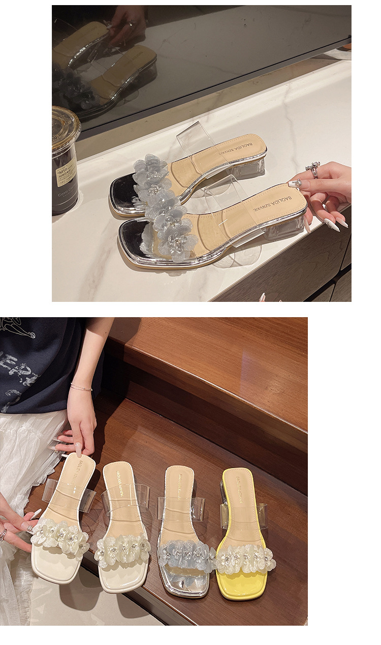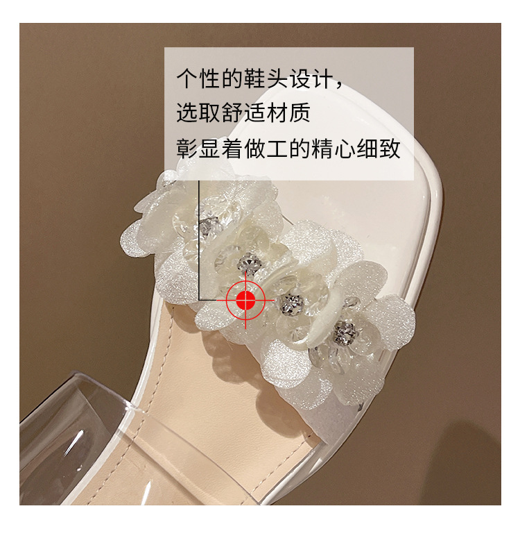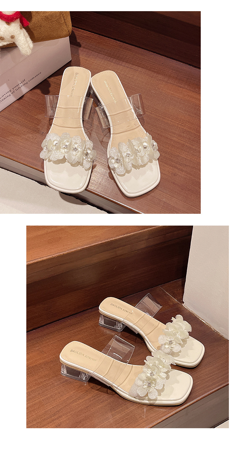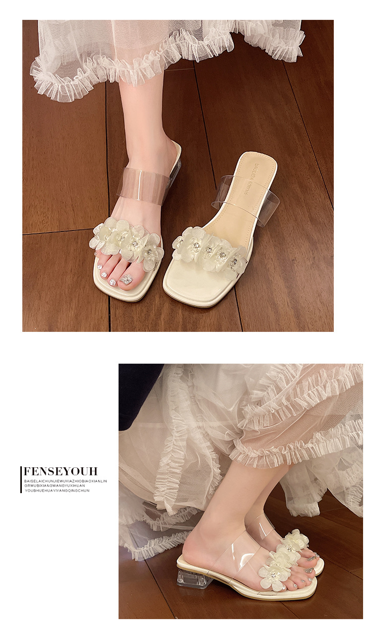 【YW】无忧购韩版方头珍珠花朵仙女风水晶粗跟透明一字带凉拖鞋7703(截单后7天发货)