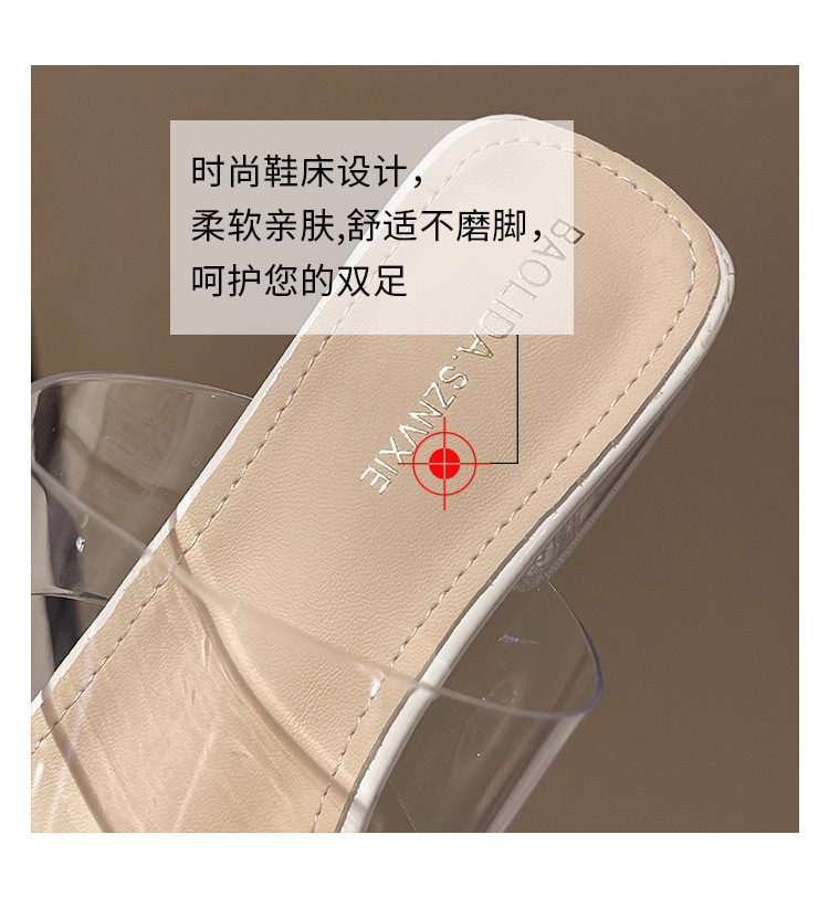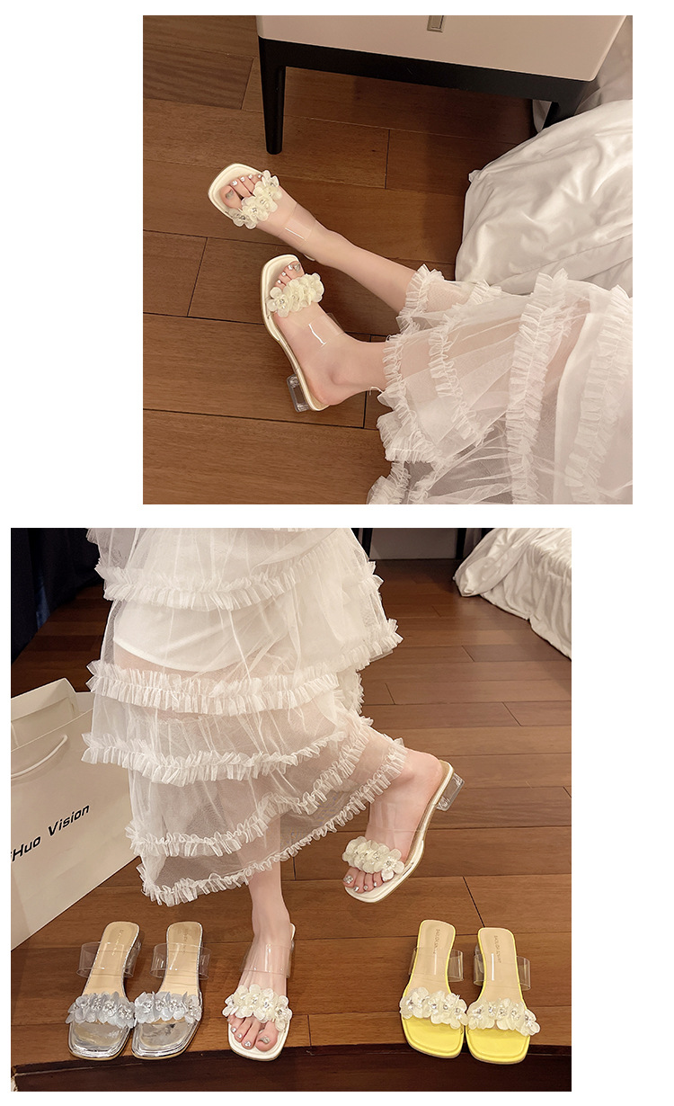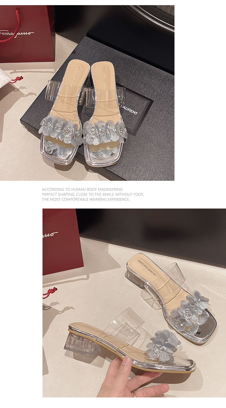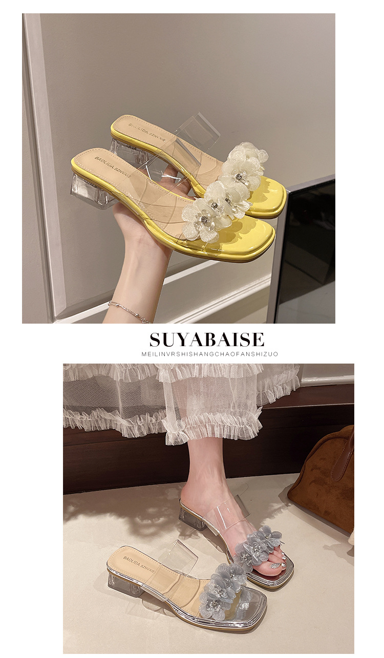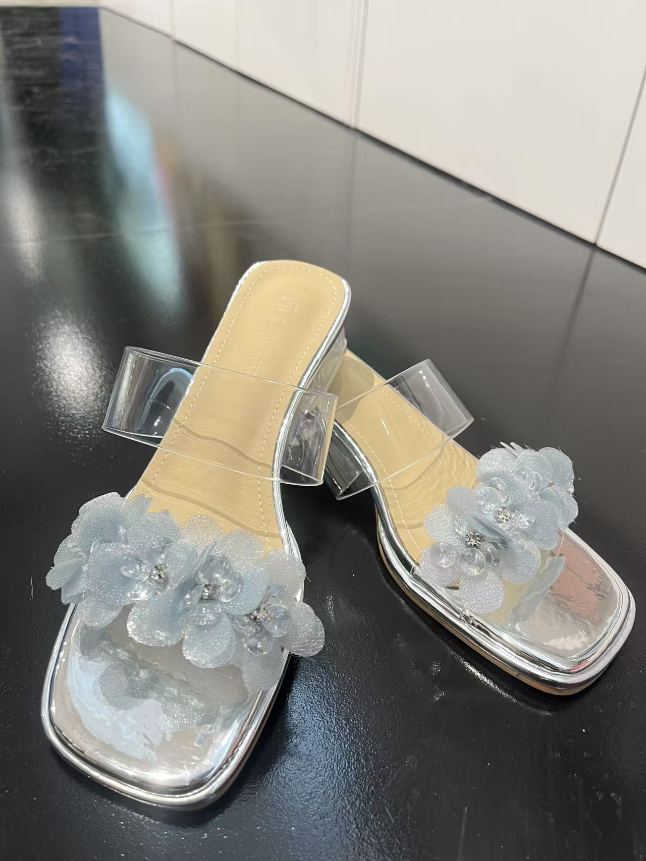 【YW】无忧购韩版方头珍珠花朵仙女风水晶粗跟透明一字带凉拖鞋7703(截单后7天发货)