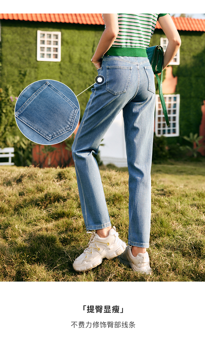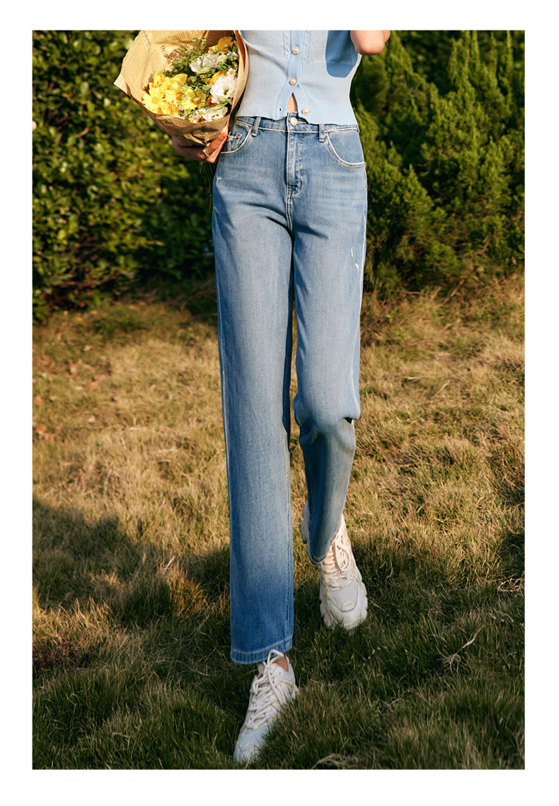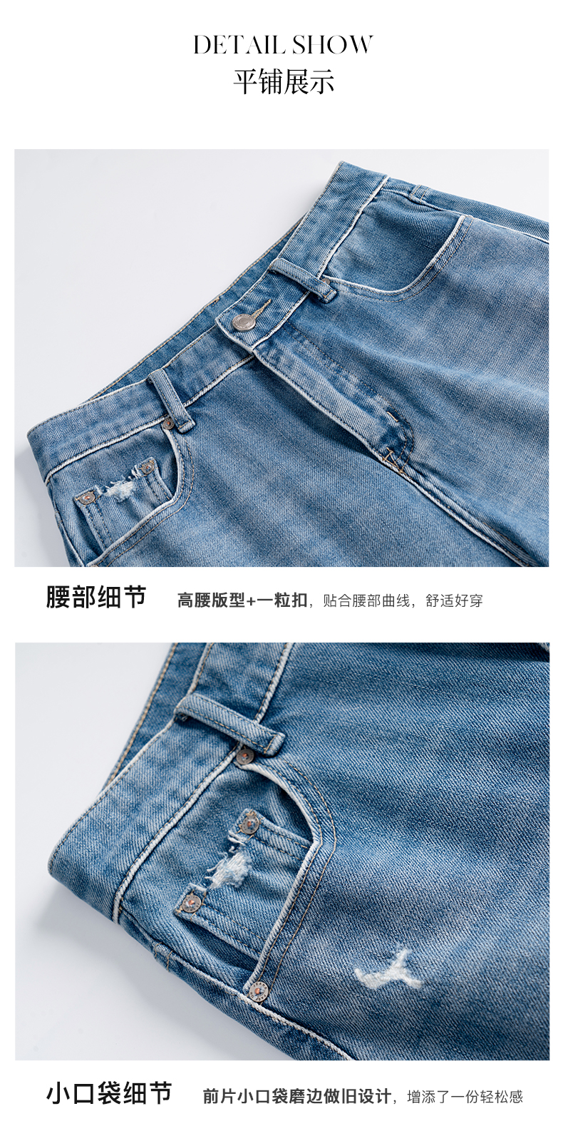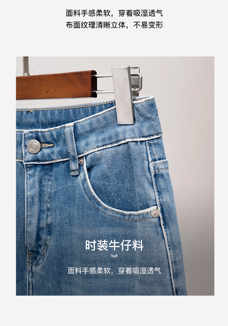 欧芮儿蓝色牛仔裤女夏季2022新款高腰时尚直筒宽松阔腿磨边老爹裤