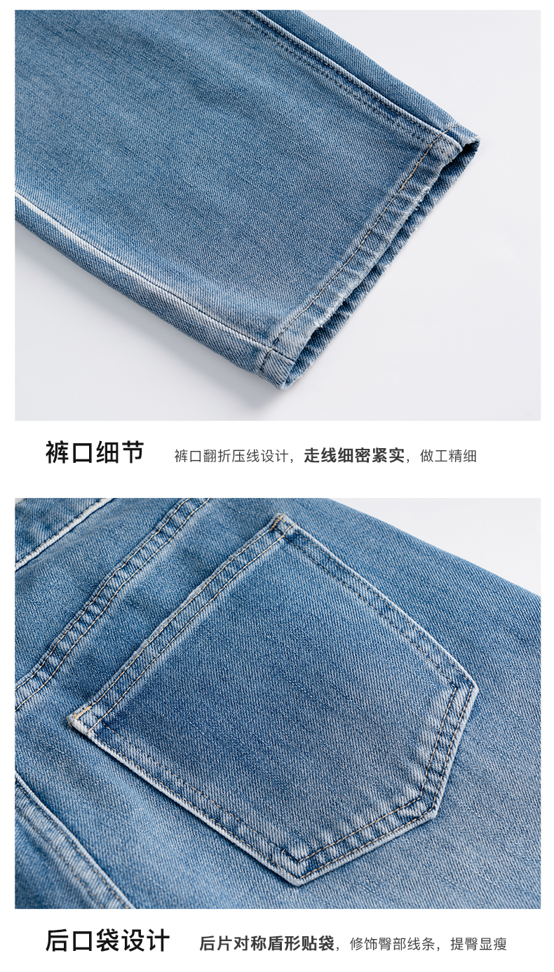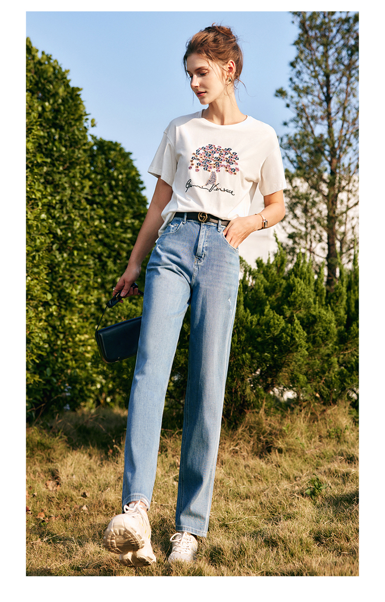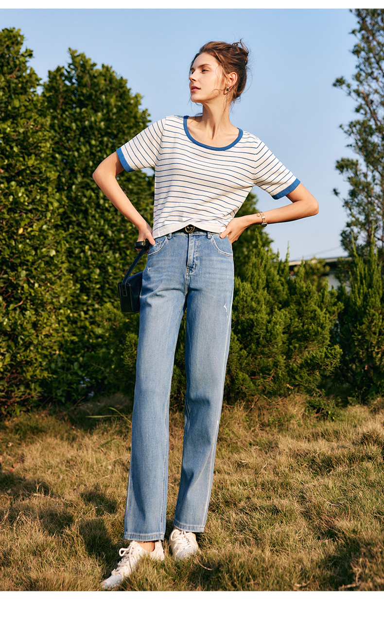 欧芮儿蓝色牛仔裤女夏季2022新款高腰时尚直筒宽松阔腿磨边老爹裤