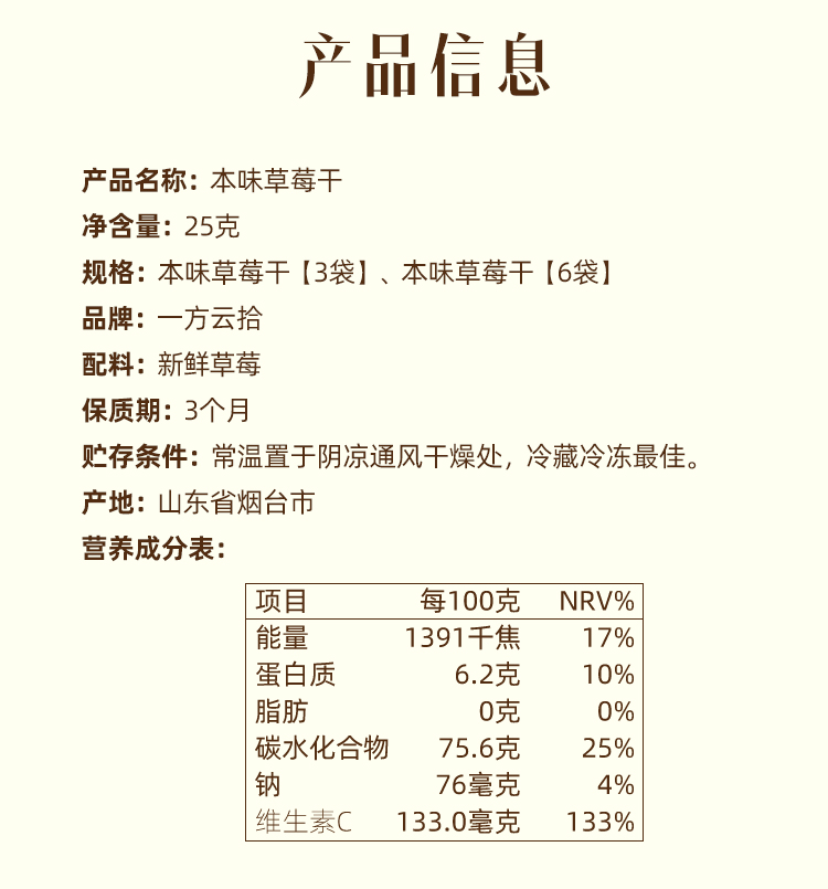 【品名/规格】【一方云拾】原切草莓干(25克/袋)