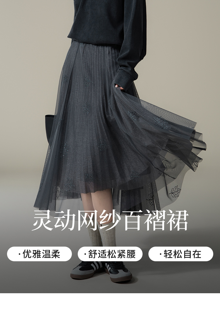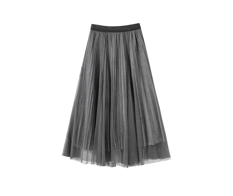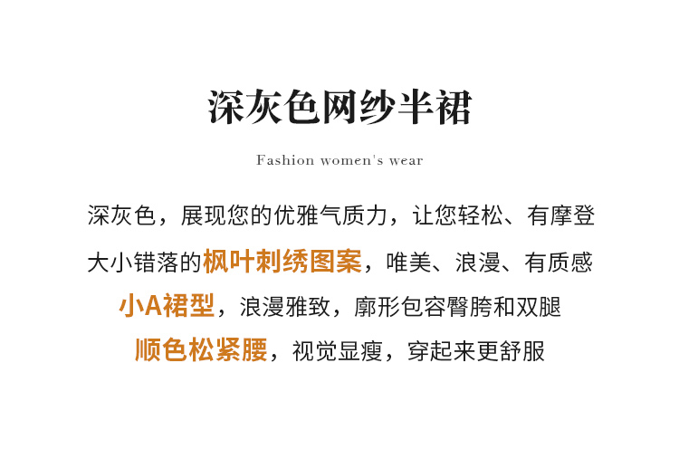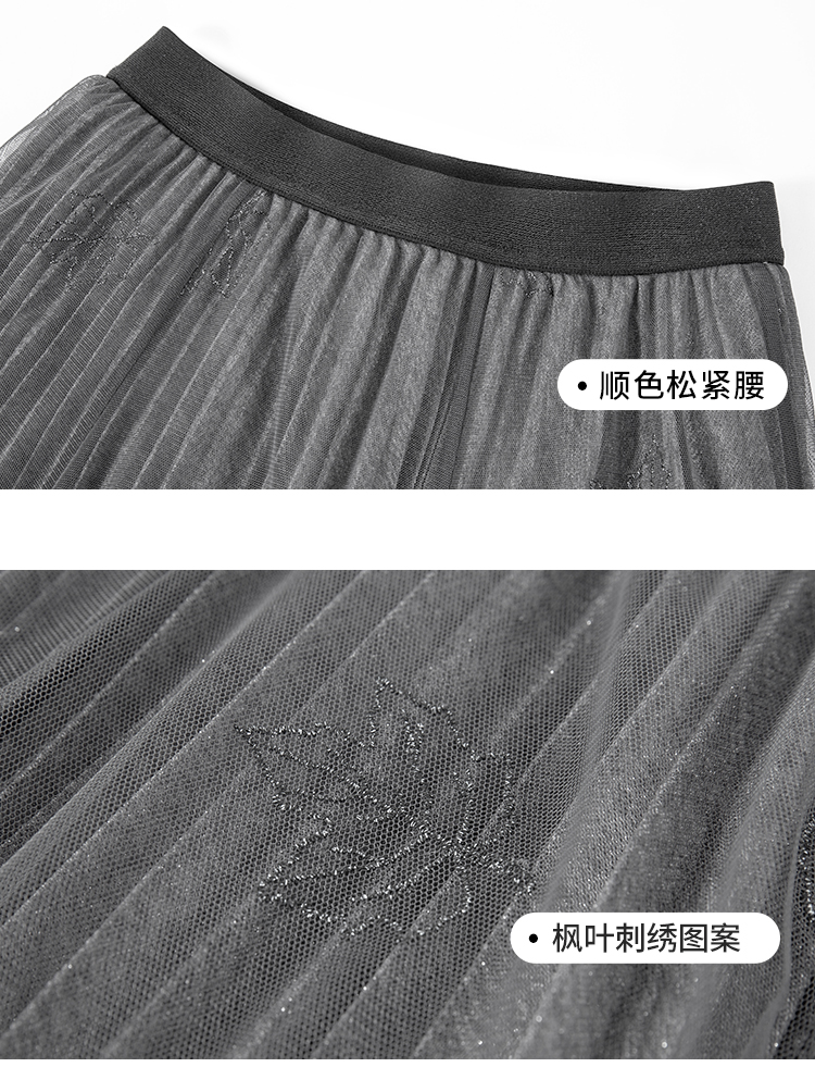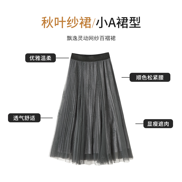【商场同款】CNS4850 “秋叶纱裙” 深灰色 气质优雅 刺绣枫叶图案 浪漫有质感 经典小A裙型 包容身材 顺色松紧腰 更舒适网纱半裙
