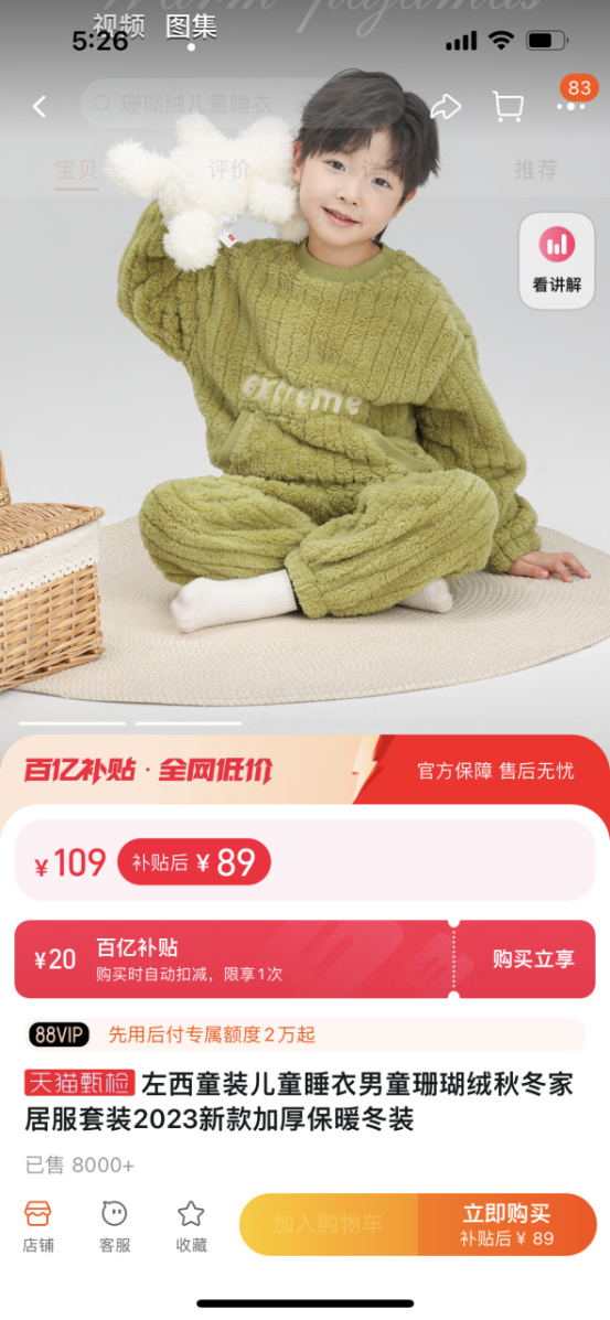 对标淘宝109(补贴后89)左西品牌定制的同款珊瑚绒家居服,