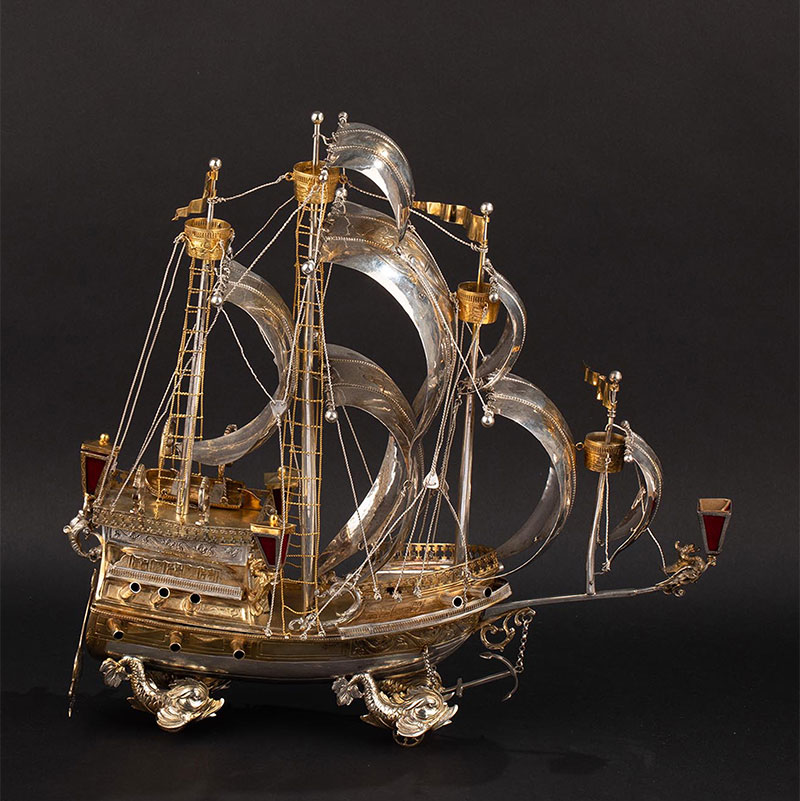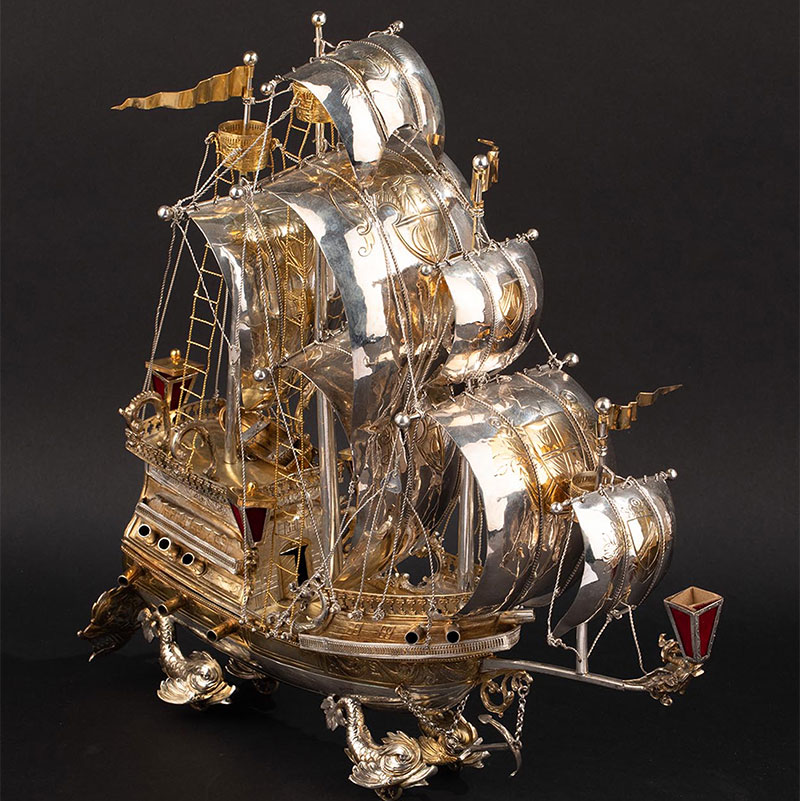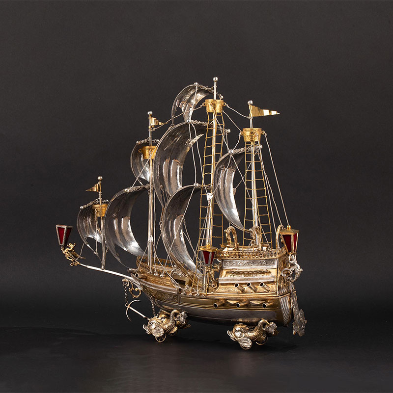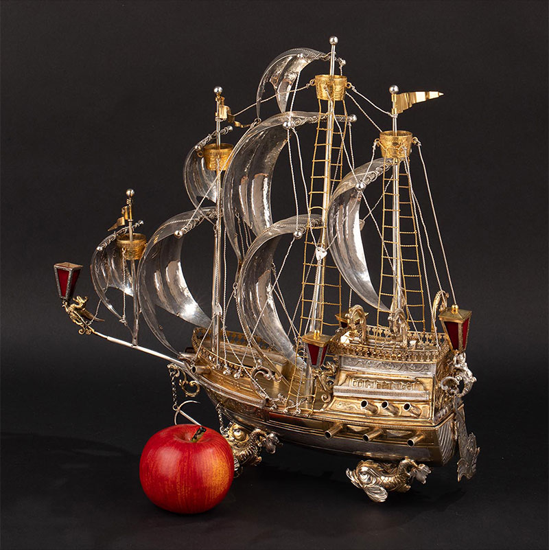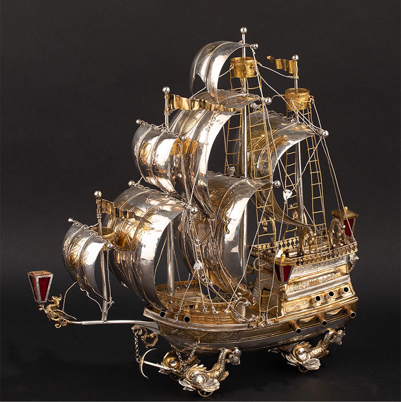 1910年代德国出品纯银鎏金精雕帆船造型摆件