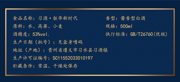 贵州习酒钜华新时代酱香型白酒53度500ml礼盒装/瓶
