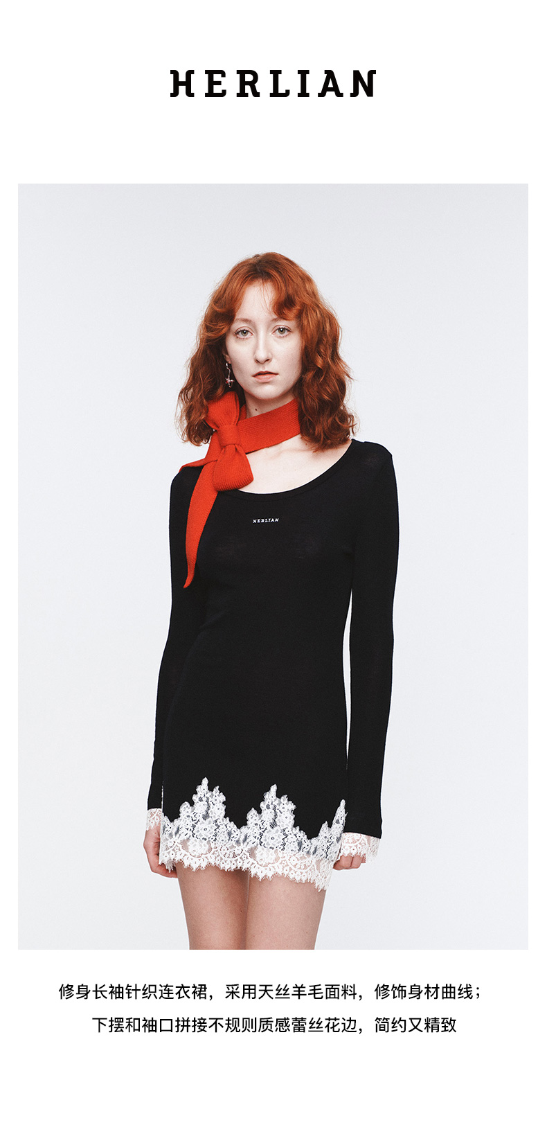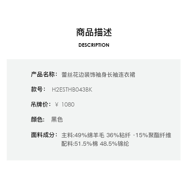 H2ESTHB043BK蕾丝花边装饰袖身长袖连衣裙