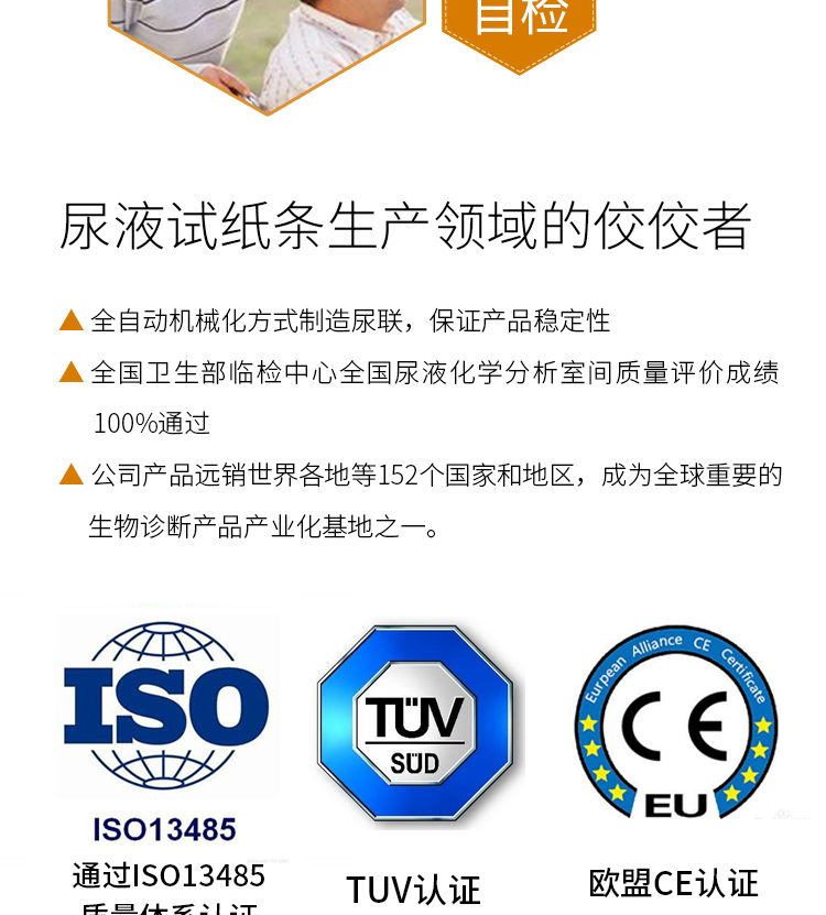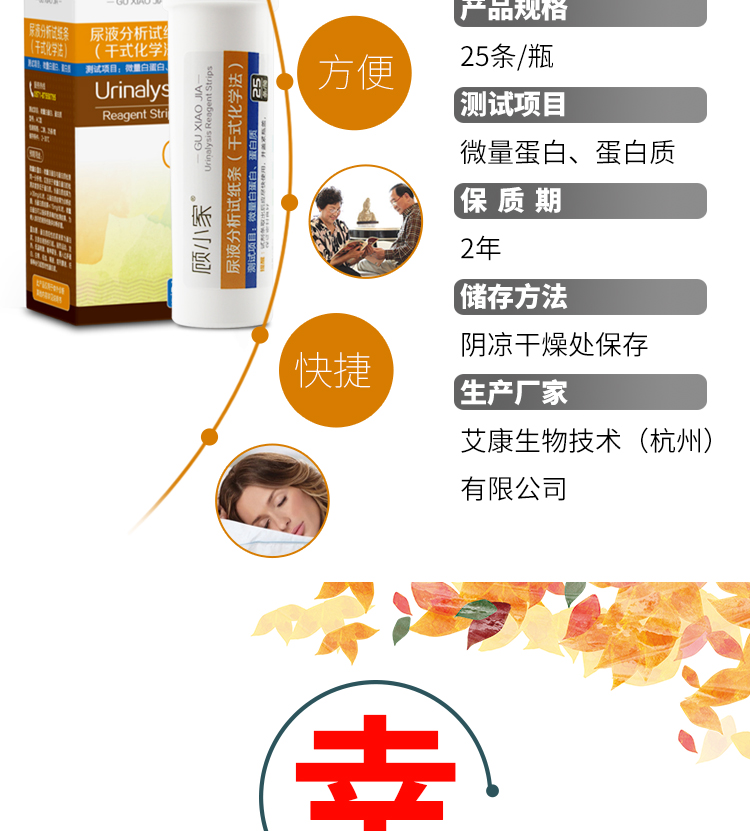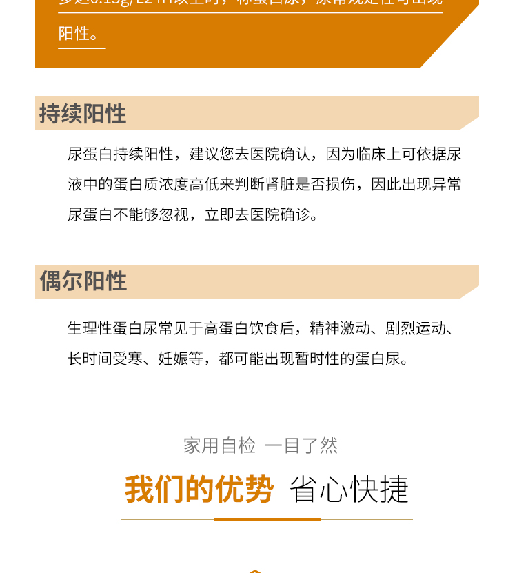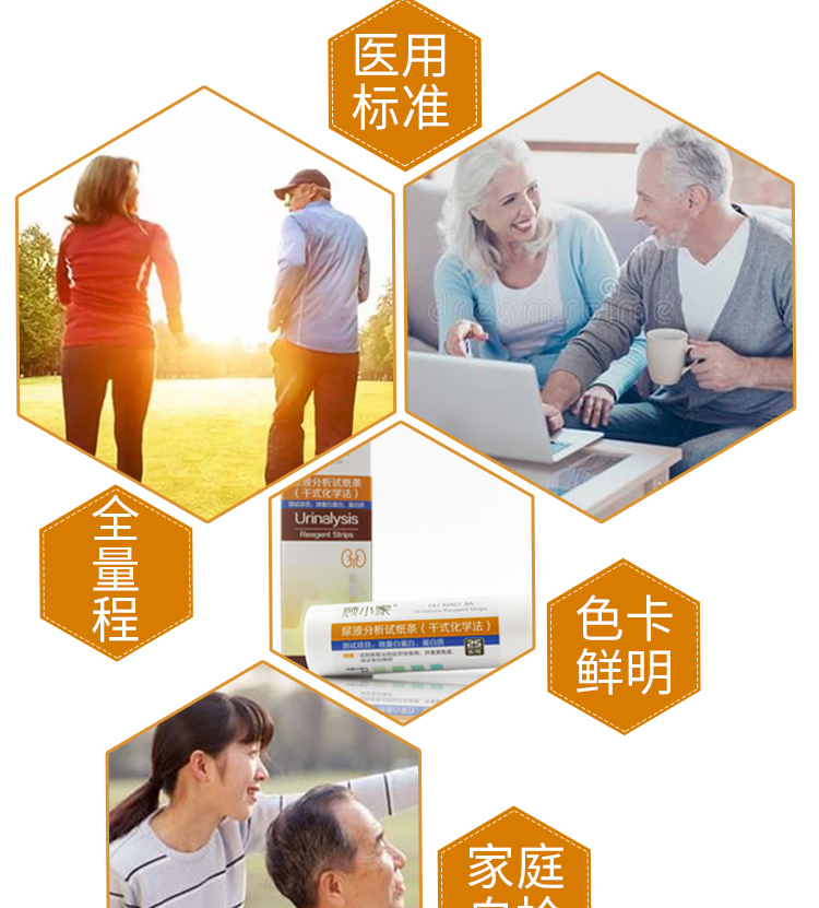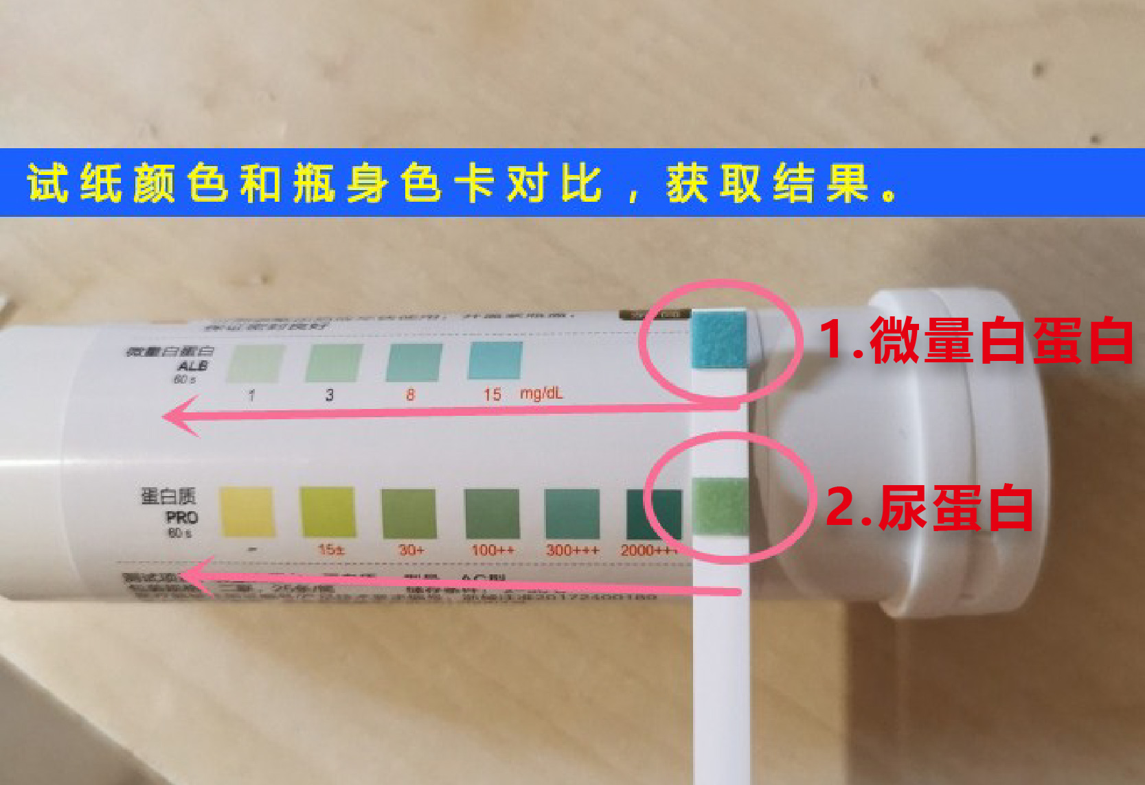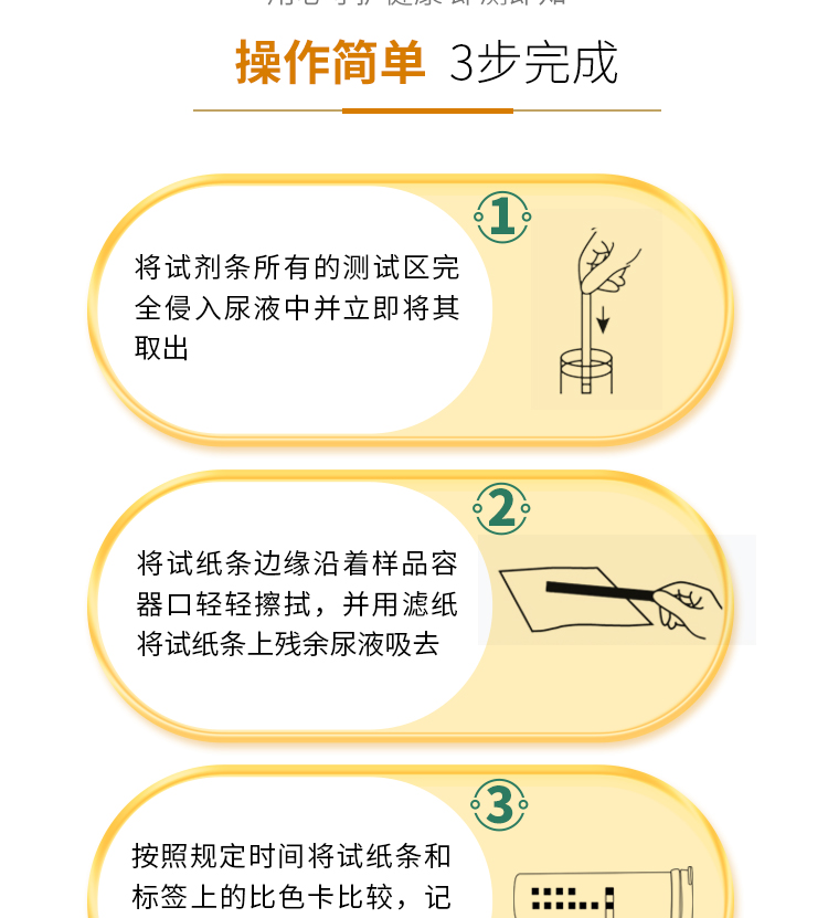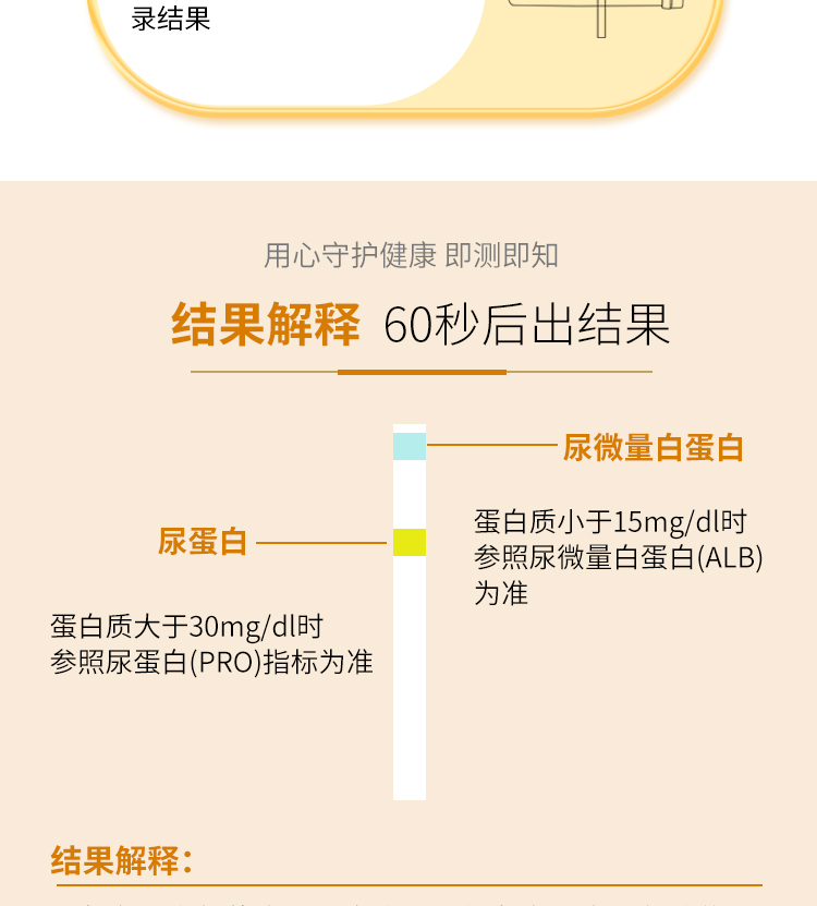 使用说明:1,试纸放入尿液样本中1~2秒取出, 2、用纸巾吸走多余尿液,3、等待60秒后与瓶身色卡对比,读取数值.