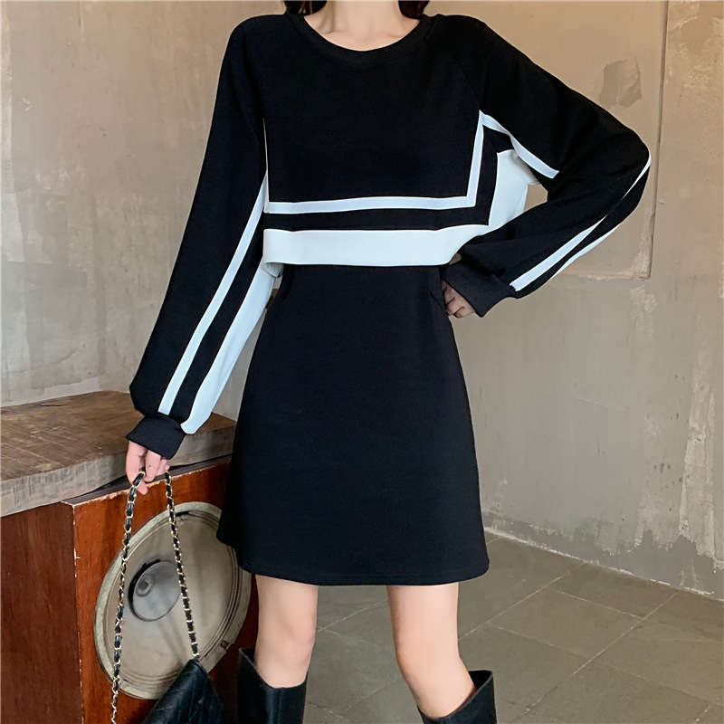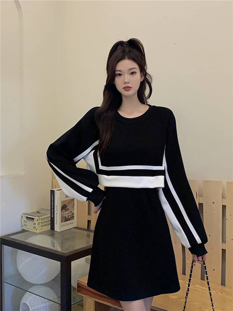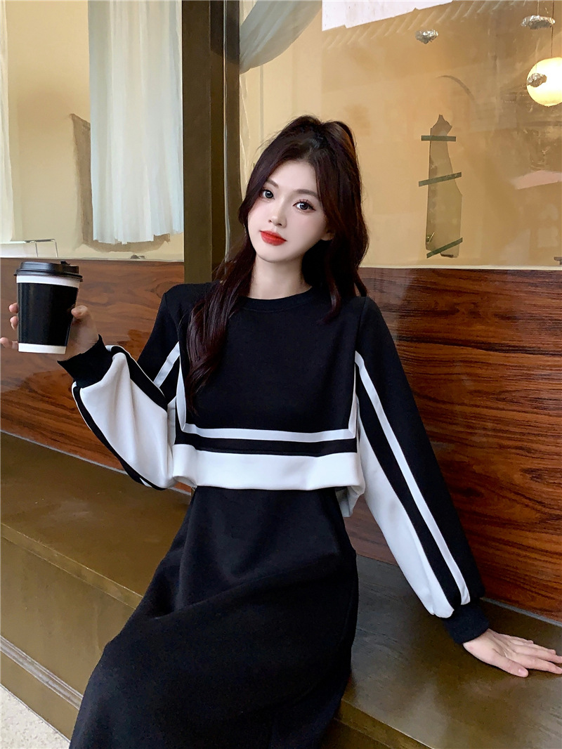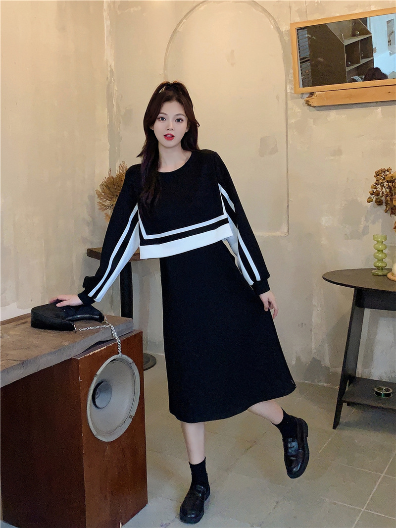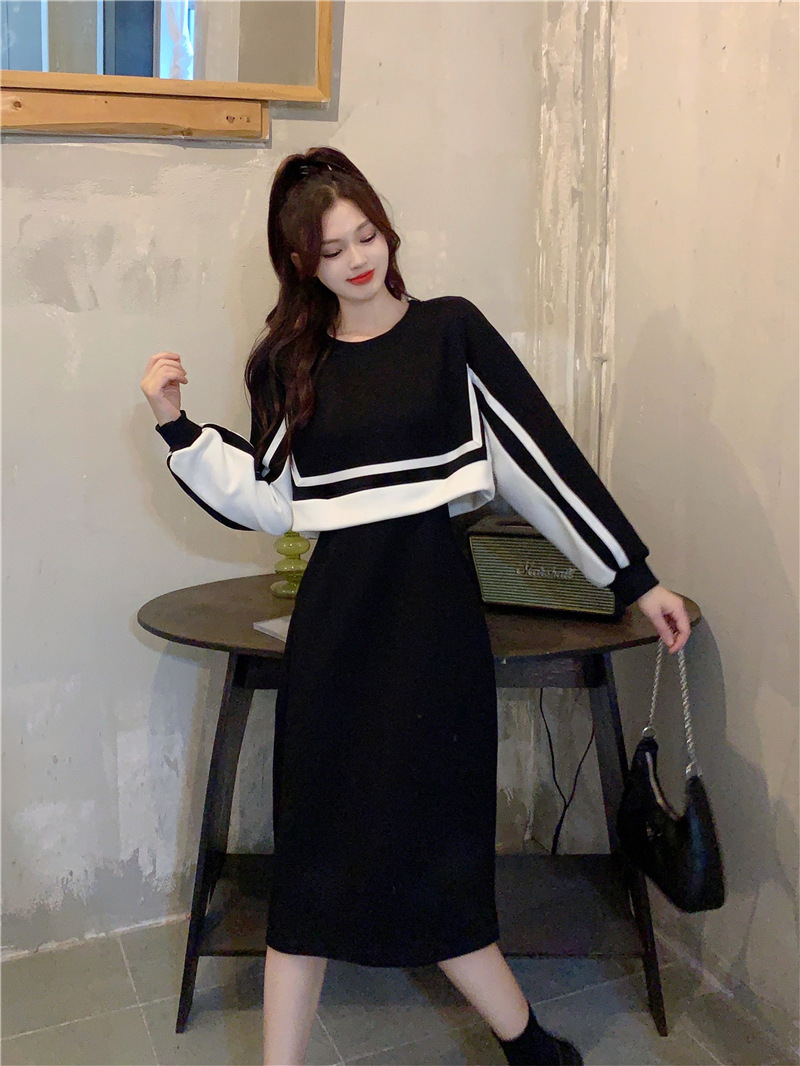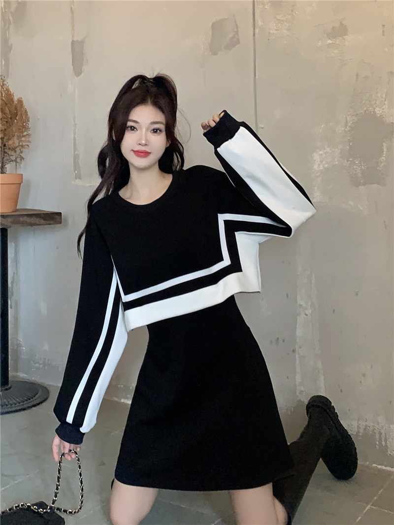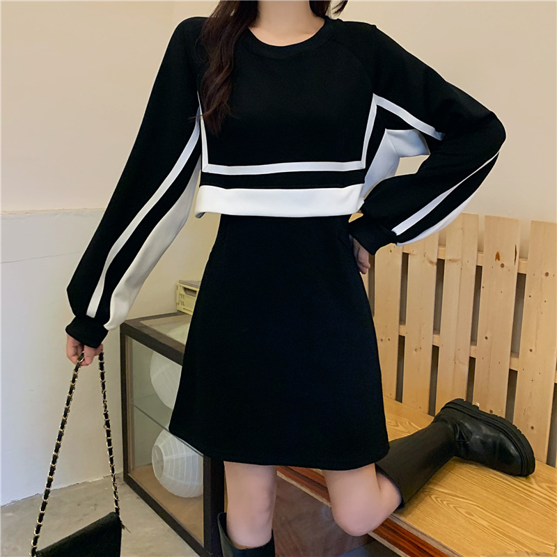 春季【黑白拼接撞色 连衣裙女】设计感 收腰显瘦 假两件卫衣裙子