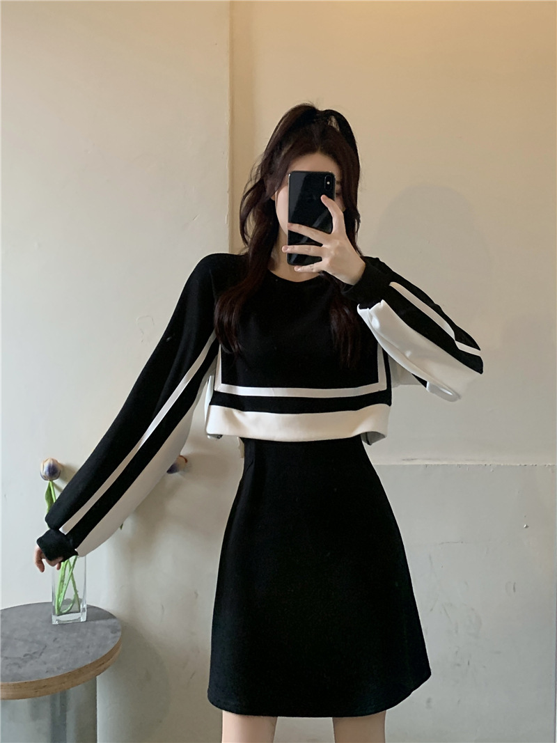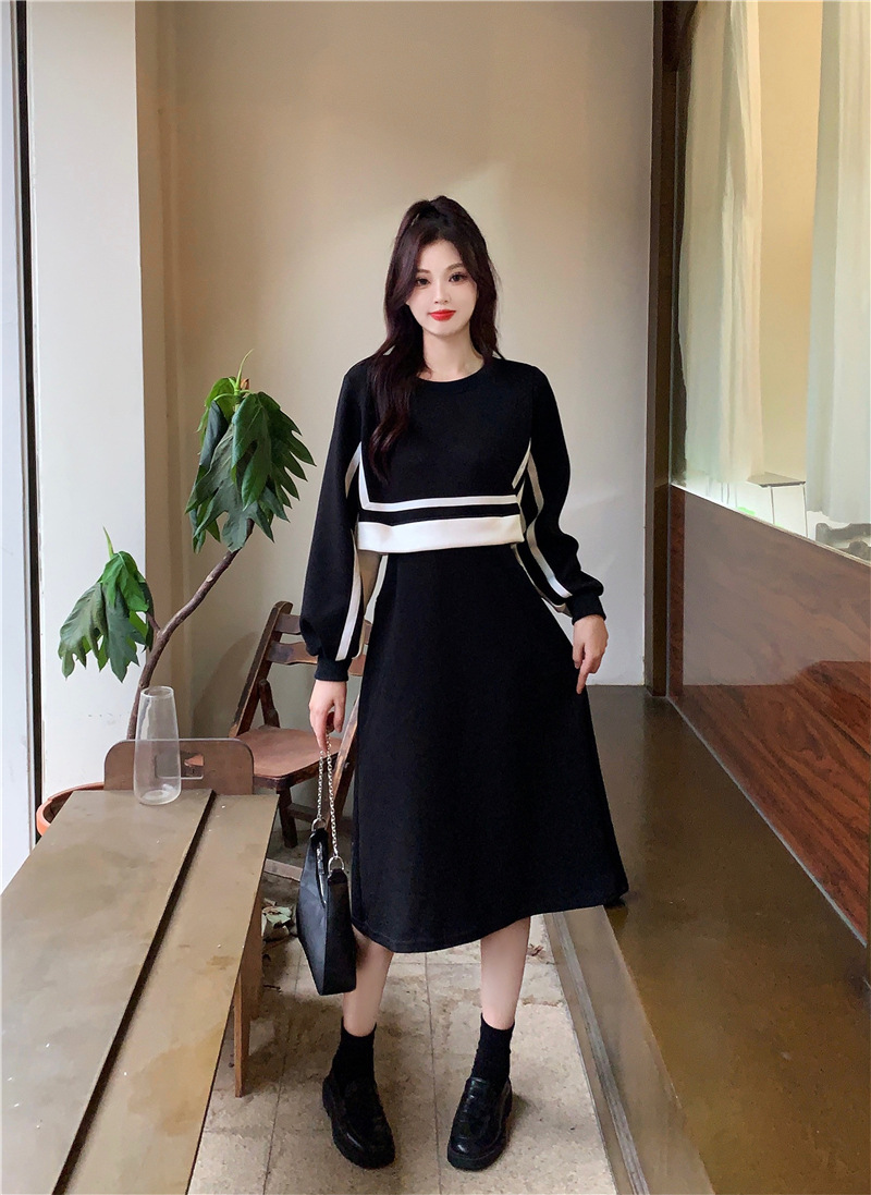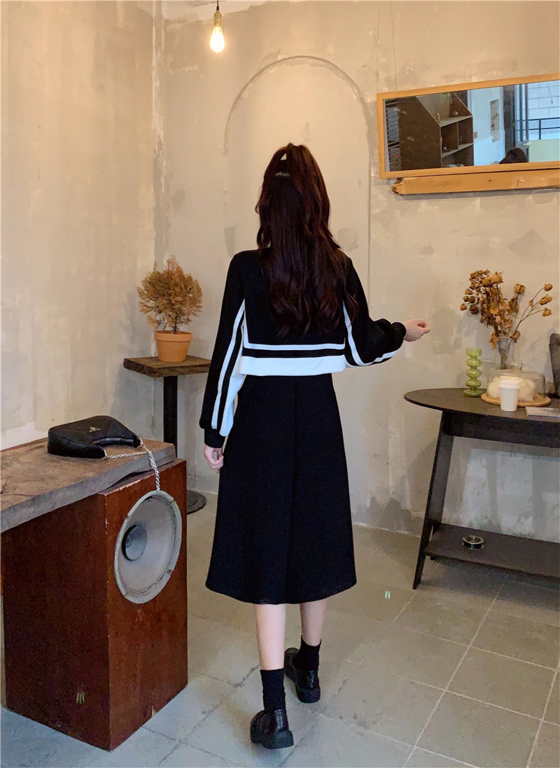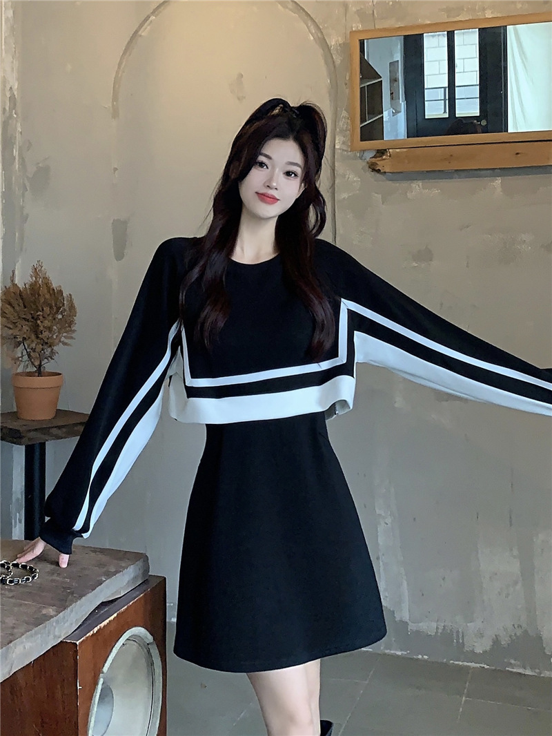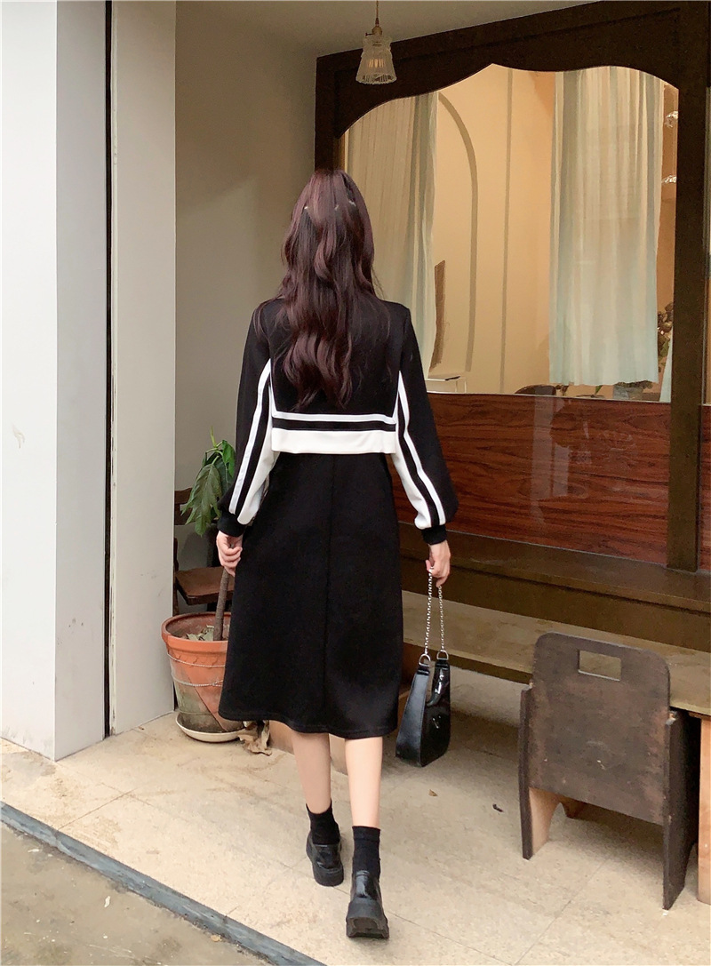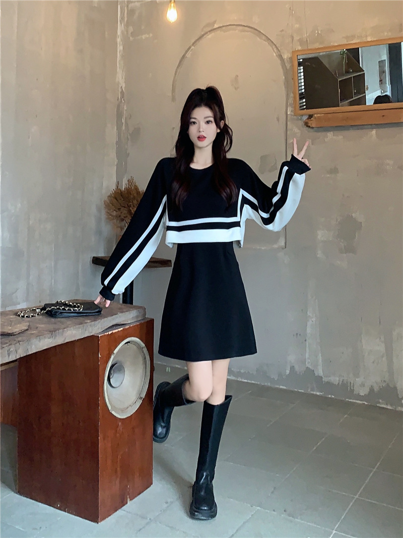 春季【黑白拼接撞色 连衣裙女】设计感 收腰显瘦 假两件卫衣裙子