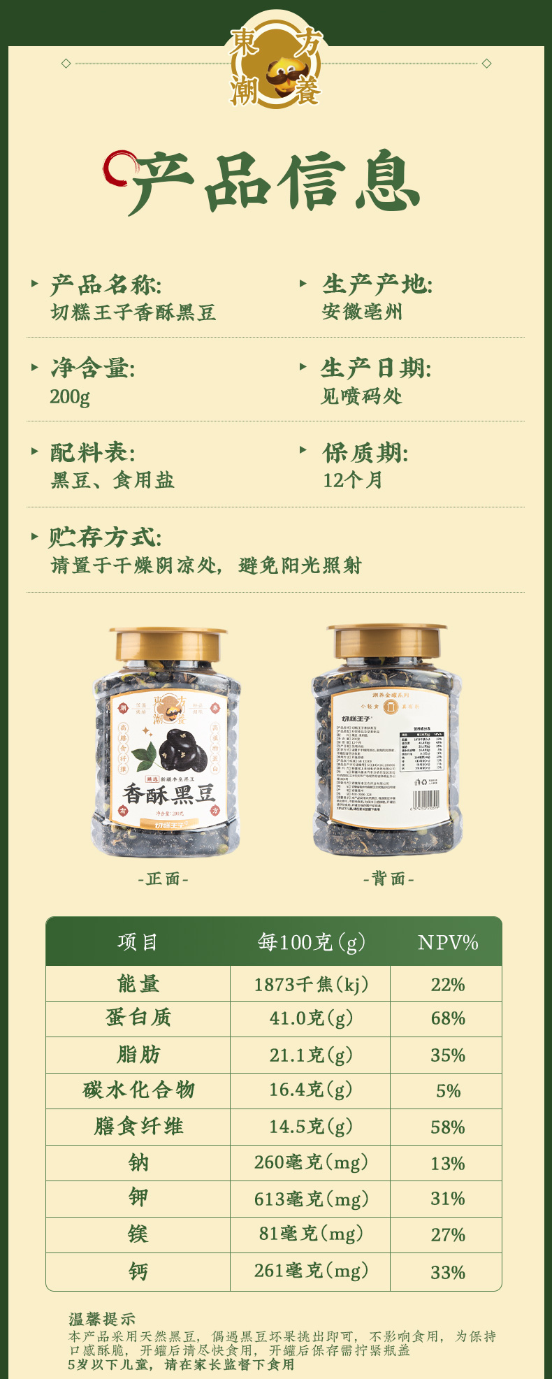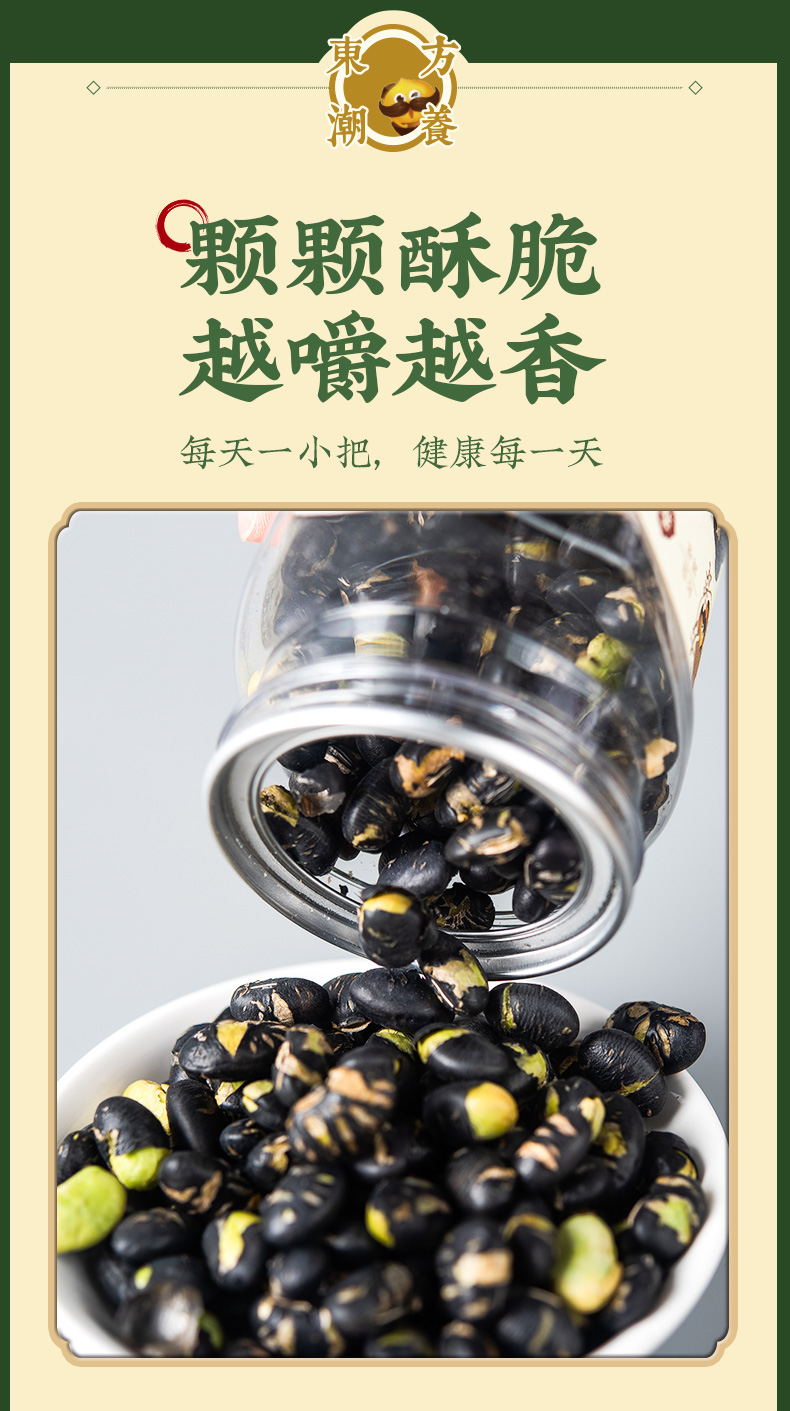 【温馨提示】本产品采用天然黑豆,偶遇黑豆坏果挑出即可,不影响食用,为保持口感酥脆,开罐后请尽快食用,开罐后保存需拧紧瓶盖
