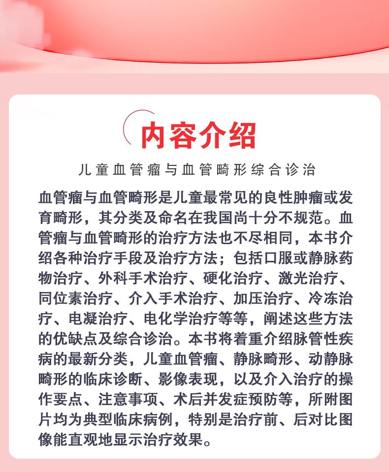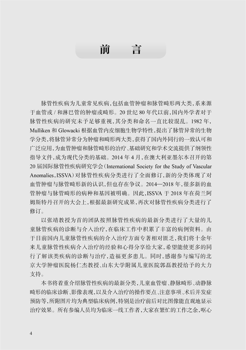血管瘤与血管畸形是儿童最常见的良性肿瘤或发育畸形,其分类及命名在我国尚十分不规范。血管瘤与血管畸形的治疗方法也不尽相同,本书介绍各种治疗手段及治疗方法;包括口服或静脉药物治疗、外科手术治疗、硬化治疗、激光治疗、同位素治疗、介入手术治疗、加压治疗、冷冻治疗、电凝治疗、电化学治疗等等,阐述这些方法的优缺点及综合诊治。本书将着重介绍脉管性疾病的最新分类,儿童血管瘤、静脉畸形、动静脉畸形的临床诊断、影像表现,以及介入治疗的操作要点、注意事项、术后并发症预防等,所附图片均为典型临床病例,特别是治疗前、后对比图像能直观地显示治疗效果。