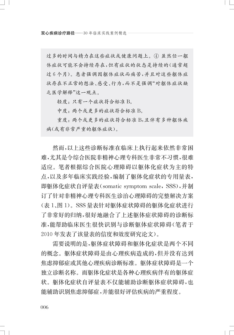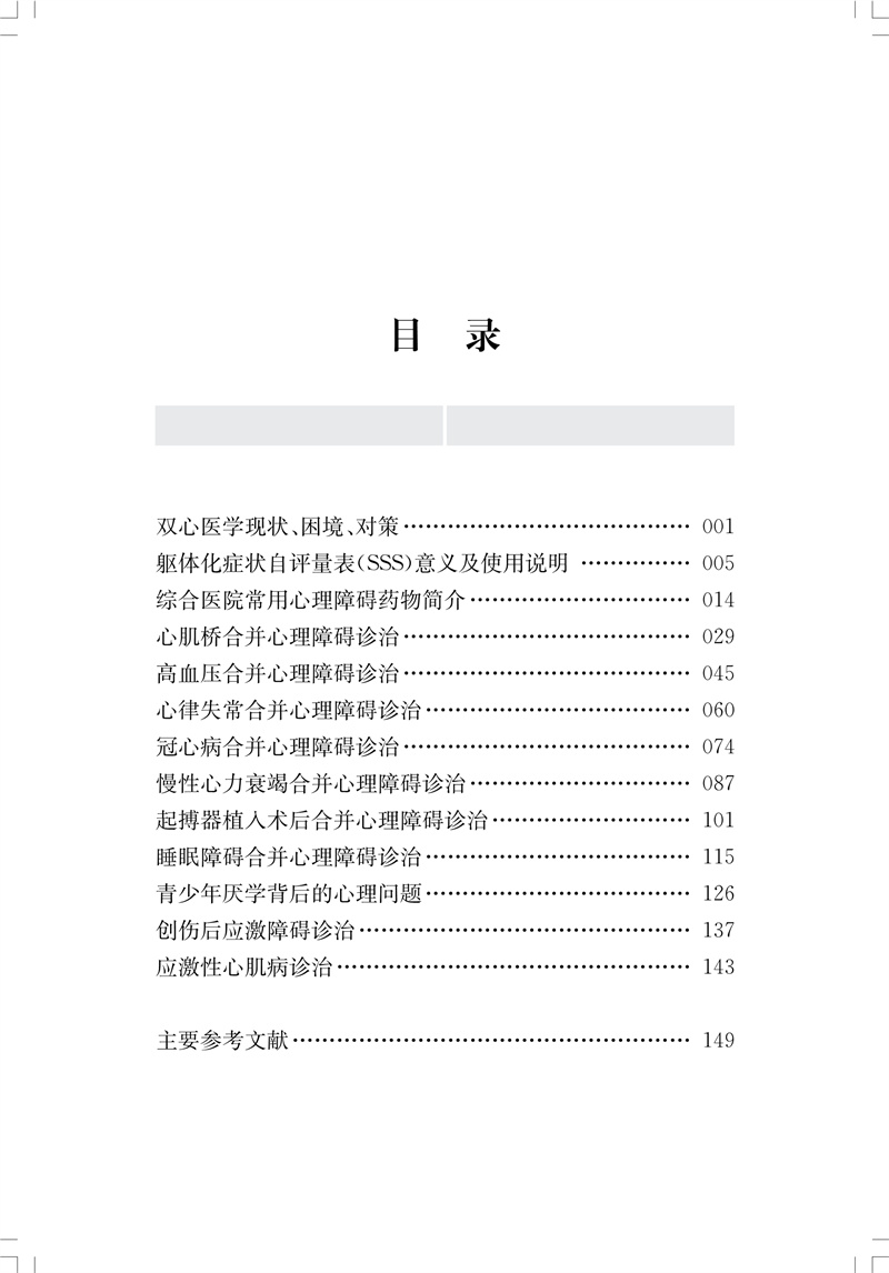本书以临床上10类心血管疾病中出现的非精神科心理疾病诊治为主线,并精选作者近30年双心疾病临床典型案例24例,以阐述如何利用“躯体化症状自评量表(SSS)”5分钟内即可快速做出心理疾病判断。每一案例根据病史摘要、诊断思路、治疗与随访、讨论四个板块展开,并根据诊治中出现的要点和难点,给出针对性策略,强调临床实用性。本书的出版,奠定了双心疾病完整方案形成的基础工作,有助于解决困扰综合医院医生对“如何判断患者是否有心理疾病及严重程度”等难题,提高双心疾病的治愈率。 SSS量表为本书作者毛家亮于2010年首创。该量表与美国精神病学会(APA)于2013年年会上发布的《精神疾病诊断与统计手册》第5版有关“躯体症状障碍”内容的描述不谋而合,且该量表被写入中国第一个双心医学里程碑文献、由胡大一教授领衔编撰的《在心血管内科就诊患者的心理处方中国专家共识》。 本书可供心血管内科医生及综合医院非精神科医生参考、借鉴。