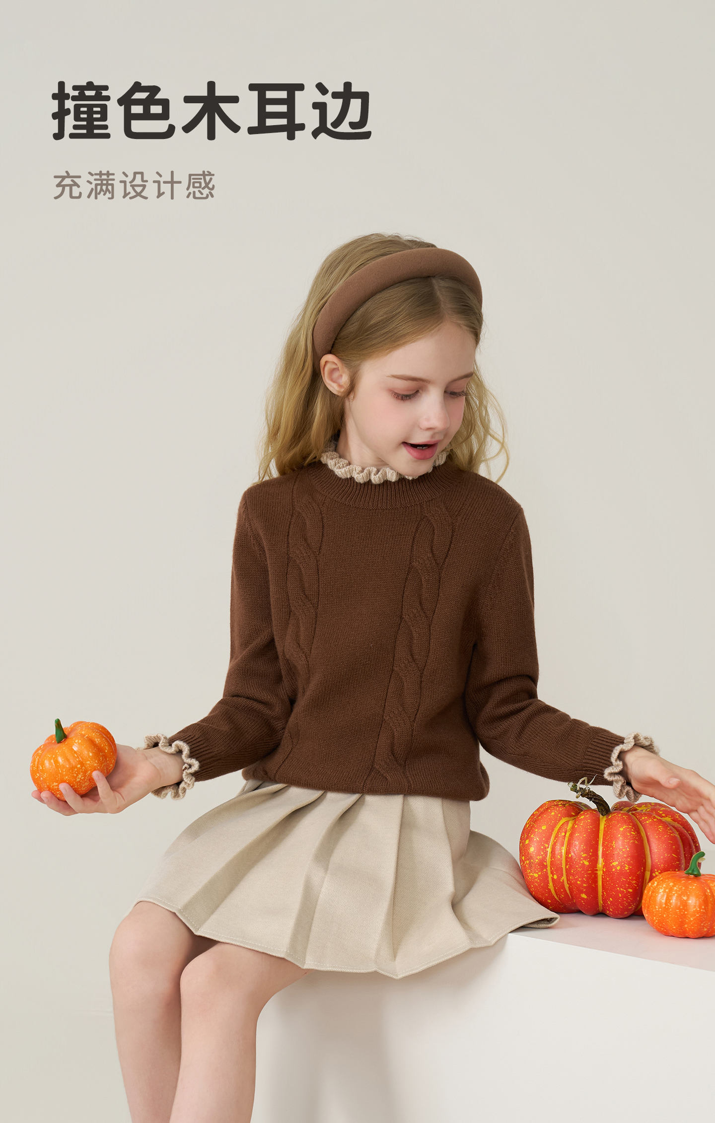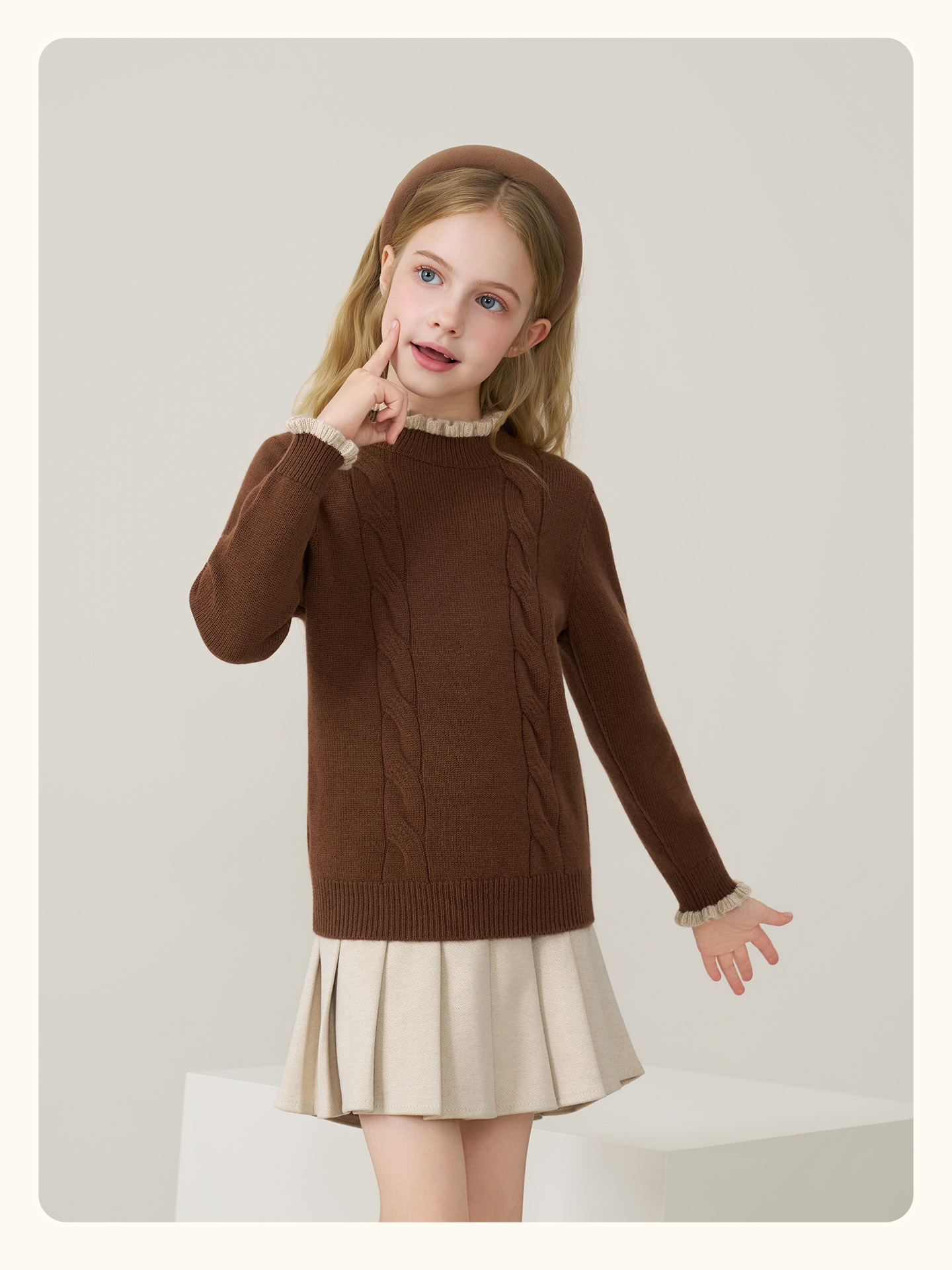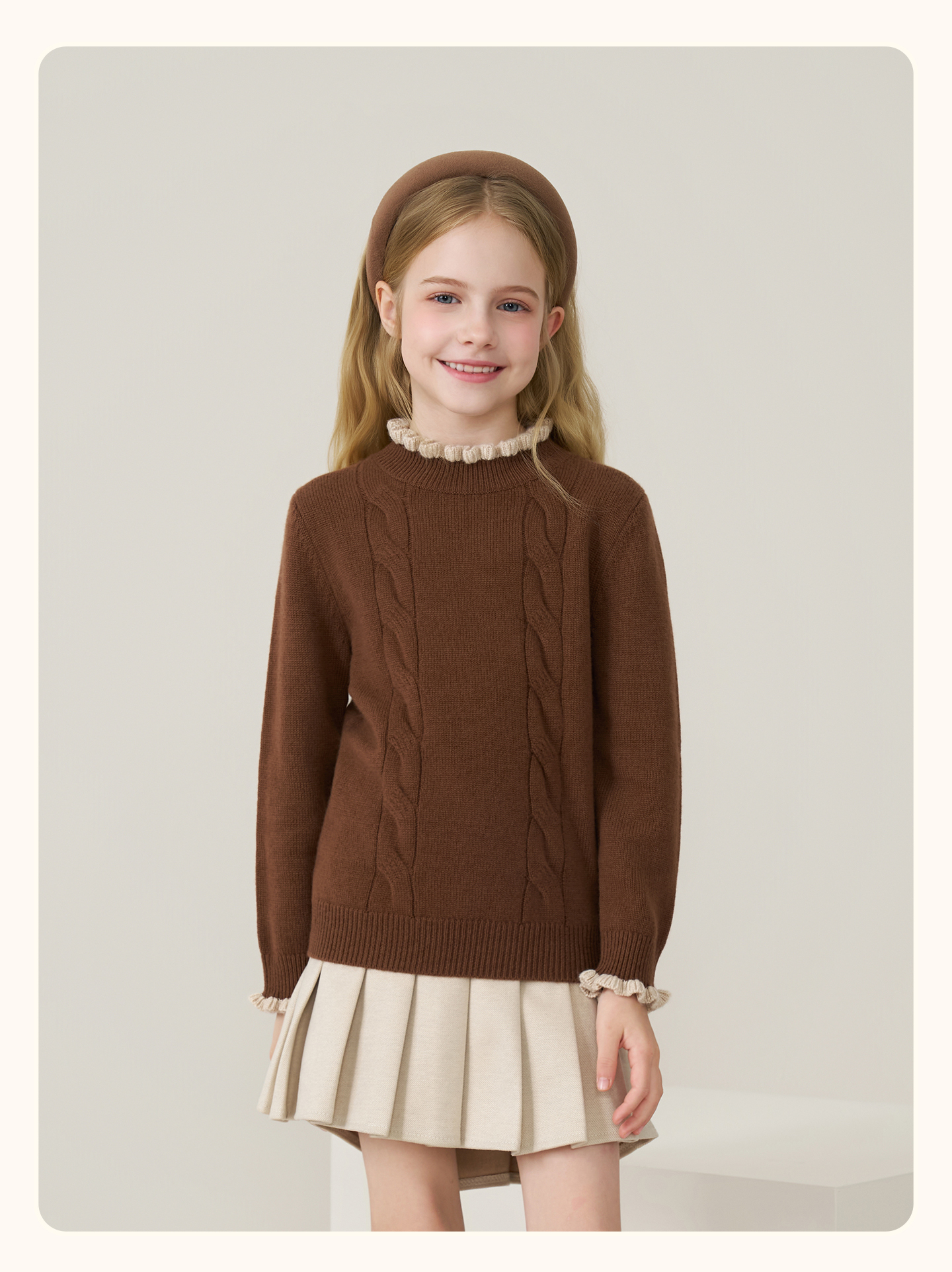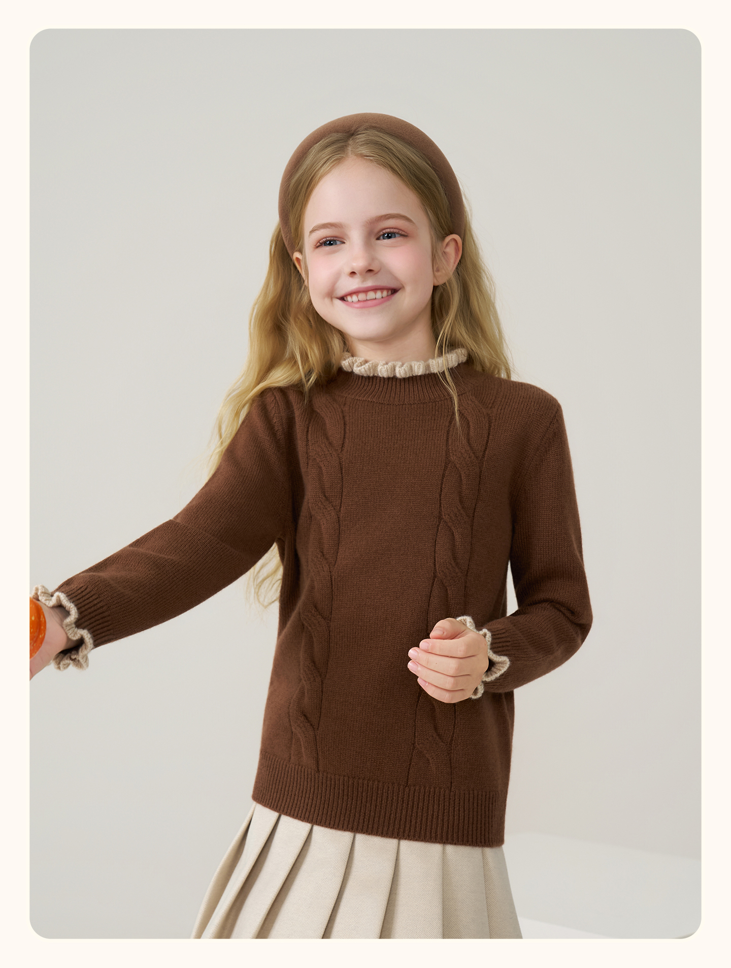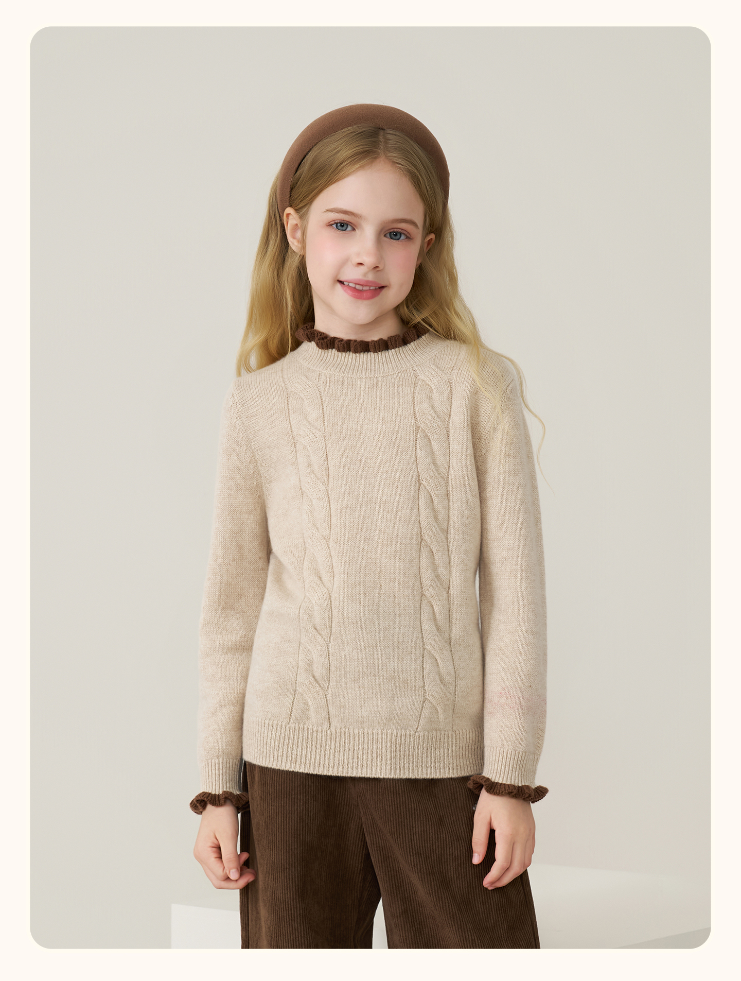 儿童100%羊绒衫2025秋冬女童半高领撞色木耳边棕色针织衫套头毛衣