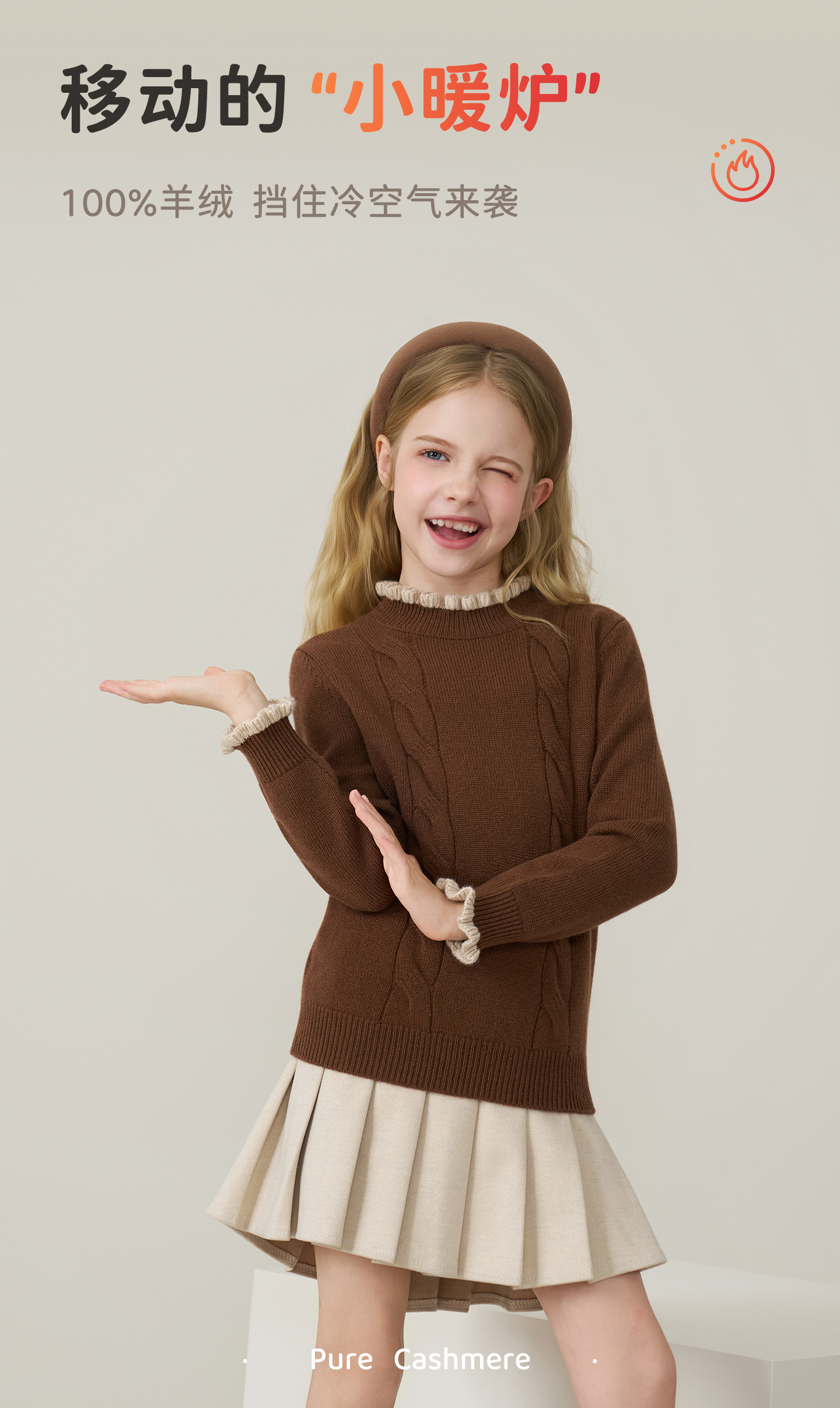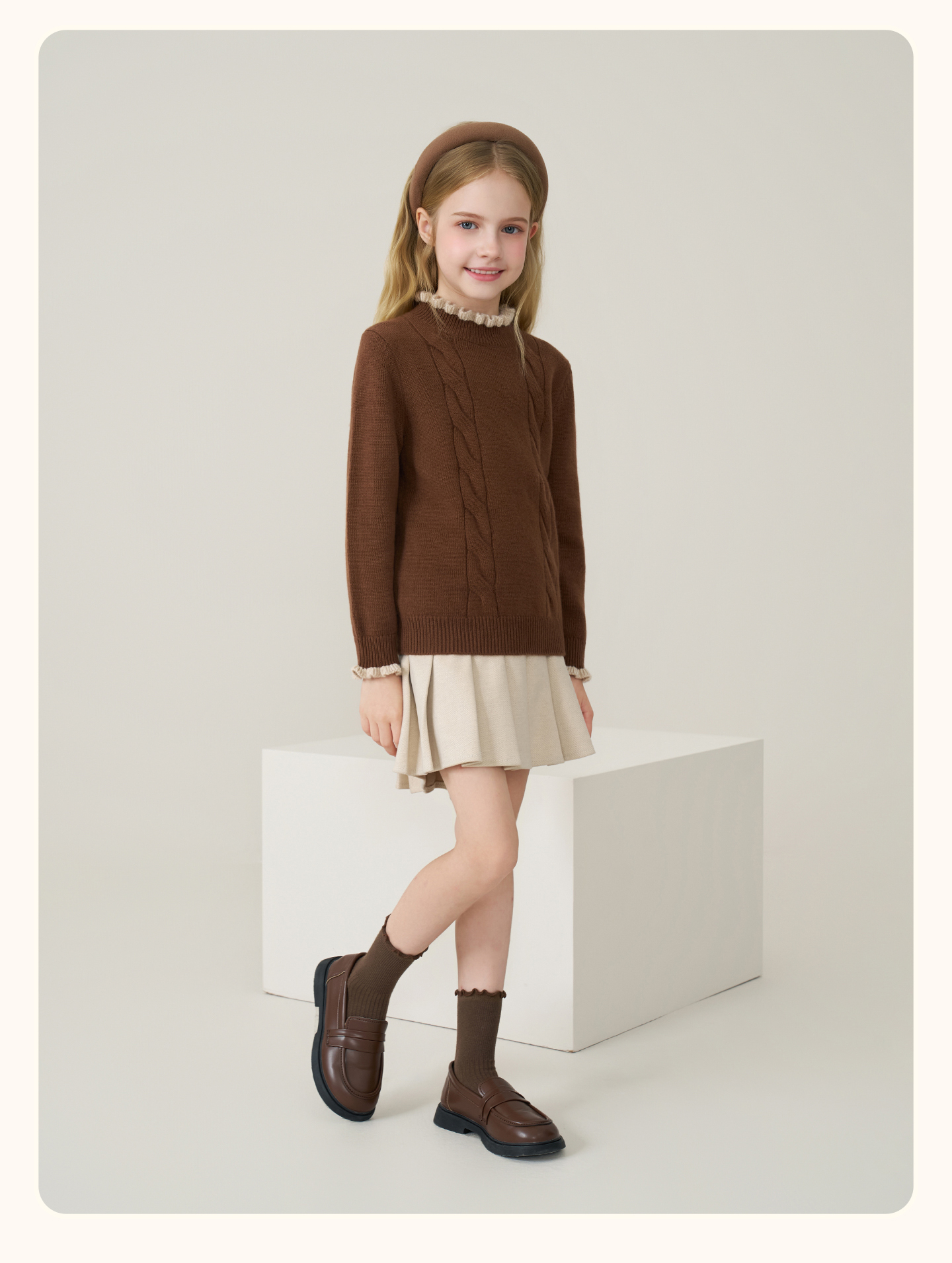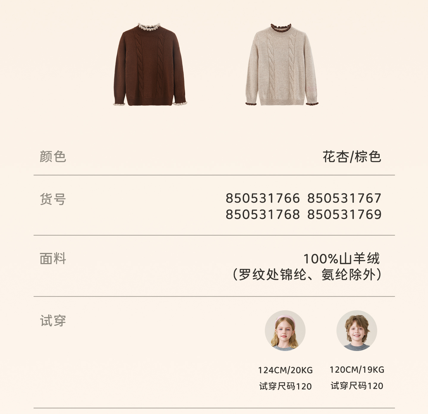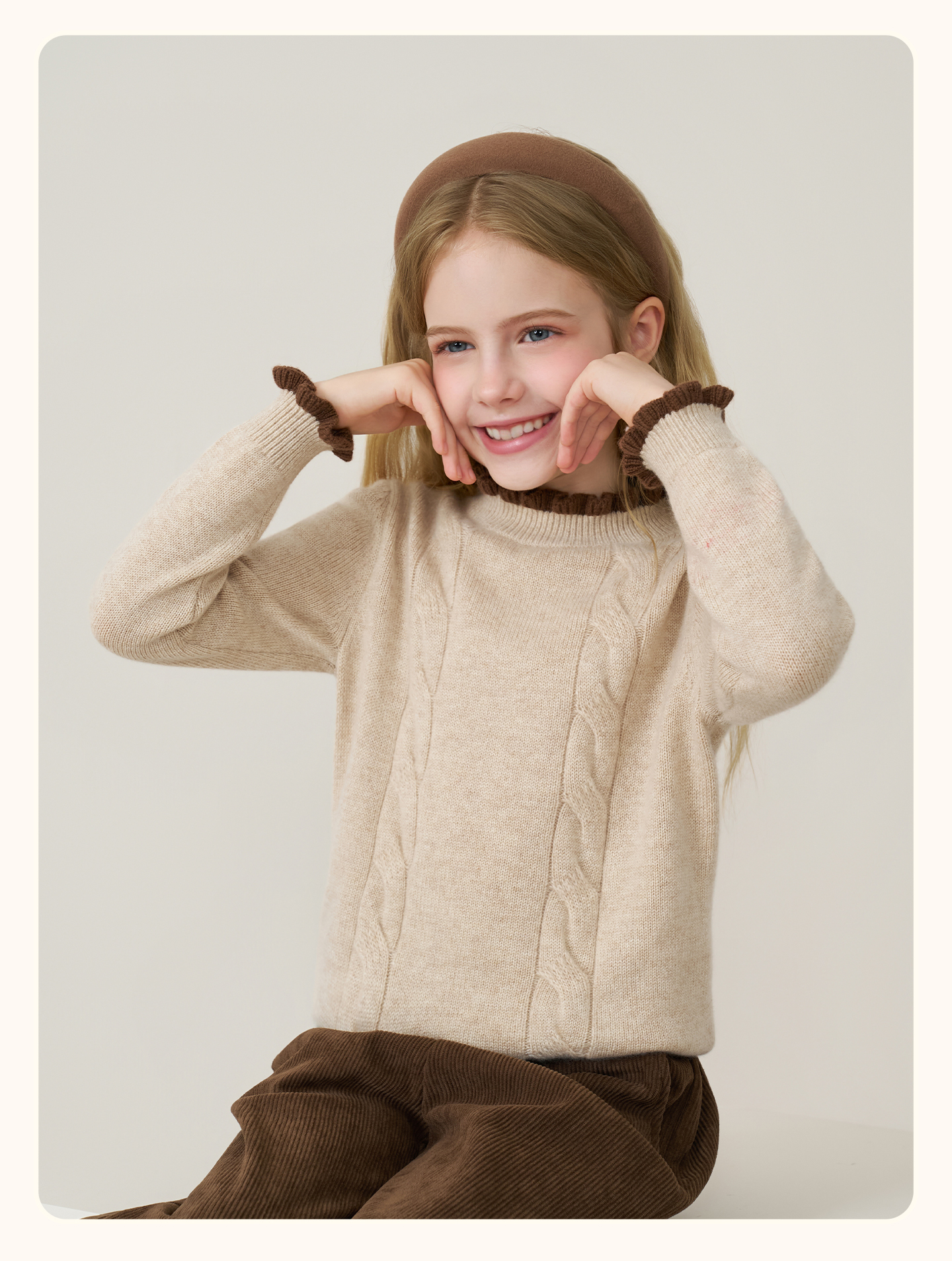 儿童100%羊绒衫2025秋冬女童半高领撞色木耳边棕色针织衫套头毛衣