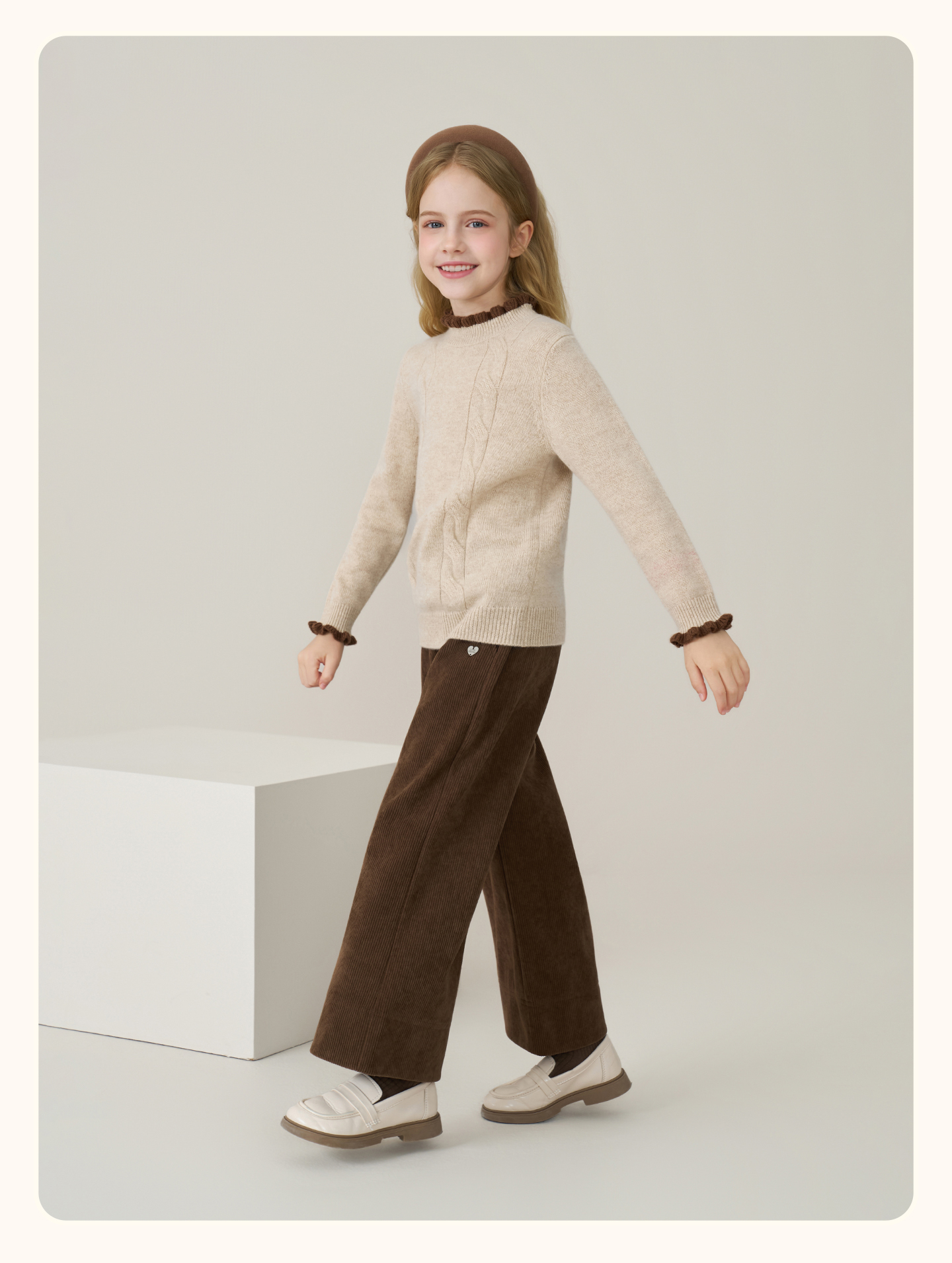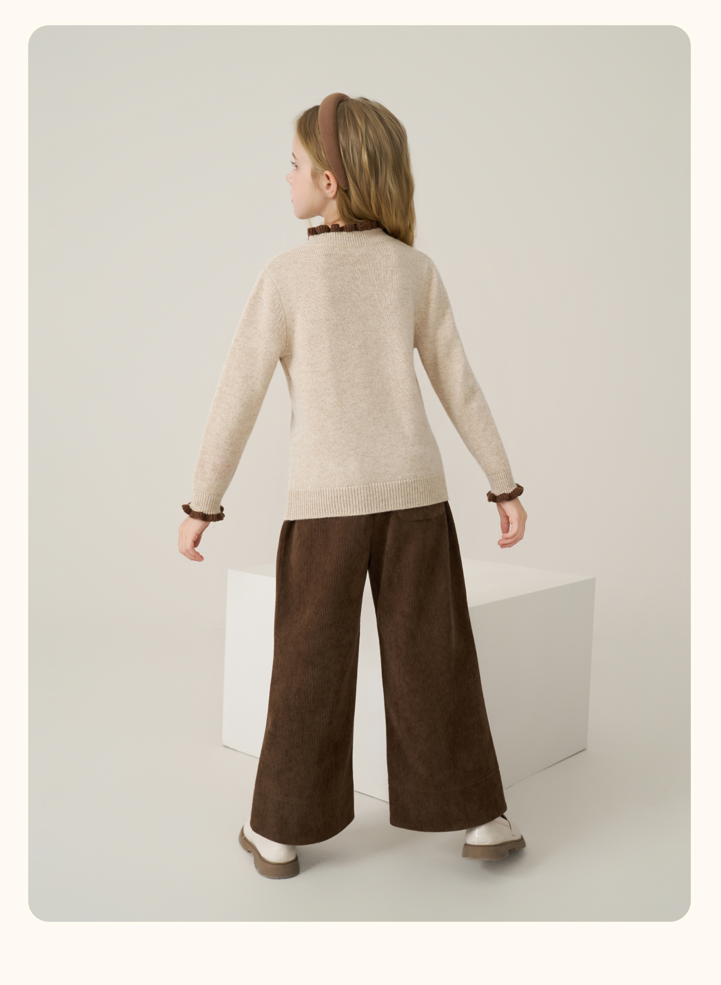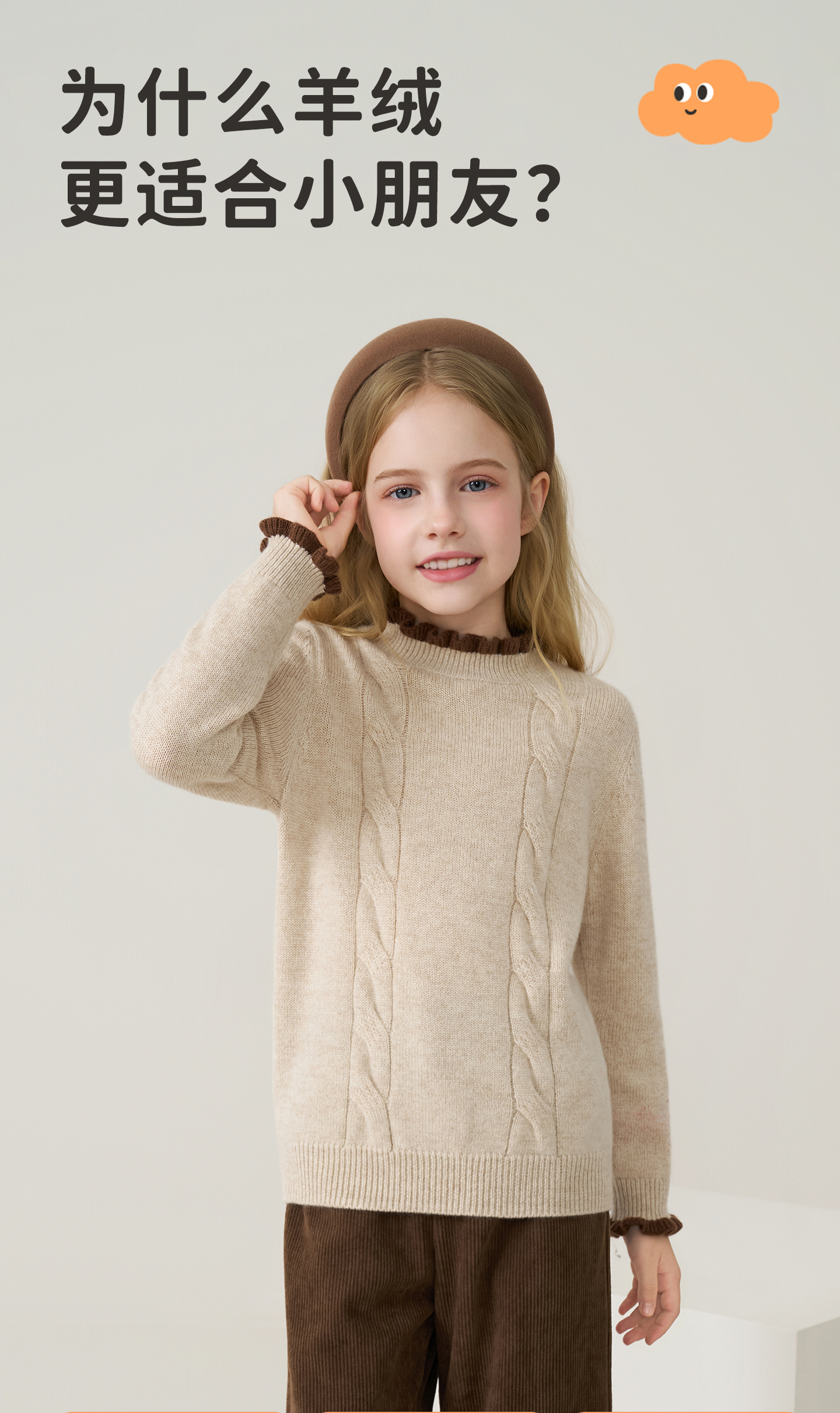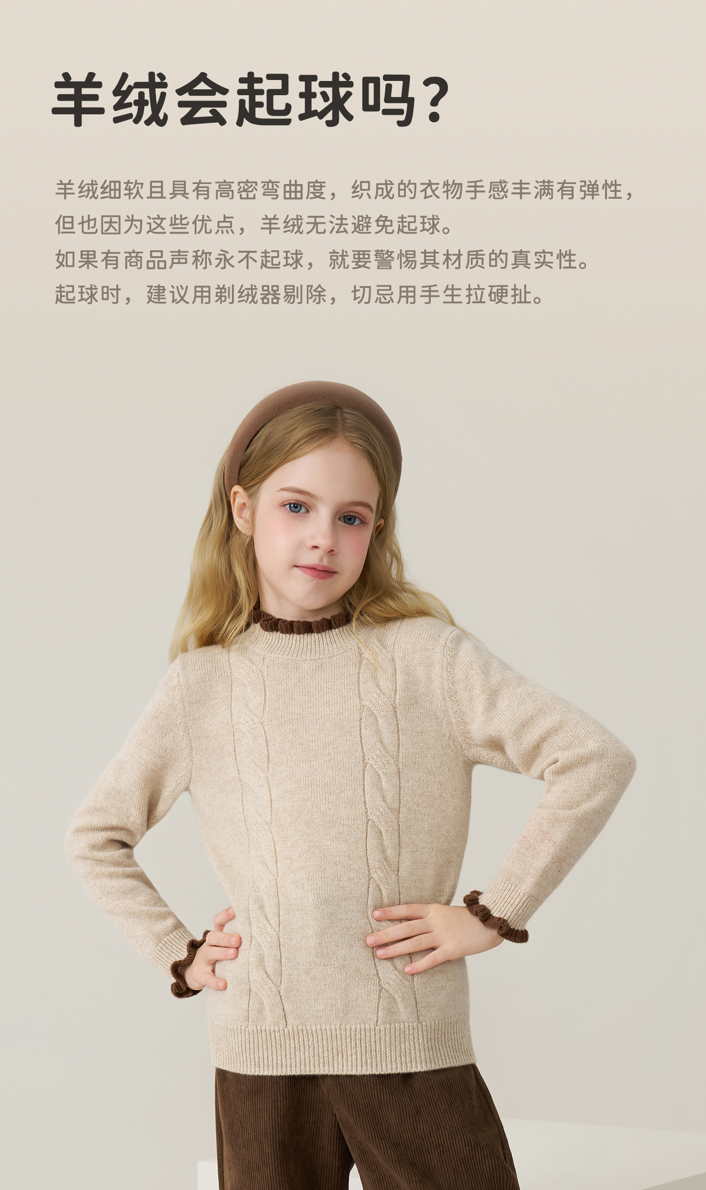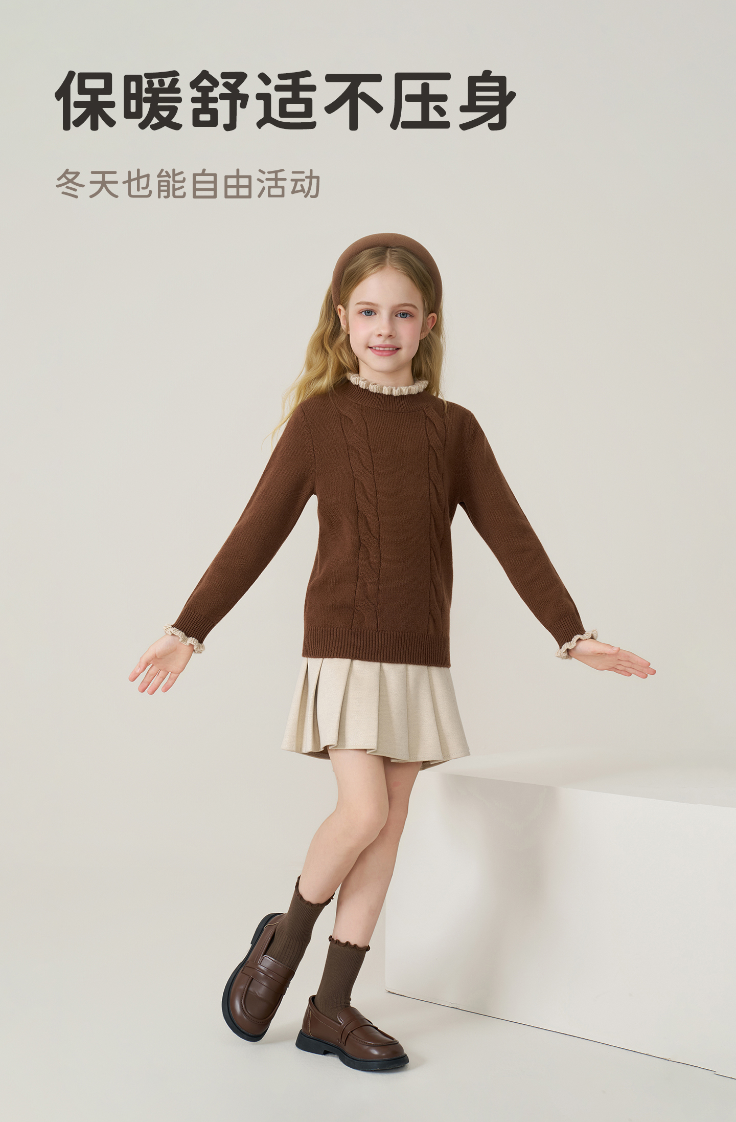 儿童100%羊绒衫2025秋冬女童半高领撞色木耳边棕色针织衫套头毛衣