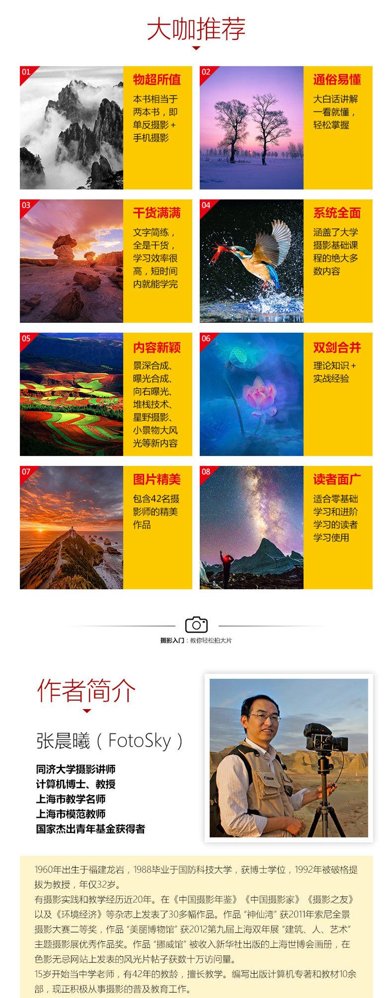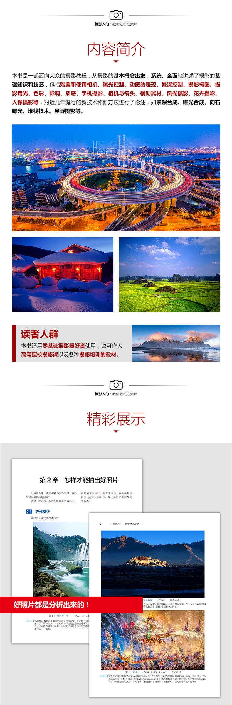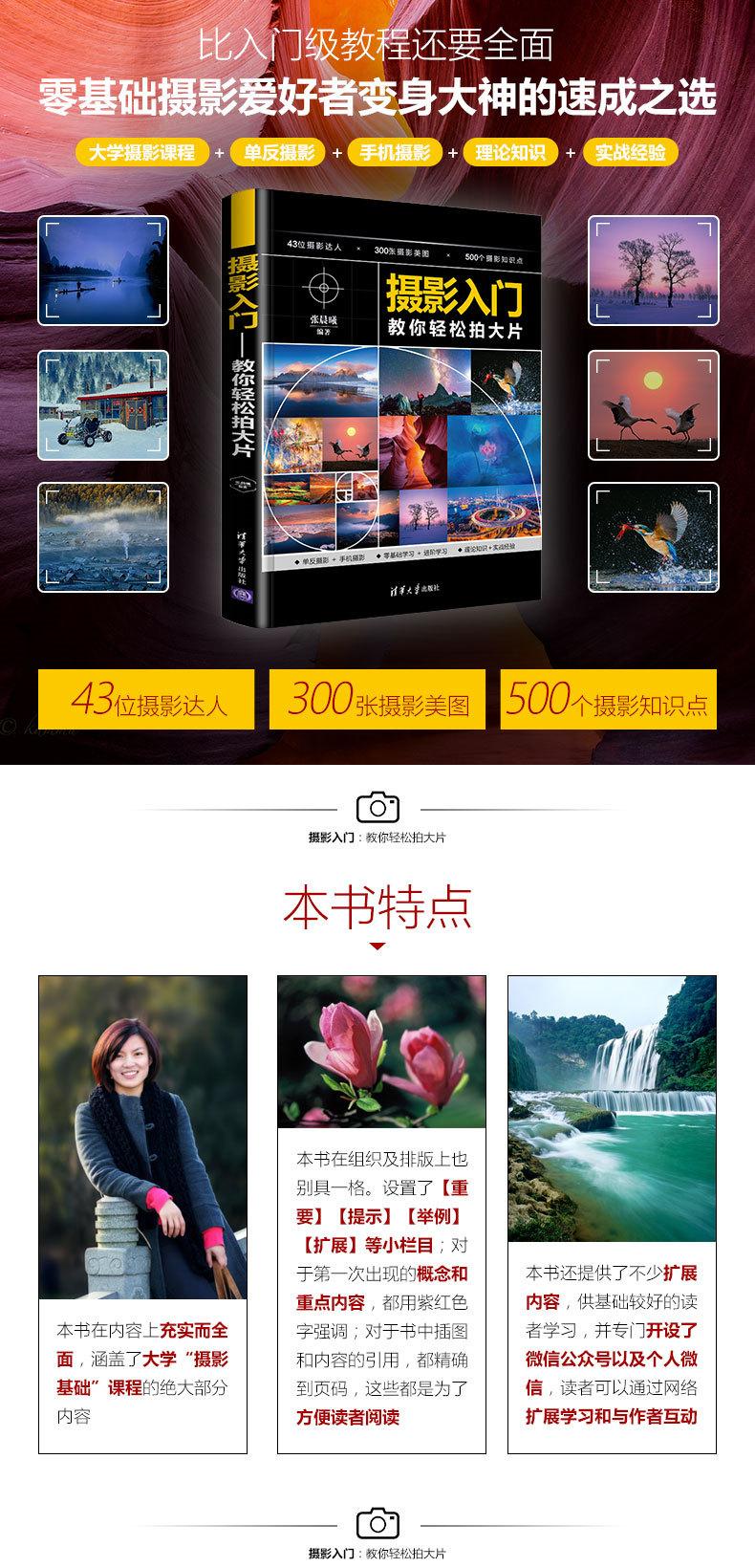 自??序经过4年的努力,我终于把这本书奉呈到您的眼前。我是一名大学摄影讲师,擅长教书和写教材,我的小小动机是写一本很受欢迎的摄影入门教程。近年来,喜欢摄影的人越来越多了。为了拍出好照片,有必要系统地学习摄影基础知识和技艺。 虽然网上普及摄影知识的教学内容很多,但大多是碎片化的,而且往往不专业,甚至有错误(包括百度百科中的内容)。为了少走弯路,还是应该选择一本好的教程,系统、高效率地学习。我对市面上教摄影的书做了全面调查,结果不尽人意。有的书很厚,写得啰嗦;有的书只讲操作,不讲原理,太简单;而有的书则内容较陈旧。于是,我决定发挥自己的教学特长,来写这本书。本书的特色是简练、易懂、高效、内容新、全面,涵盖了相机摄影、手机摄影的知识和技巧。本书写了4年,不仅是因为工作忙,更主要的是我花了很多时间反复精简、提炼,力求用最明白、最通俗的文字把知识点讲透,使读者看得轻松,学得快,收获大。本书......