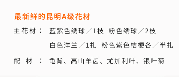 蓝紫色绣球1枝、粉色绣球2枝、白色洋兰1扎、粉色紫色桔梗各半扎、搭配龟背、高山羊齿、尤加利叶、银叶菊