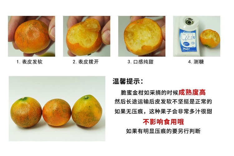 5. 产品外包装轻微破损及果实轻微碰伤不影响食用。金柑因在自然状态下生长而有的斑点、疤痕、着色不均等属于正常现象不售后。