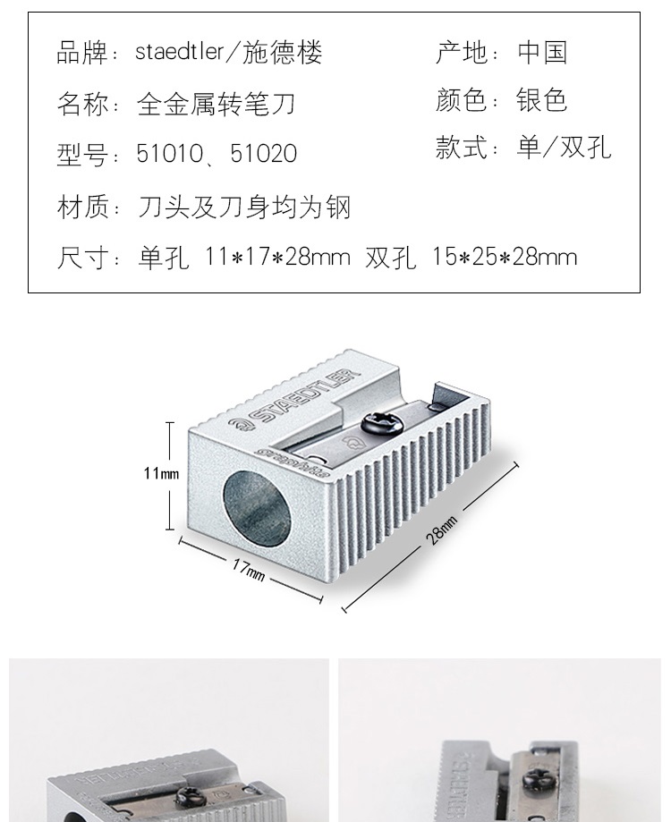 德国施德楼STAEDTLER金属单孔卷笔刀 金属全钢制转笔刀削笔刀笔刨单孔51010