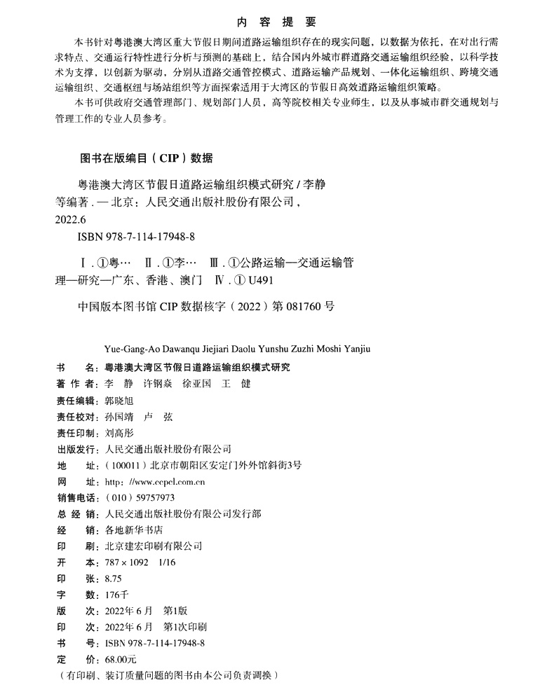 书名:粤港澳大湾区节假日道路运输组织模式研究