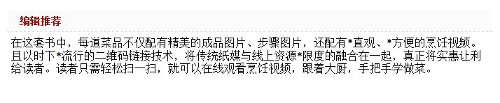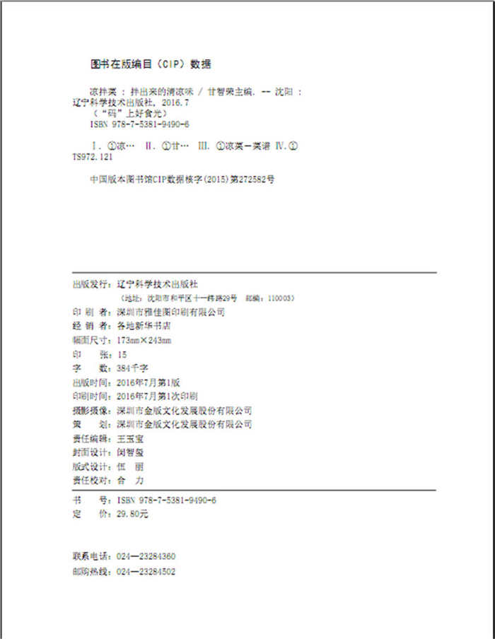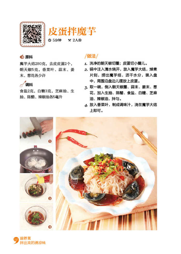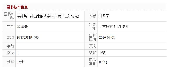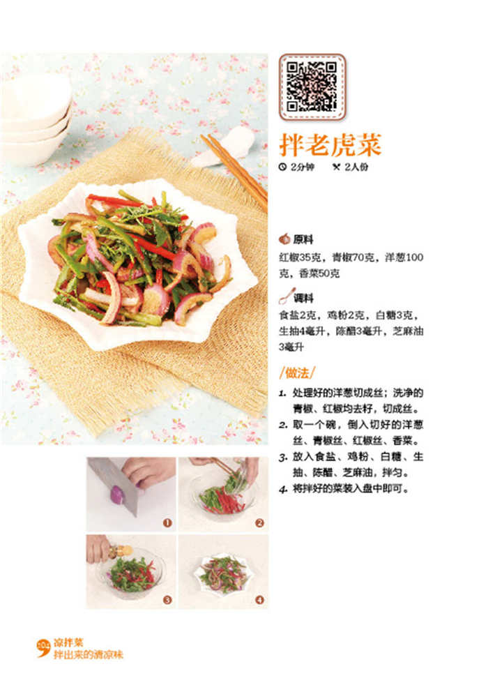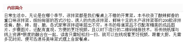 凉拌菜——拌出来的清凉味目录章 拌出幸福滋味 002 花样刀法,切出视觉美感 004 凉拌菜的四季养生秘诀 006 经典味汁的配制方法,为美味加分 008 凉拌菜的点睛之笔——调味油 009 五条小妙招,让沙拉变得更美味 010 凉拌菜制作有讲究 第二章 就好重口味,酸辣鲜香惹人馋味 013 酸辣肉片 014 湘卤牛肉 015 新版夫妻肺片 016 米椒拌牛肚 016 麻酱拌牛肚 017 凉拌麻辣羊腰 018 重庆口水鸡 019 怪味鸡丝 021 香辣鸡丝豆腐 022 无骨泡椒凤爪 023 麻辣鸭血 024 拌干明太鱼 025 蒜薹拌鱿鱼 025 青椒鱿鱼丝 027 中华海蜇 029 陈醋黄瓜蜇皮 031 虾仁五彩大拉皮 032 辣味虾皮 033 泡椒黄瓜 035 酱汁黄瓜卷 036 黔味凉拌茄子 037 擂辣椒 038 酱笋条 039 香辣春笋 041 炝拌手撕蒜薹 042 水豆豉拌折耳根 043 酸辣鱼腥草 045 野山椒杏鲍菇 047 酸辣魔芋结 048 山西陈醋花生 第三章 西式沙拉,缤纷绚丽的“舶来品” 050 德式土豆鸡蛋沙拉 051 木瓜鸡肉沙拉 053 鸡肉沙拉 054 秋葵鸡肉沙拉 054 鲜橙三文鱼 055 牛油果三文鱼芒果沙拉 056 土豆金枪鱼沙拉 057 百香果蜜梨海鲜沙拉 058 凯撒沙拉 059 菠菜沙拉 061 番茄奶酪沙拉 062 西蓝花沙拉 063 洋葱蘑菇沙拉 065 香草芦笋口蘑沙拉 067 彩椒鲜蘑沙拉 068 蛋黄土豆泥沙拉 069 土豆胡萝卜沙拉 071 油醋汁素食沙拉 072 冰镇芝麻蔬菜沙拉 073 蔬菜沙拉 073 华尔道夫沙拉 074 什锦蔬果沙拉 075 奶酪茄果沙拉 076 牛油果沙拉 077 冰镇橙汁水果沙拉 079 酸奶水果沙拉 080 橙盅酸奶水果沙拉 第四章 无肉不欢,吃一口就停不下嘴 083 如意白肉卷 085 白煮肉 086 蒜泥白肉 087 芝麻肉片 088 黄瓜里脊片 089 香辣肉丝白菜 090 芝麻拌猪耳 091 豆芽拌猪肝 092 卤猪腰 093 凉拌猪肚丝 094 香葱红油拌肚条 095 凉拌牛肉紫苏叶 097 豆腐皮拌牛腱 099 葱油百叶 100 芥末牛百叶 101 凉拌牛百叶 103 红油蹄筋 105 葱油拌羊肚 106 葱香拌兔丝 107 海蜇黄瓜拌鸡丝 108 魔芋鸡丝荷兰豆 109 茼蒿拌鸡丝 110 鸡丝茄子土豆泥 111 鸡肉拌黄瓜 112 凉拌手撕鸡 112 香糟鸡条 113 棒棒鸡 115 椒麻鸡片 116 苦瓜拌鸡片 117 凉拌西芹鸡片 117 西芹拌鸡胗 119 卤水拼盘 120 车前草拌鸭肠 121 老醋拌鸭掌 122 炝拌鸭肝双花 第五章 汇聚鲜滋味,就是让你流口水 124 葱椒鱼片 125 金枪鱼鸡蛋杯 126 南乳墨鱼花 127 醋拌墨鱼卷 127 拌鱿鱼丝 129 五彩银针鱿鱼 130 椒油鱿鱼卷 131 豉汁鱿鱼筒 133 日式梅肉沙司拌章鱼秋葵 135 凉拌八爪鱼 136 蟹柳拌滑菇 137 醋拌海参 138 凉拌杂菜北极贝 139 芥辣荷兰豆拌螺肉 140 香菜拌血蛤 141 毛蛤拌菠菜 142 蒜香拌蛤蜊 142 淡菜拌菠菜 143 黄瓜拌花甲肉 145 老虎菜拌海蜇皮 146 醋香芹菜蜇皮 147 白菜梗拌海蜇 148 蒜泥海蜇萝卜丝 149 桔梗拌海蜇 149 黑木耳拌海蜇 150 虾皮老虎菜 151 海带丝拌菠菜 152 芝麻双丝海带 第六章 爽口素拌,原来蔬食也如此美味 154 姜汁拌空心菜 155 上海青拌海米 156 油淋菠菜 157 糖醋菠菜 158 枸杞拌菠菜 159 姜汁拌菠菜 160 凉拌田七叶 161 田七拌木耳 163 北京辣白菜 164 芥末墩儿 165 蛋丝拌韭菜 166 凉拌芹菜叶 167 凉拌嫩芹菜 167 黑蒜拌芹菜 169 炝拌生菜 170 金针菇拌紫甘蓝 171 凉拌爽口西红柿 172 酸辣木瓜丝 173 爽口酸辣瓜条 174 木耳拍黄瓜 175 凉拌黄瓜 176 椰子油拌彩椒 177 糖醋拌佛手瓜 177 彩椒拌苦瓜 178 生菜拌苦瓜 179 茄子拌青椒 181 手撕茄子 183 拌茄子土豆片 184 黄瓜拌土豆丝 185 香辣莴笋丝 186 凉拌莴笋条 187 白菜梗拌胡萝卜丝 188 醋香胡萝卜丝 189 西瓜翠衣拌胡萝卜 191 爽口凉拌菜 192 橄榄油芹菜拌白萝卜 193 南昌凉拌藕 194 亚麻籽油拌秋葵 195 凉拌秋葵 196 豆芽拌粉条 196 香辣黄豆芽 197 四季豆拌鱼腥草 198 腐乳凉拌鱼腥草 199 凉拌折耳根 200 洋葱拌腐竹 201 玉米拌洋葱 203 东北大拌菜 204 拌老虎菜 205 爽口拌菜 207 东北拌凉菜 208 豆皮拌豆苗 209 凉拌卤豆腐皮 210 五香豆腐丝 211 香干丝拌香菇 212 香菜香干丝 213 葱丝拌熏干 213 芹菜拌豆腐干 215 薄荷拌豆腐 217 什锦凉拌豆腐 218 凉拌油豆腐 219 枸杞拌蚕豆 220 五香黄豆香菜 221 红油拌秀珍菇 223 清拌金针菇 224 手撕杏鲍菇 225 橄榄油蒜香蟹味菇 226 红油拌杂菌 227 凉拌银耳 228 乌醋花生黑木耳 229 凉拌木耳 231 五彩大拉皮 232 皮蛋拌魔芋 |