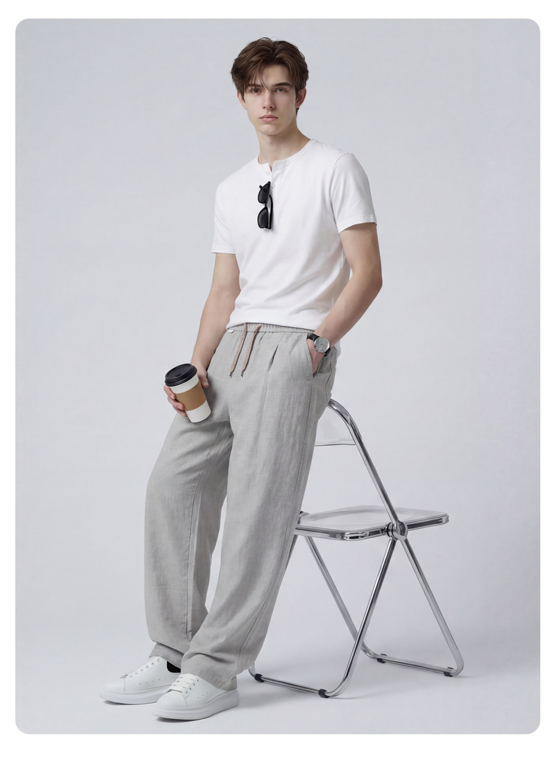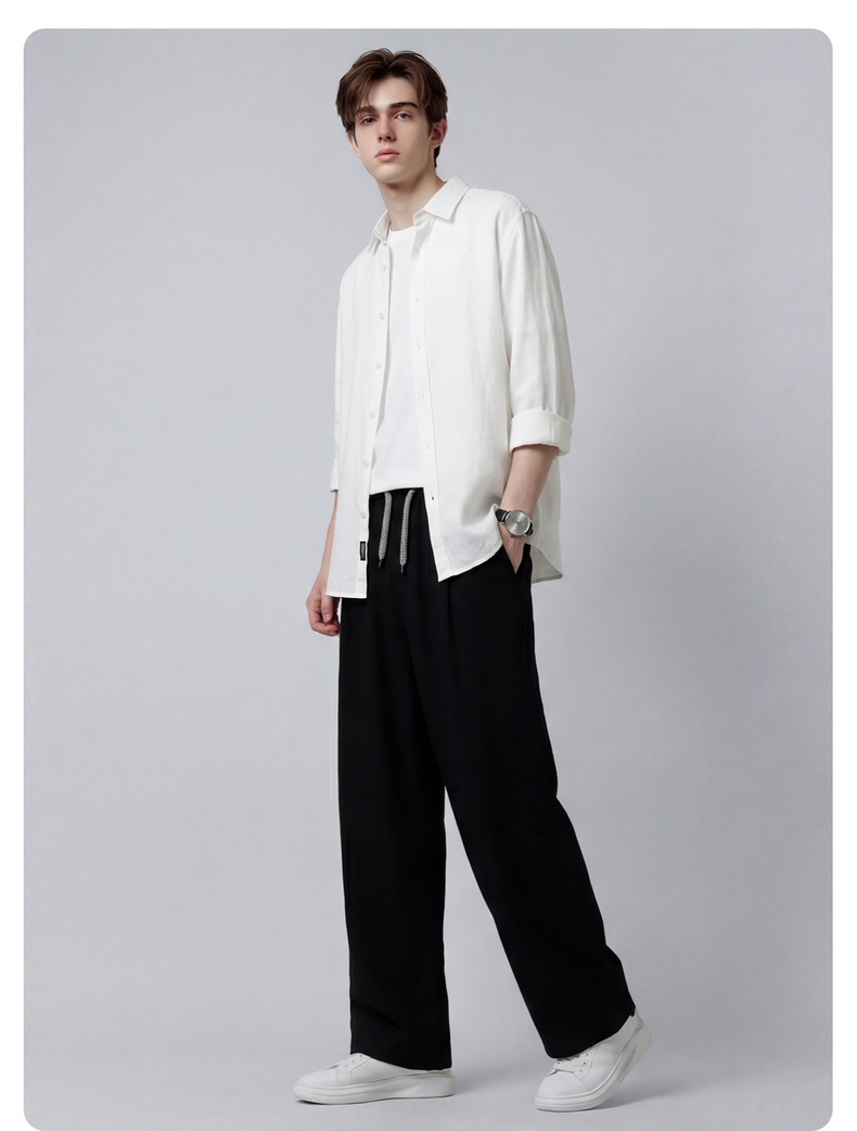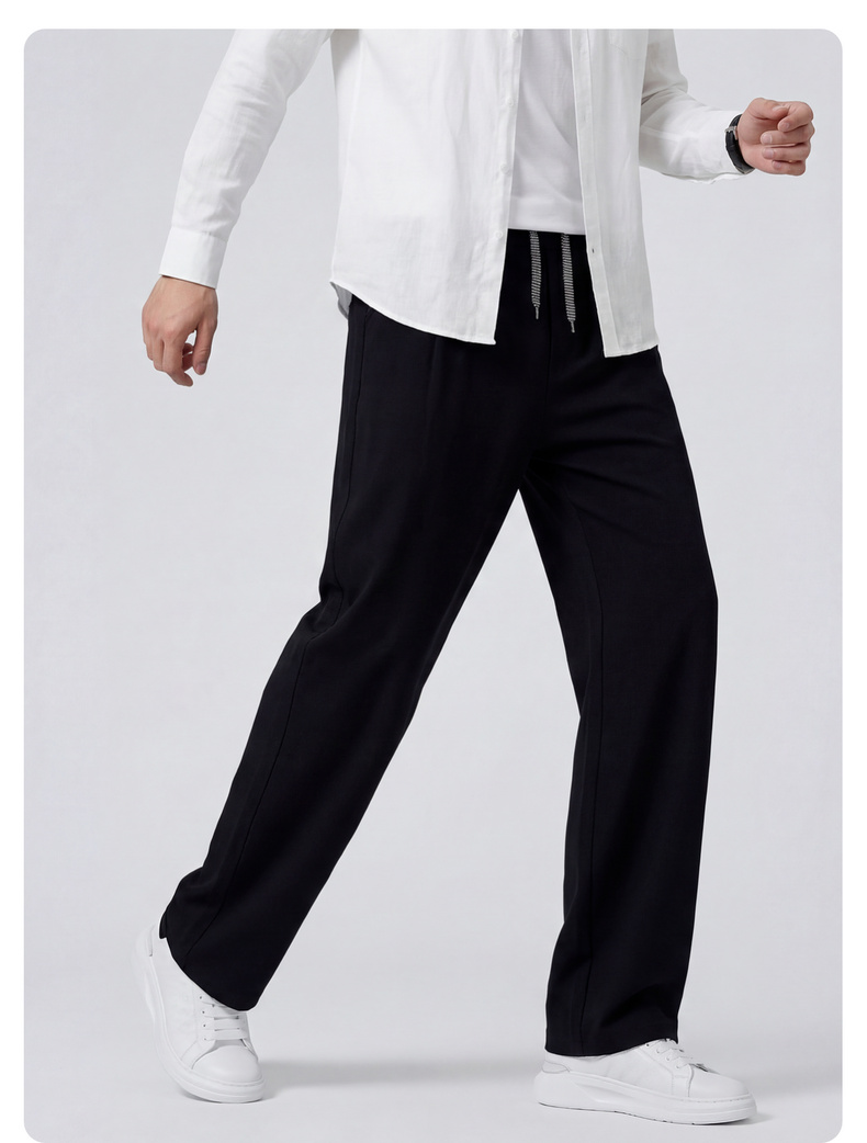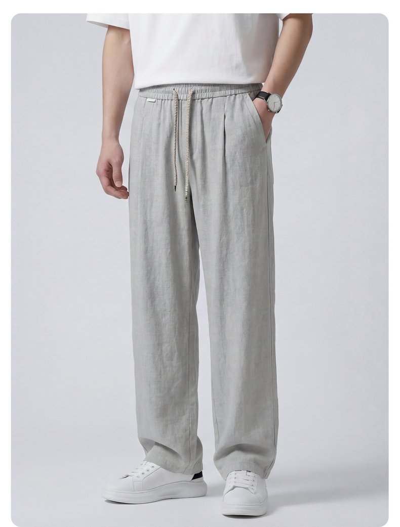 【含亚麻】圣得西宽松直筒裤子男款2026新款春季松紧腰休闲弯刀裤