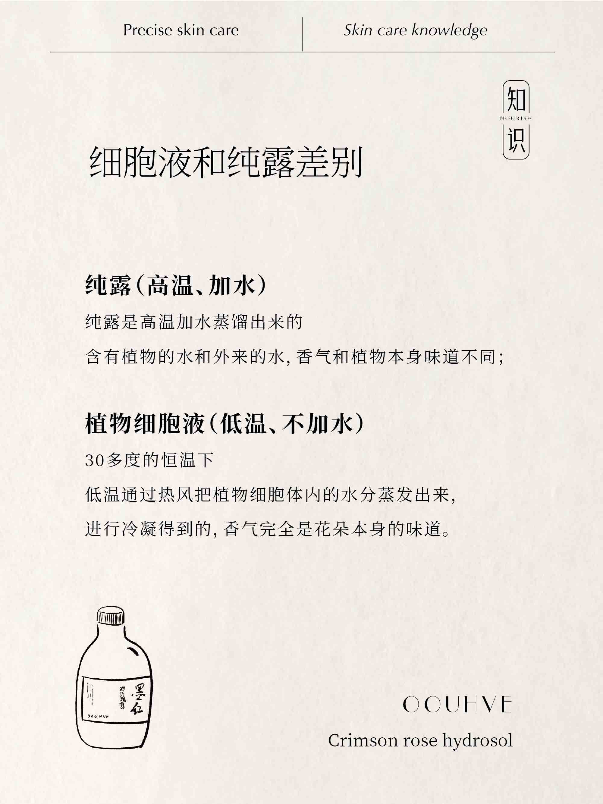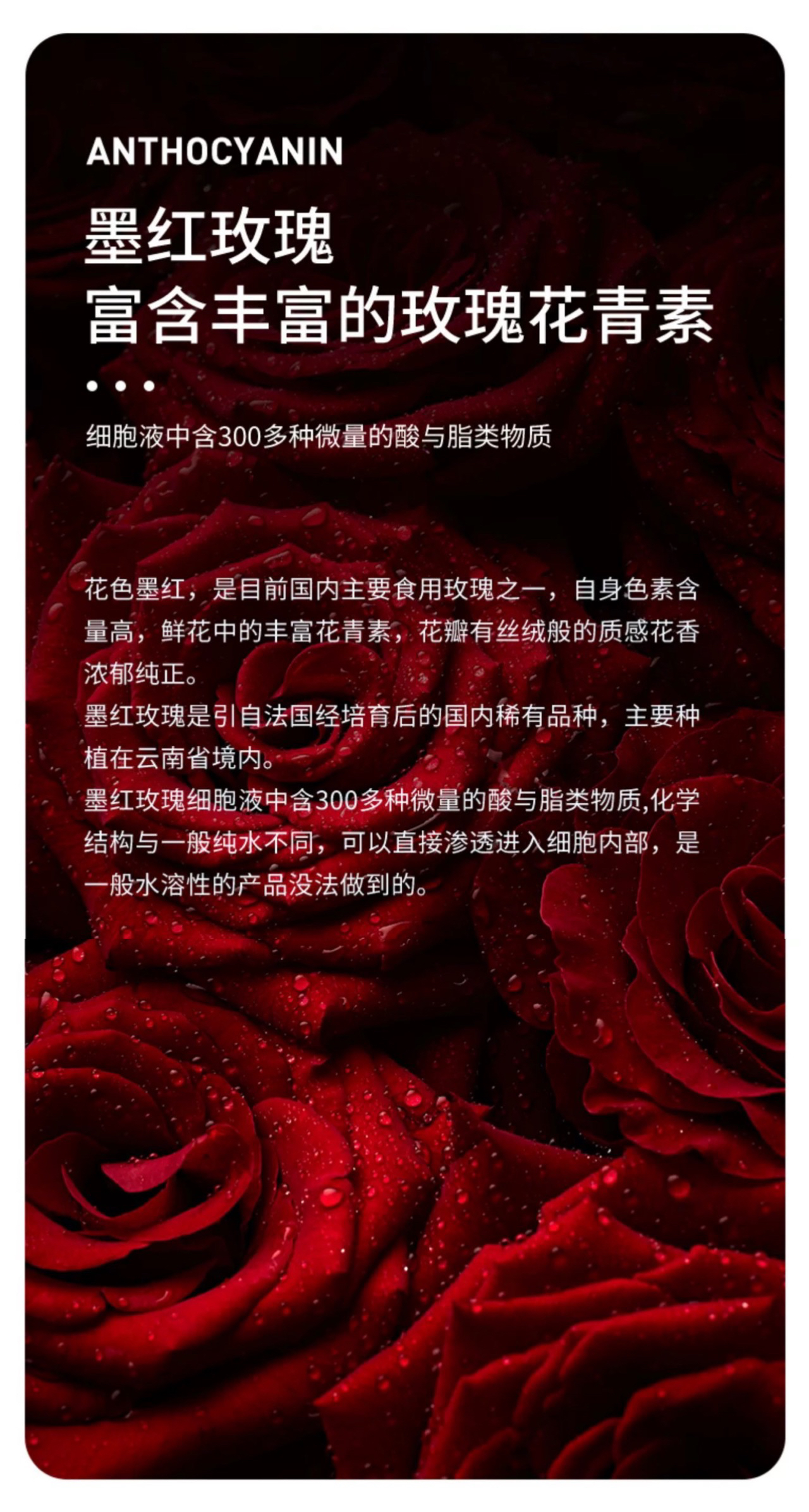 采用来自法国的墨红玫瑰种子,在中国最适合种法国墨红玫瑰的云南玉溪种植,约1000朵玫瑰的水润力量诞生了1瓶可以喝的细胞液。