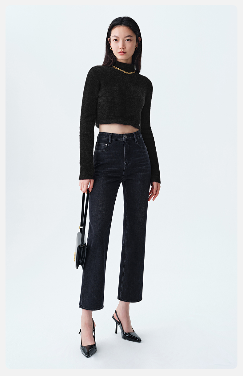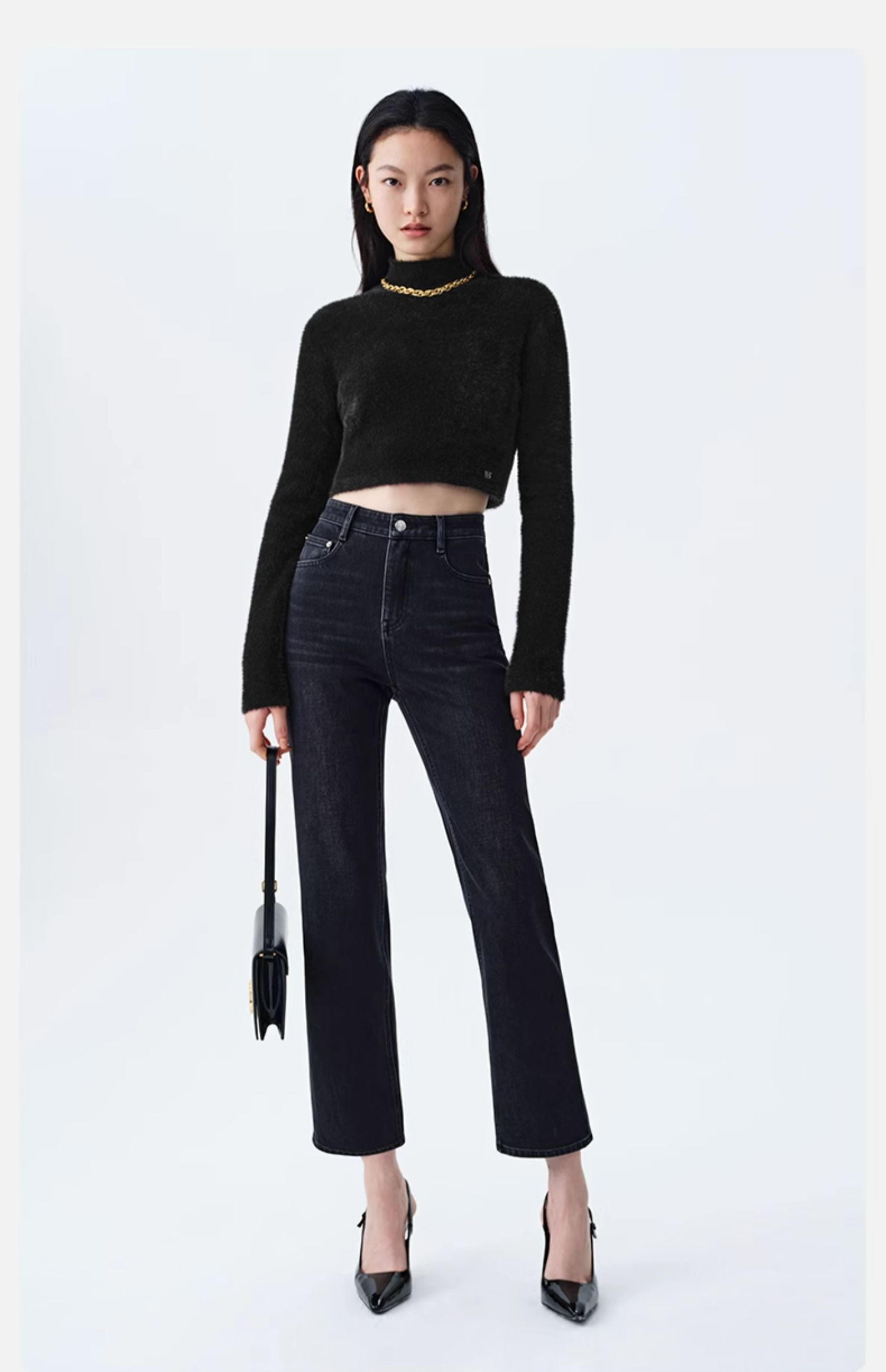 【八分威化裤】simplepieces秋新款SPS牛仔裤女黑色大翻边阔腿裤